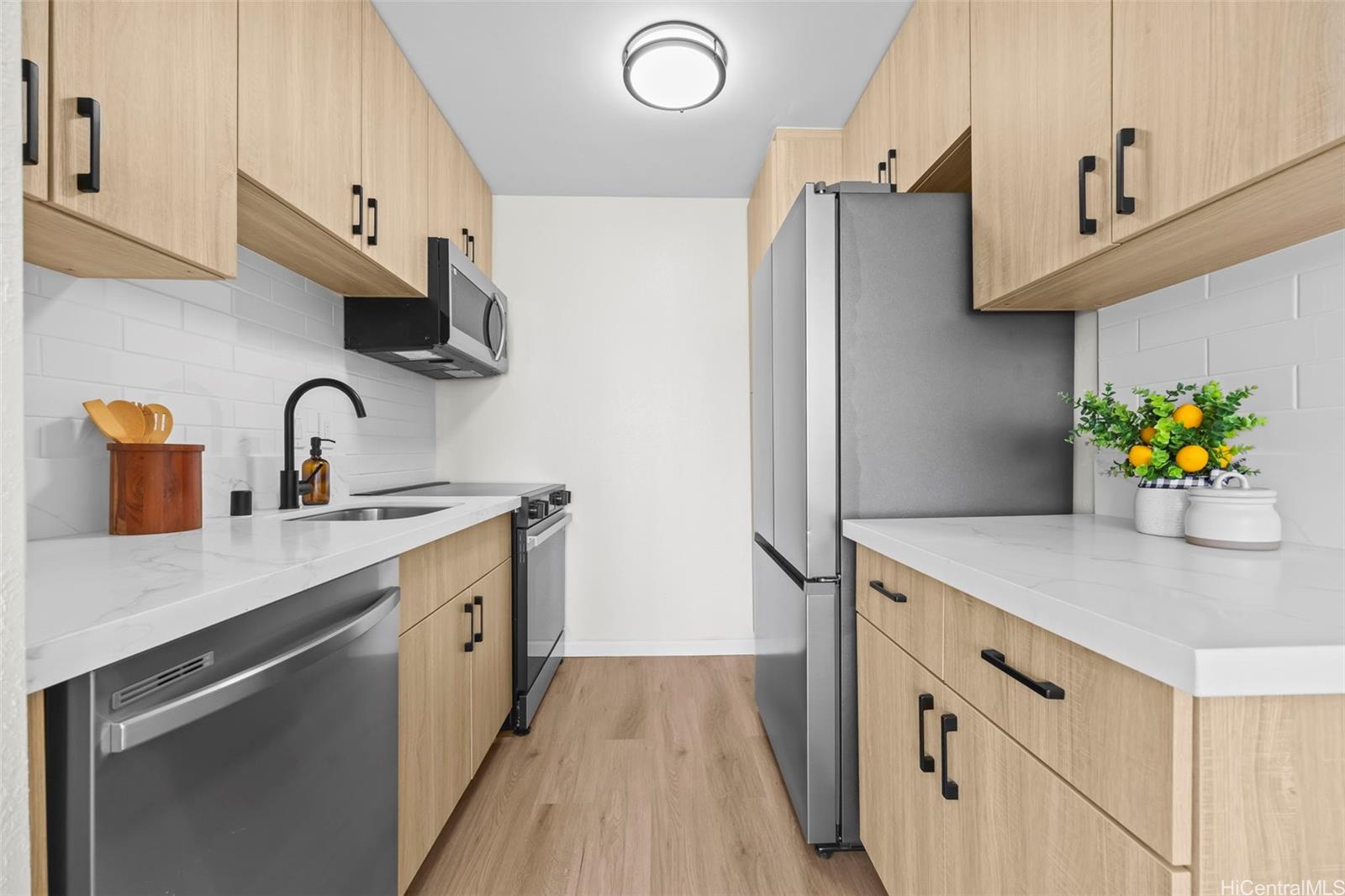 Move right into this beautifully renovated spacious 1-bedroom, 1-bathroom condo at La Casa in the heart of Waikiki, offering nearly 600 sq. ft. of modern living space and a spacious 100+ sq. ft. balcony with breathtaking ocean, city, and mountain views. Every detail has been thoughtfully remodeled, from the kitchen and bathroom to the bedroom and living areas. The unit features luxury vinyl flooring, freshly painted walls, sleek kitchen finishes with brand-new appliances, a contemporary bathroom, modernized bedroom elements, and stylish new light fixtures throughout. This turnkey condo perfectly combines comfort and style, ready for you to move in and enjoy. Additional conveniences include an in-unit washer/dryer and one secure garage parking stall. La Casa amenities include secure guest parking stalls, an on-site manager, trash chute, car wash area, loading zone, and a rooftop deck perfect for panoramic sunsets and ocean views. This building is VA-approved and pet-friendly, as well as steps from Ritz-Carlton, Cafes, Luxury Row, Hilton Lagoon, Beaches and the Best Restaurants Waikiki can offer. Don’t miss this opportunity—schedule your private showing today! Vacant & Easy to Show!