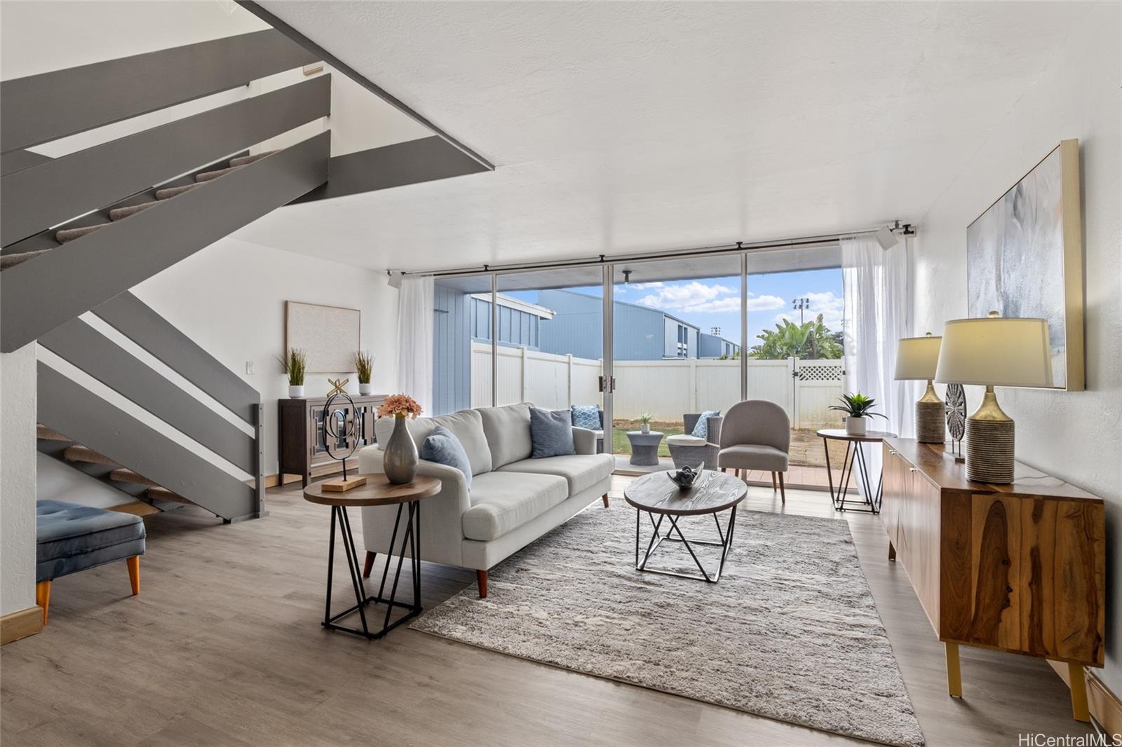 This is Living! and your opportunity to live and own in the highly desirable Laulea Town Houses. This spacious 3 bed, 2.5 bath townhome has over 1,400 square feet with a remodeled kitchen, new vinyl plank flooring and more! This home offers modern style, smart flow, and a prime Mililani location. Literally steps from Kipapa Elementary School and nearby parks makes this perfect for families and outdoor enthusiasts. The bright open living and kitchen area boasts stainless steel appliances and seamlessly flows out to a spacious fenced outdoor space that’s ideal for entertaining, play, or pets. 2 parking stalls (1 covered) and quick access to shopping, schools, restaurants, Freeway and Schofield. This home is priced to sell and schedule your showing today!