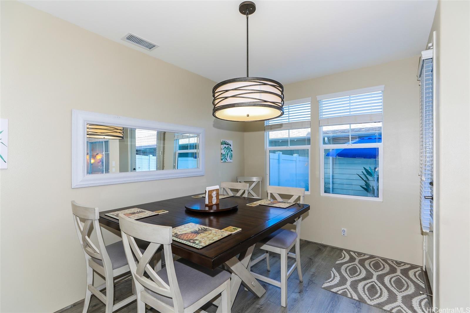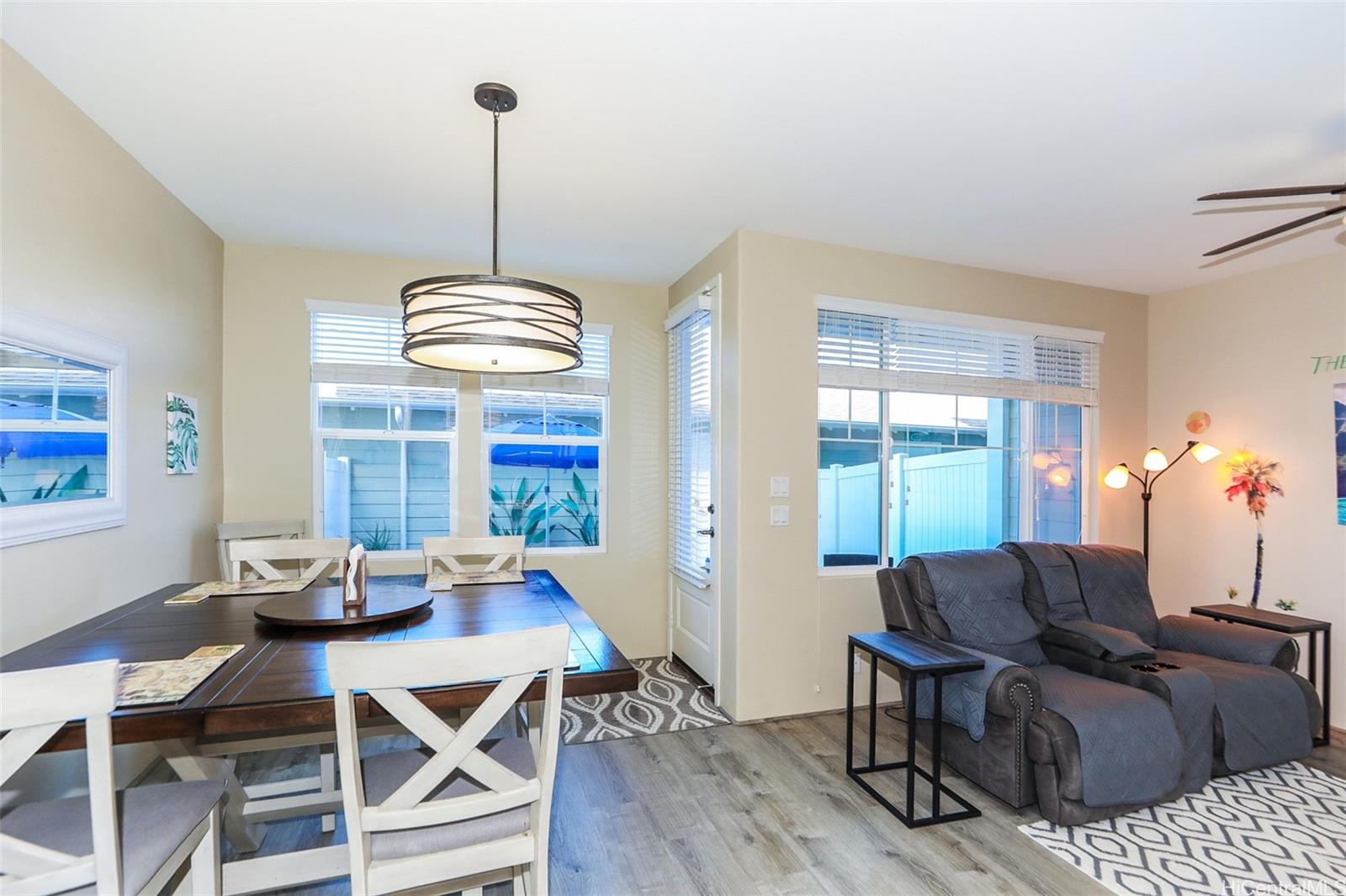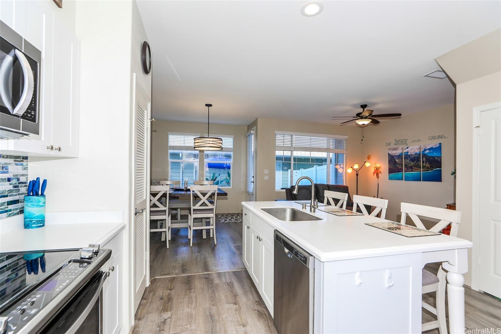Welcome to resort-style living in Lei Pauku at Hoakalei! This 3-bed, 3 full bath townhome offers 9-ft ceilings and natural light throughout. Laminate flooring throughout the home. Bright kitchen with large island, ample cabinetry, and stainless steel appliances. Enjoy a small low maintenance pavered private backyard. Laundry room and two large separated main suites are on the second level and one bedroom and full bath on lower level. Has a large detached 2-car garage with keypad entrance. Residents have exclusive access to the Wai Kai Hale Club with a private lagoon for paddling, kayaking, or just relaxing on the beach chairs! Entire Complex exterior will be repainted in 2027, lanai was resurfaced 10/25, Brand New Water Heater installed Feb 2026, New refrigerator June 2025, newer Microwave (2024). It is right down the street from the Wai Kai wave pool. HOA includes: cable, internet, and home phone, water/sewer, trash, Wai Kai Hale access, all exterior Care of the home and more!