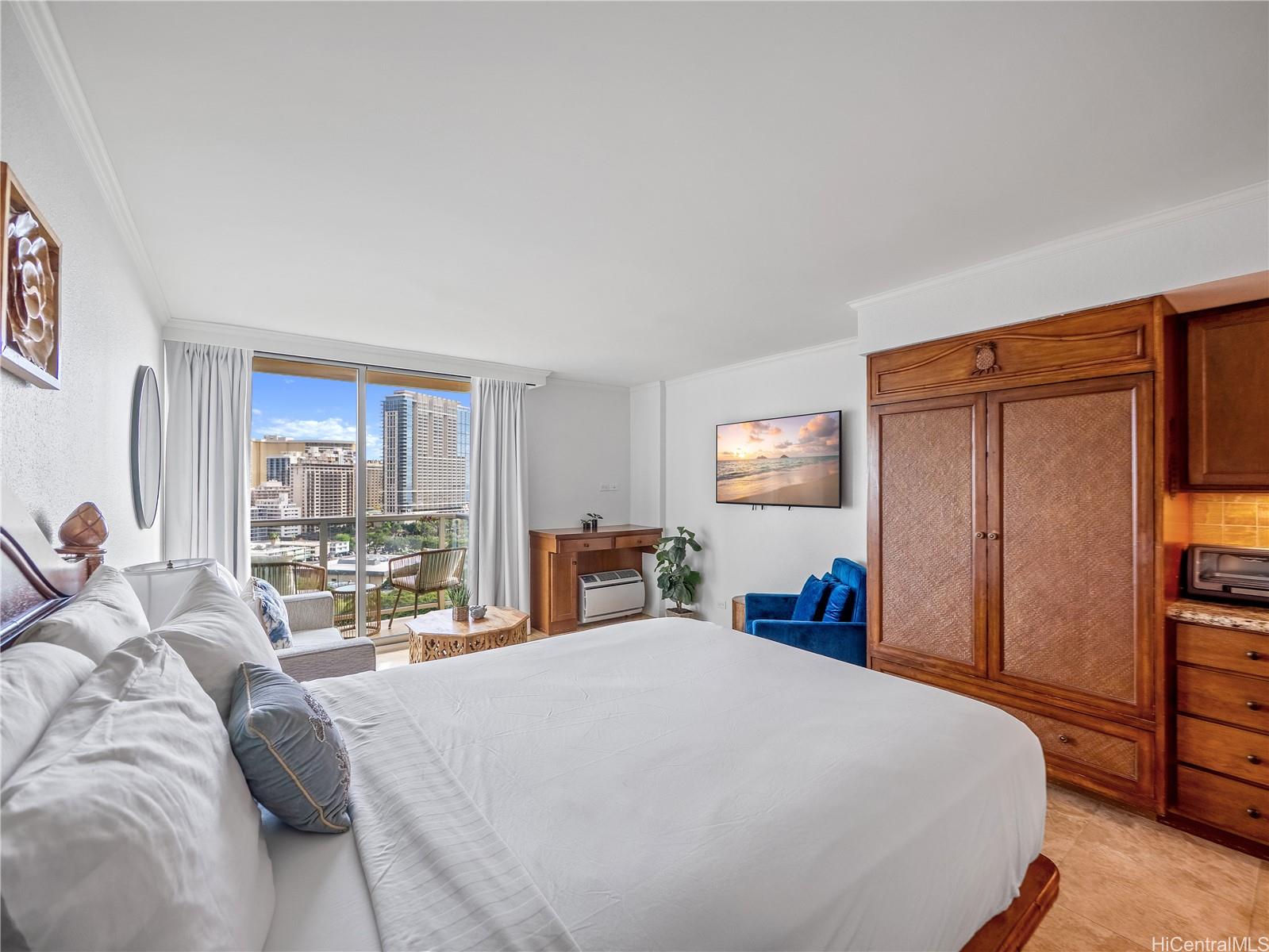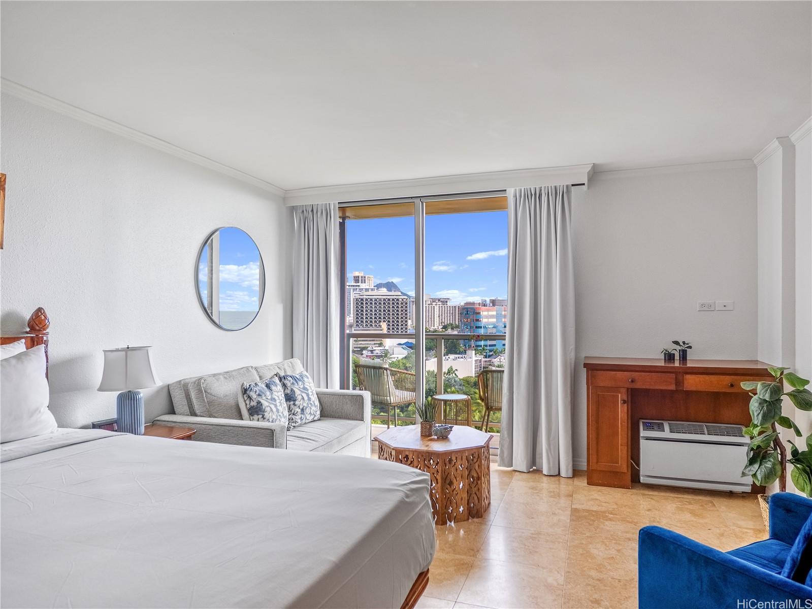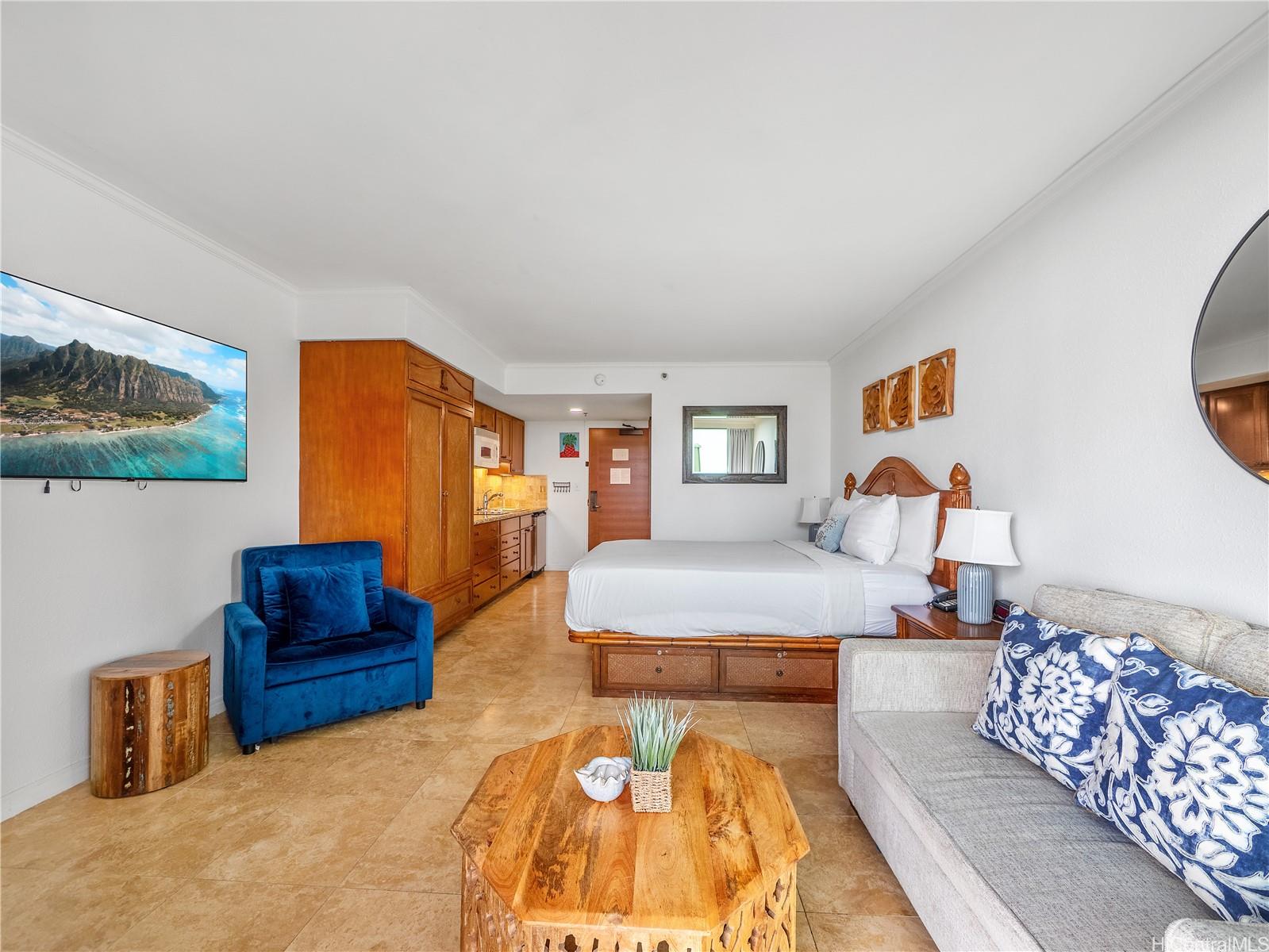 Exceptionally rare high-floor ocean-view studio in Luana Waikiki; the desirable 09 stack features unobstructed ocean views and a broad overlook of Fort DeRussy Park. From your private lanai, take in the signature park-to-ocean scenery and enjoy Waikiki’s popular Friday night fireworks.This furnished studio offers a smart layout with a queen bed and sofa sleeper, plus a convenient kitchenette equipped with a cooktop, mini refrigerator, and microwave; ideal for light meals and extended stays. Enjoy hotel-style amenities including a swimming pool, BBQ area, and fitness center/gym, all in a prime Waikiki location near beaches, dining, and shopping. A newly announced luau experience nearby is anticipated to enhance the area’s resort-style appeal. Rare opportunity to own a standout Luana Waikiki ocean-view studio with Fort DeRussy Park views and a lanai.