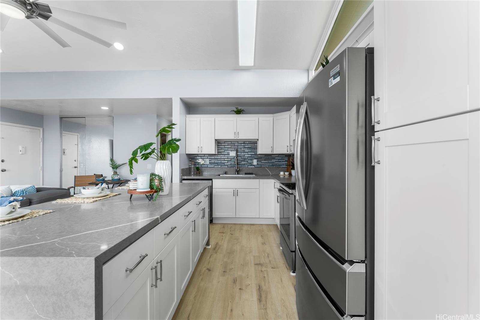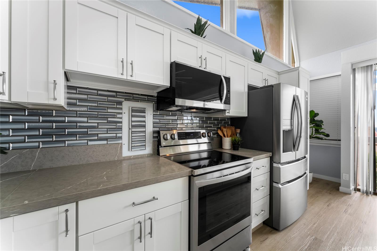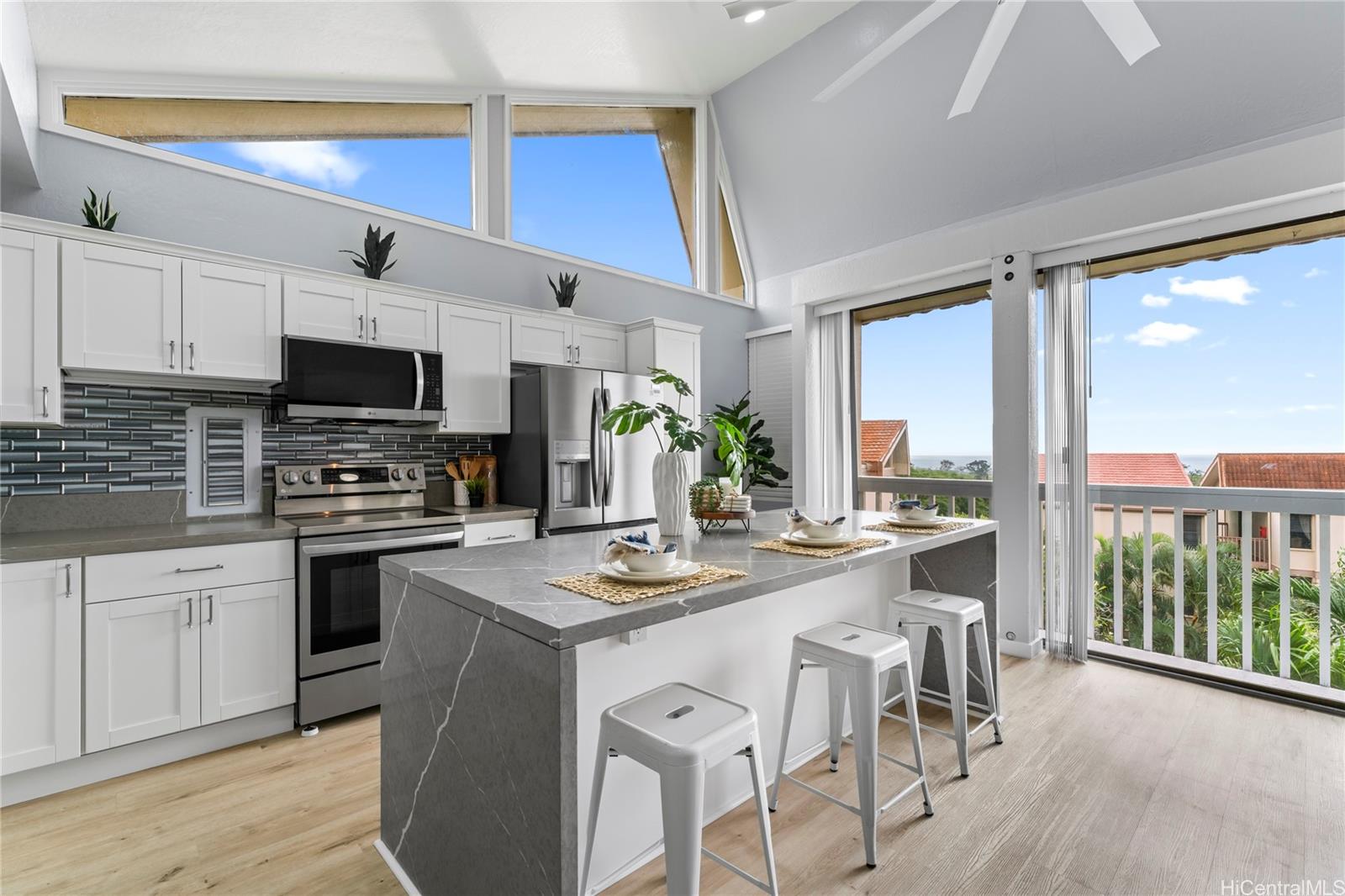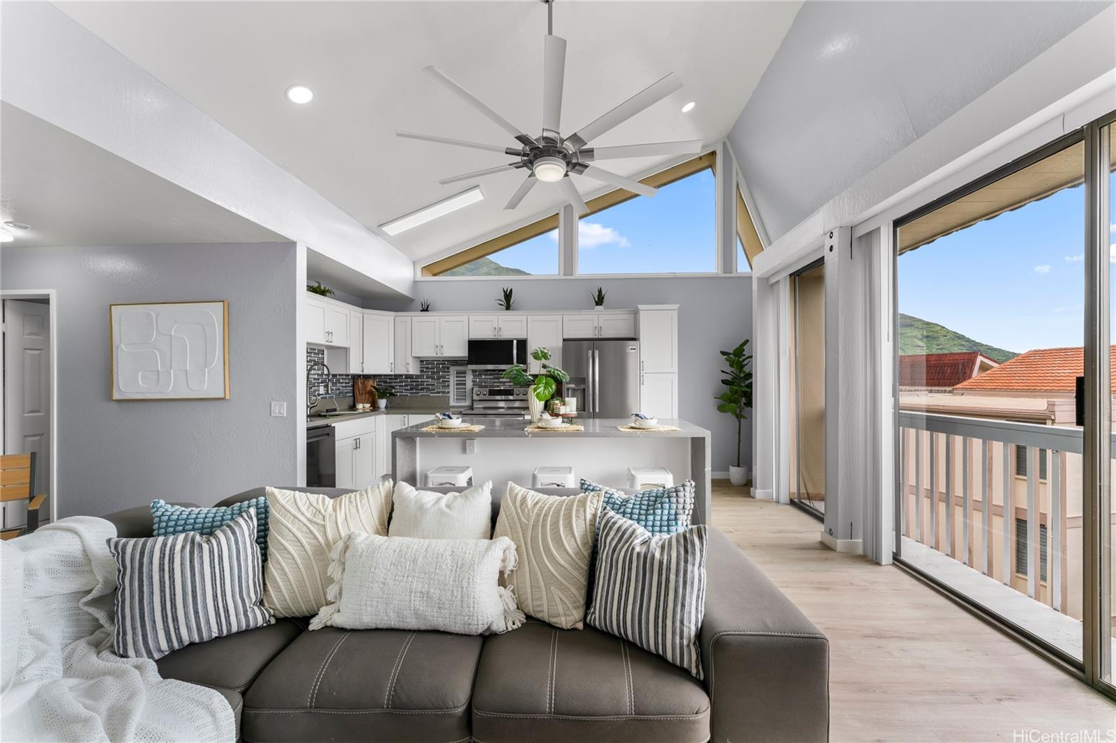Step into your island dream with this stunning, fully renovated turnkey home—a paradise waiting just for you! Featuring 2 bedrooms and 1 bathroom, this gem is the perfect launchpad for your first adventure in homeownership or a savvy investment with endless potential. Imagine waking up at the foot of majestic mountains, sipping coffee with tranquil ocean views right outside your doorstep—serenity and convenience, all in one. The kitchen dazzles with state-of-the-art shaker-style soft-close cabinets, sparkling quartz countertops, and a gorgeous waterfall island offering plenty of room for lively gatherings. Soaring ceilings and TWO lanais flood the space with light and salty breezes, while a designer ceiling fan and luxe vinyl plank floors make every moment bright and comfortable. The bathroom is a showstopper, featuring a glowing LED mirror and sleek, modern finishes. Picture yourself unwinding and soaking up panoramic vistas of mountains and ocean as your everyday backdrop. Just minutes from the golden sands of Makaha Beach, breathtaking hiking trails, and favorite local hotspots.