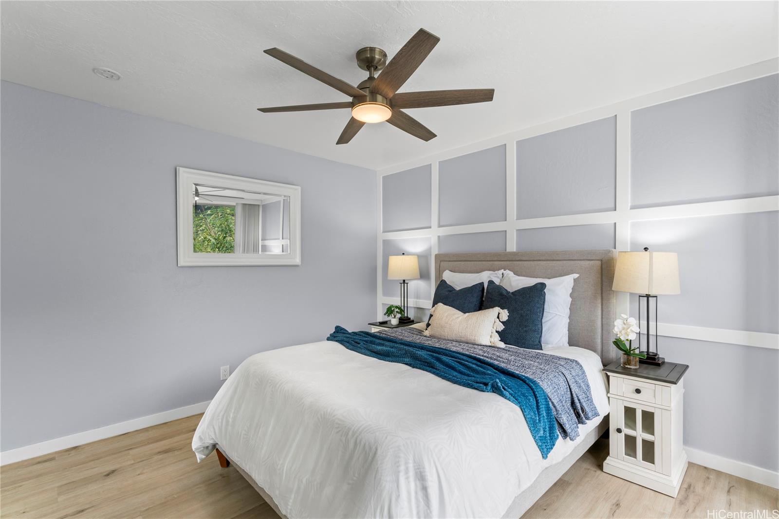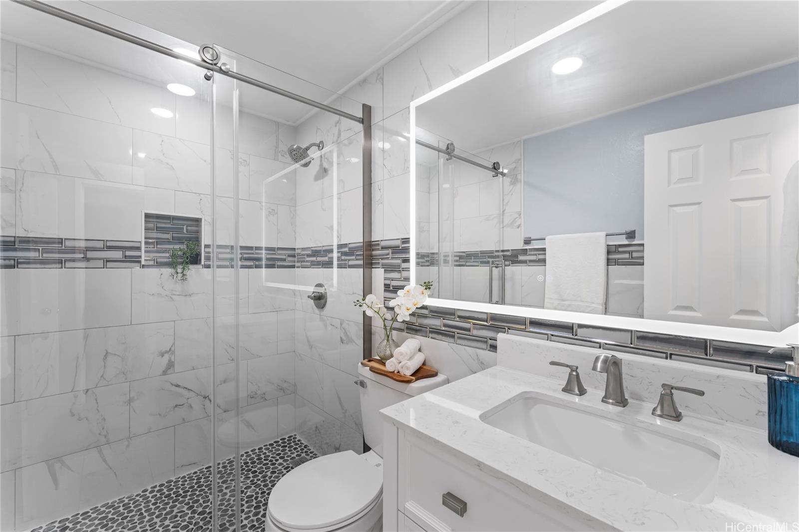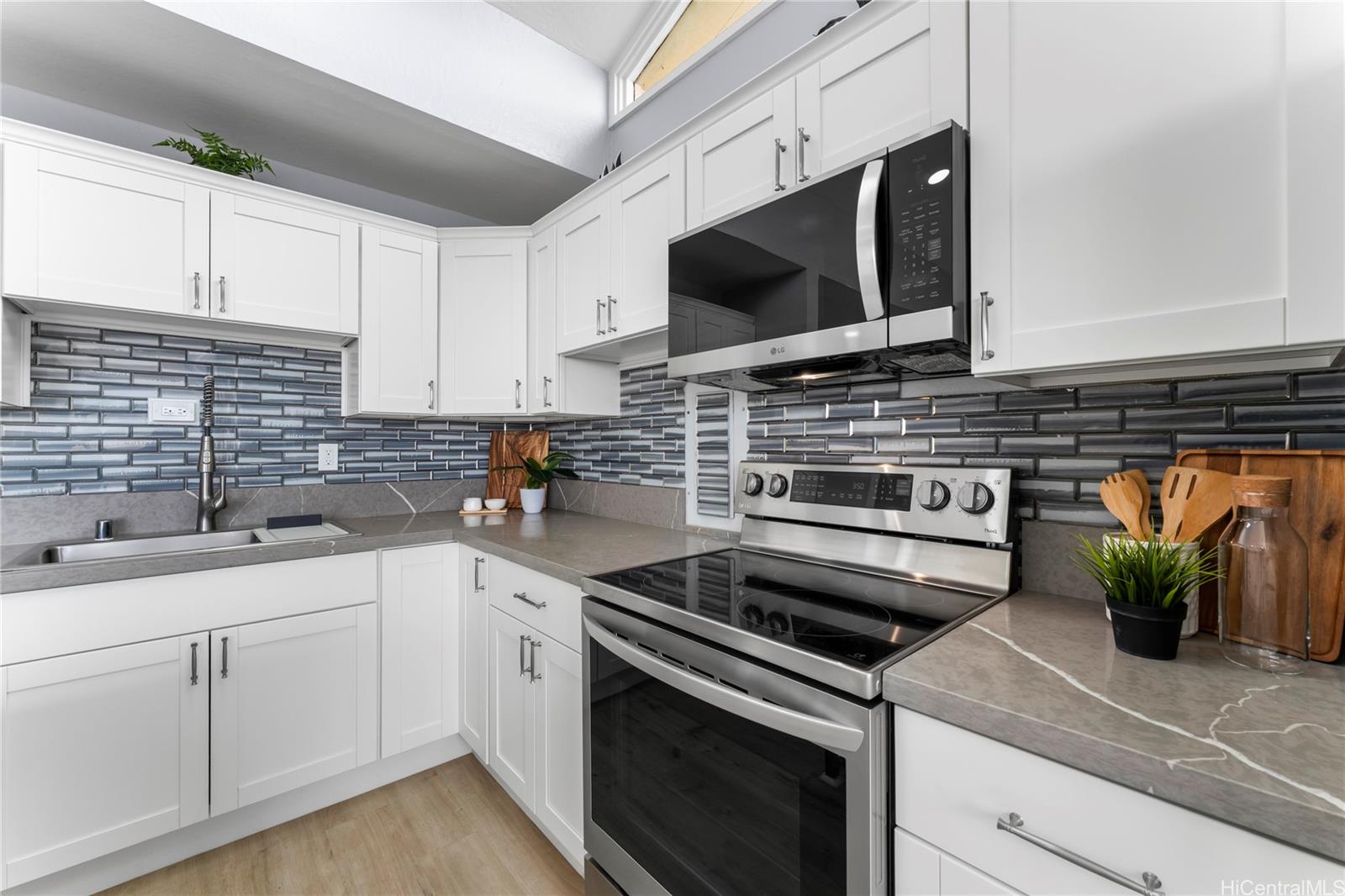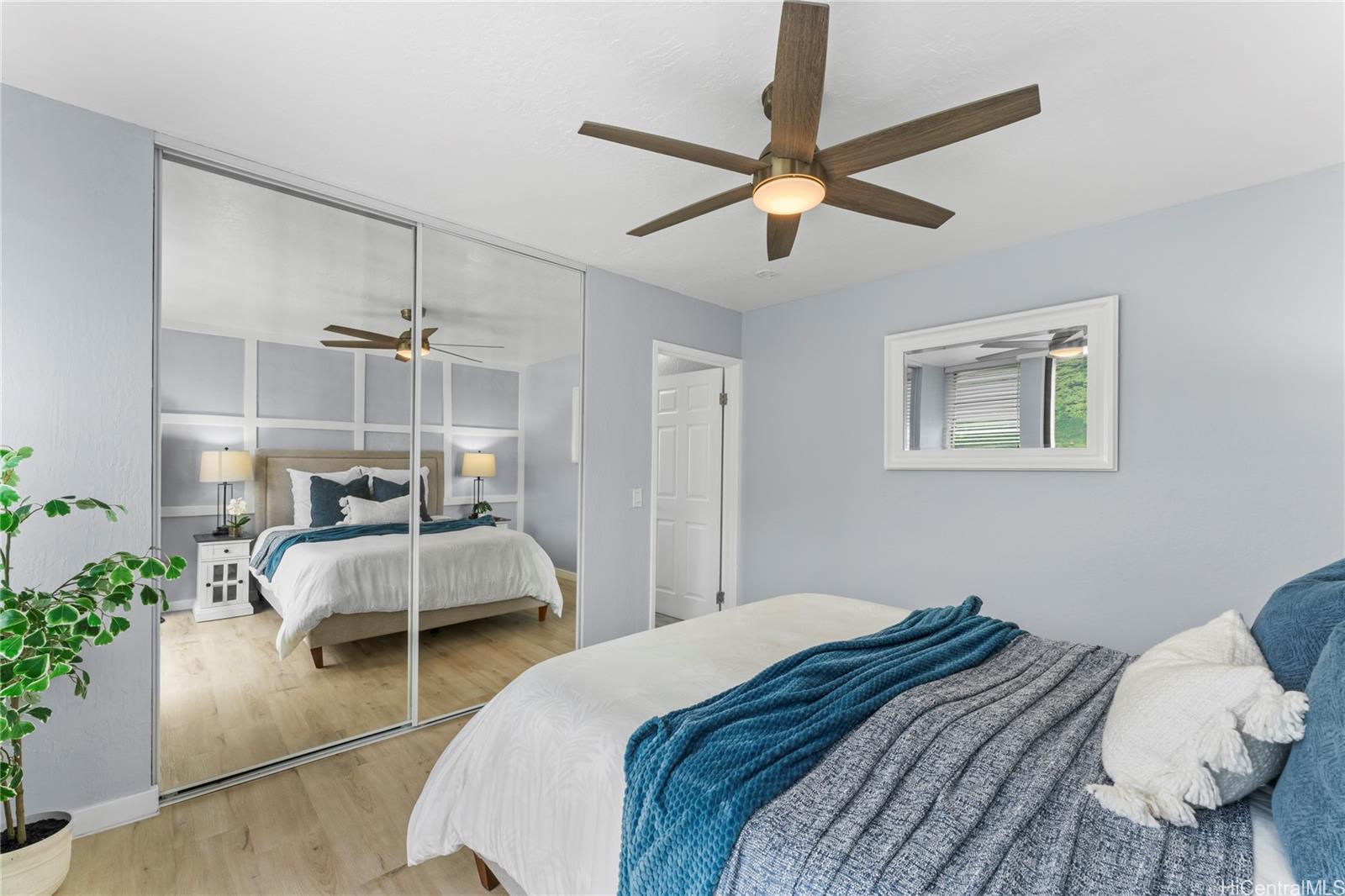 Step into your island dream with this stunning, fully renovated turnkey home—a paradise waiting just for you! Featuring 2 bedrooms and 1 bathroom, this gem is the perfect launchpad for your first adventure in homeownership or a savvy investment with endless potential. Imagine waking up at the foot of majestic mountains, sipping coffee with tranquil ocean views right outside your doorstep—serenity and convenience, all in one. The kitchen dazzles with state-of-the-art shaker-style soft-close cabinets, sparkling quartz countertops, and a gorgeous waterfall island offering plenty of room for lively gatherings. Soaring ceilings and TWO lanais flood the space with light and salty breezes, while a designer ceiling fan and luxe vinyl plank floors make every moment bright and comfortable. The bathroom is a showstopper, featuring a glowing LED mirror and sleek, modern finishes. Picture yourself unwinding and soaking up panoramic vistas of mountains and ocean as your everyday backdrop. Just minutes from the golden sands of Makaha Beach, breathtaking hiking trails, and favorite local hotspots.