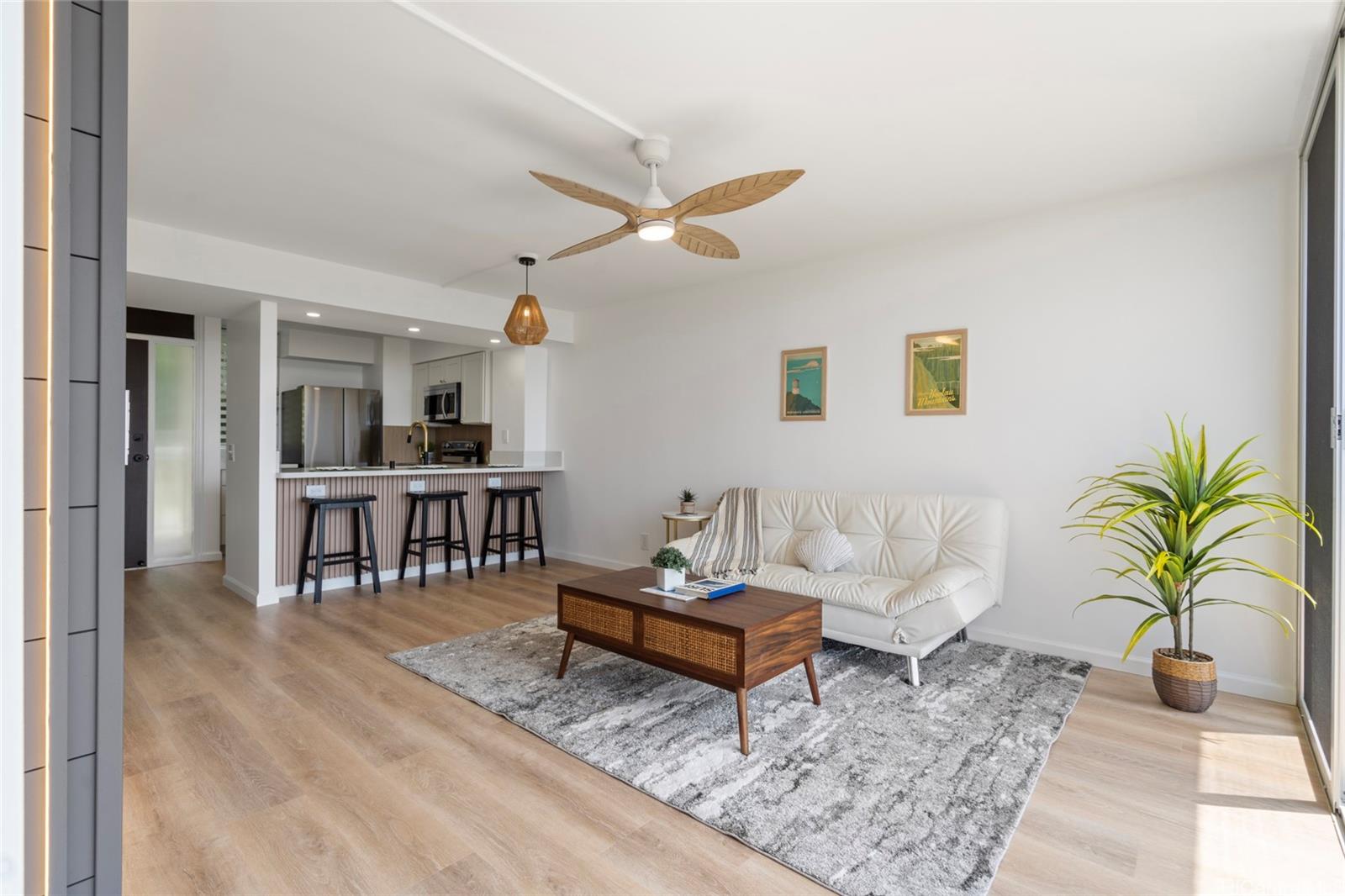 Truly the Best Value in Makaha! With modern upgrades and breathtaking views of the vibrant blue ocean and lush green mountains, you get the best of both worlds. The upgraded kitchen features stainless steel appliances and quartz countertops. Luxury vinyl floors extend throughout, while the bedroom boasts brand-new carpet. The bedroom effortlessly flows into a spacious closet area with ample storage space. Enjoy your favorite movies with a remote controlled backlit wall for the perfect ambiance. The large bathroom comes complete with a linen closet, defogging, LED lit mirror, and quartz counter tops tying it into the kitchen. Floor-to-ceiling sliding glass doors invite an abundance of natural light, illuminating the entire space. With stunning views of the ocean, valley, and beautifully maintained grounds, you’ll feel like you’re on vacation—just one mile from the beach. Perfect for seasonal use or investment income. Ideal for snowbirds or remote workers. Hotel-style amenities: Landscaped grounds, 24/7 security, and ample parking.