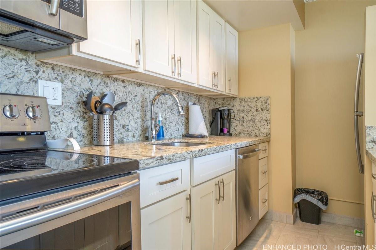 Upgraded Studio located on the 7th floor with unobstructed views of the Waianae Mountain range and Ocean view from lanai. Subject unit boasts an open living room and dining room with upgrades such as Quartz Counter Tops, Murphy Bed, Ceramic Tile Flooring throughout unit, White Wood Shaker Cabinets, Floor to Ceiling windows, and more. Makaha Valley Townhomes offers a community swimming pool, 24-hour security for added privacy. The unit is located within minutes to the world-renowned Makaha Beach, host to some of the world’s most mesmerizing sunsets.