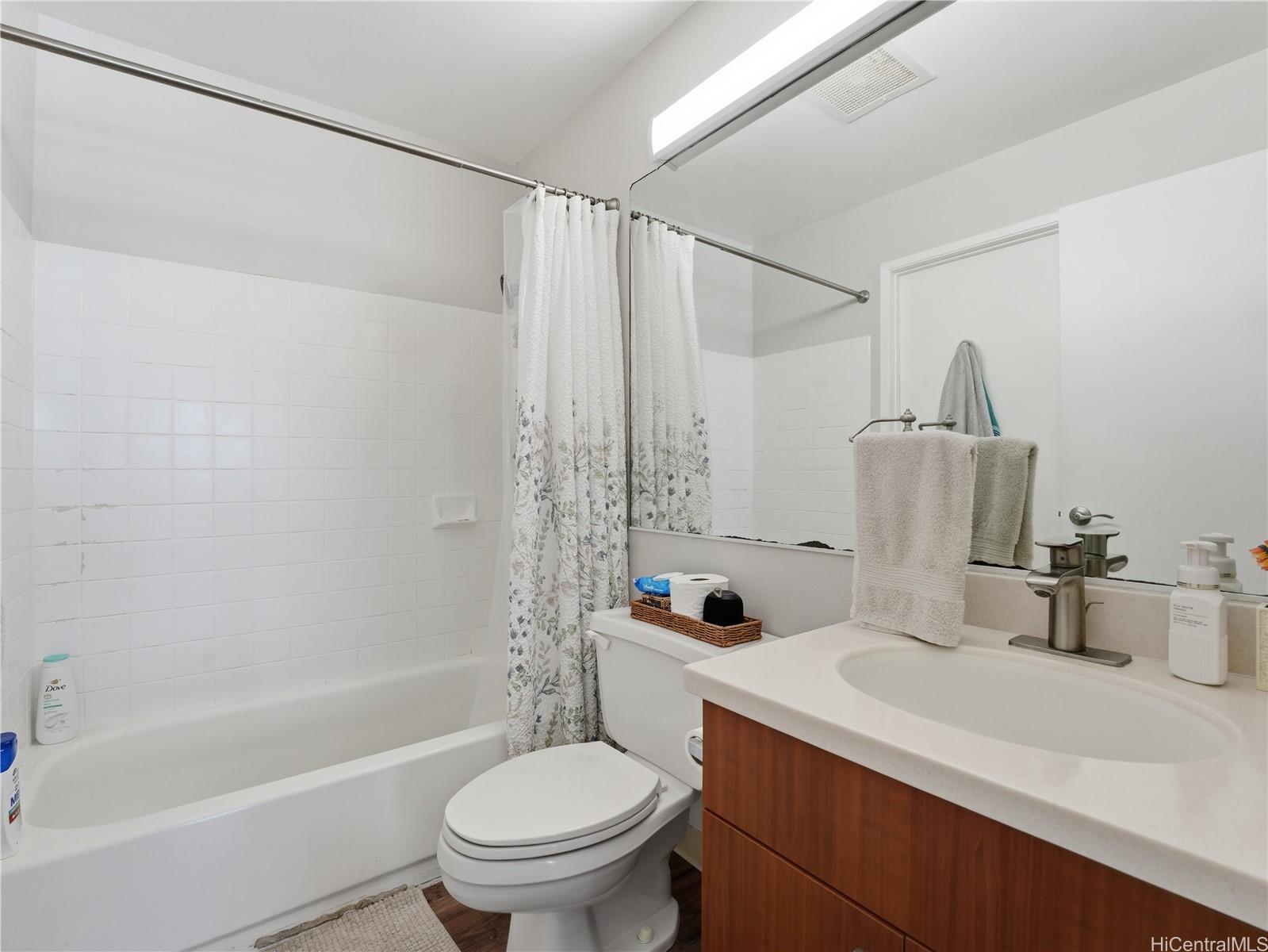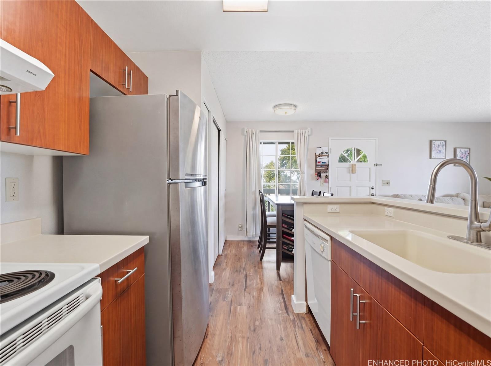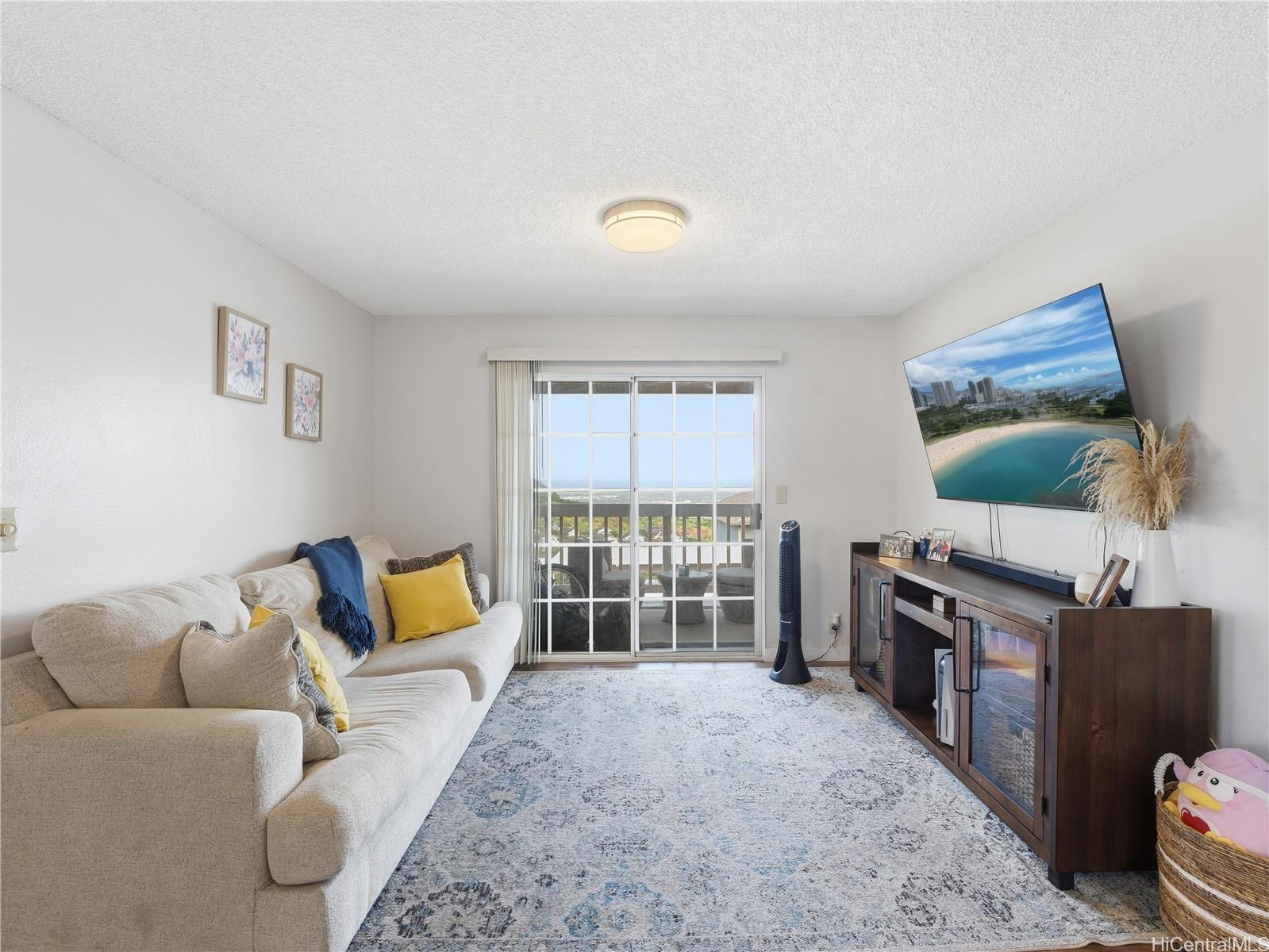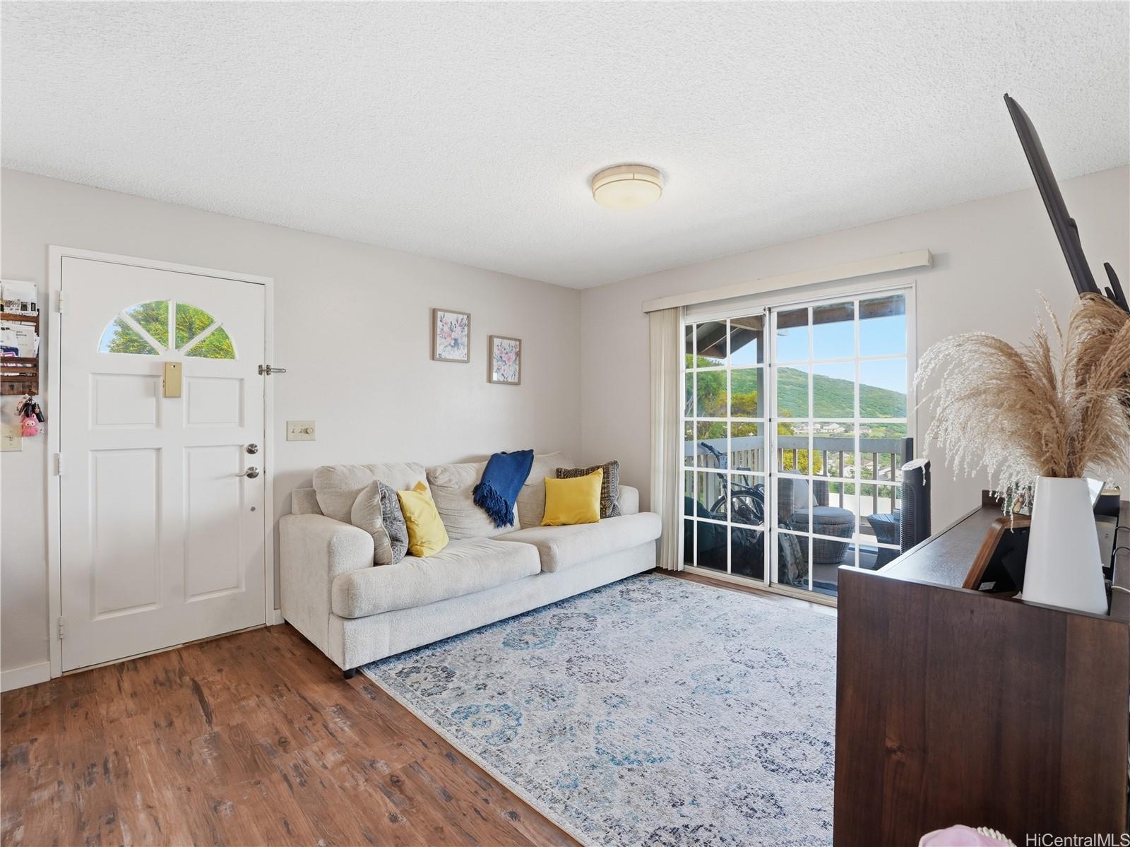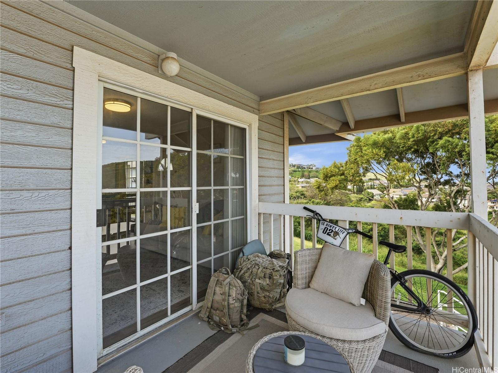 LOCATION, LOCATION, LOCATION in the highly sought-after Makakilo Cliffs community. This corner-end, top-floor 2-bedroom, 1.5-bath townhouse offers exceptional privacy, refreshing breezes, and panoramic views that captivate from the moment you step inside. Own a piece of paradise. Boasting 756 square feet of thoughtfully designed living space, this desirable residence features a spacious, open floor plan with ample storage and cabinetry throughout. The kitchen and bathrooms (completed in 2017–2018) showcase modern upgrades including new laminate flooring, elegant Corian countertops, stylish new cabinets, and a new range. Step out onto your private covered balcony to soak in the stunning ocean and mountain views that make Hawaii living truly special. The building’s enviable position on a quiet corner lot places it on the cooler, breezier side of the complex, surrounded by mature trees and an open grassy area—creating a peaceful, private retreat. Additional highlights include: In-unit washer and dryer for ultimate convenience. This rare combination of prime location, privacy, natural ventilation, and recent high-quality renovations makes this townhouse an outstanding opportunity.