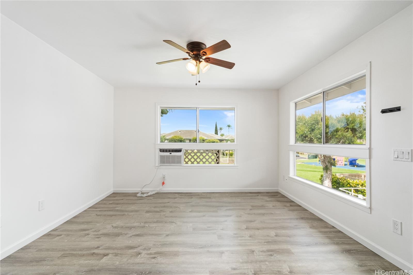 Renovated and freshly painted 2/1 corner unit near the grassy area and park. Includes vinyl plank flooring, updated kitchen, and appliances. The open floor plan includes a dining area and a main living room. This unit has a fully enclosed courtyard and covered lanai area with a full-sized washer and dryer. Maintenance fees include water. Rooms have window AC units. Close to schools, bus lines, rail, shopping, and entertainment. It is located near Kapolei Golf Course & UH West Oahu. Malanai Iki residents have access to the Villages of Kapolei community pool & recreation center as part of the Association membership.