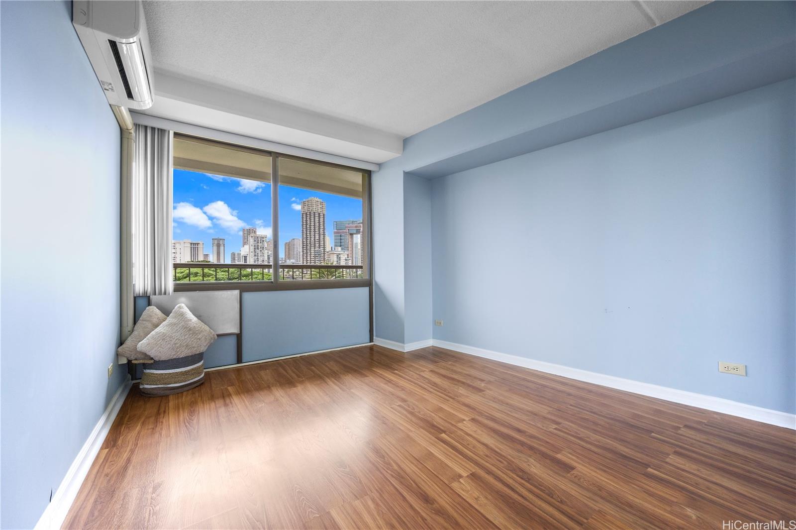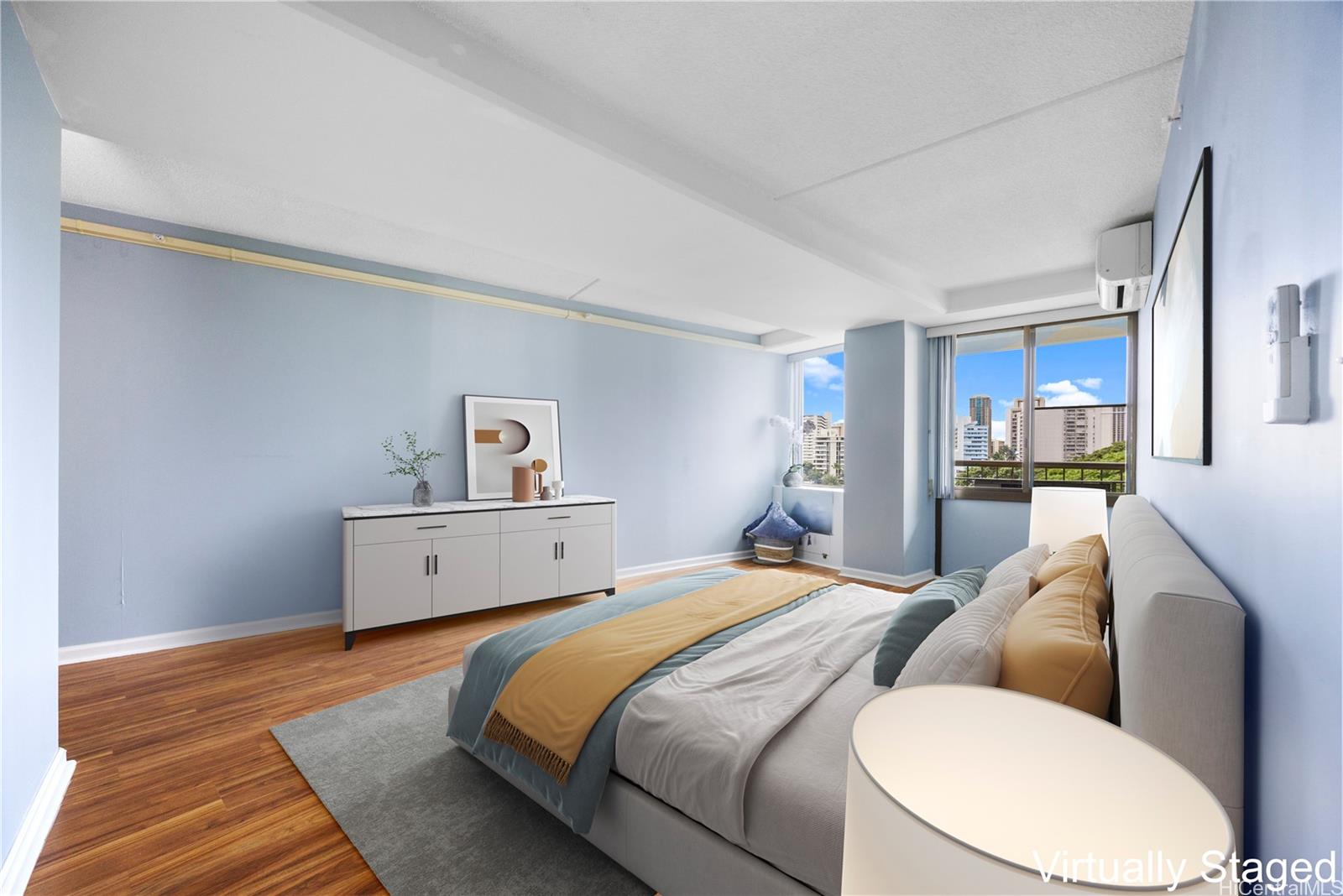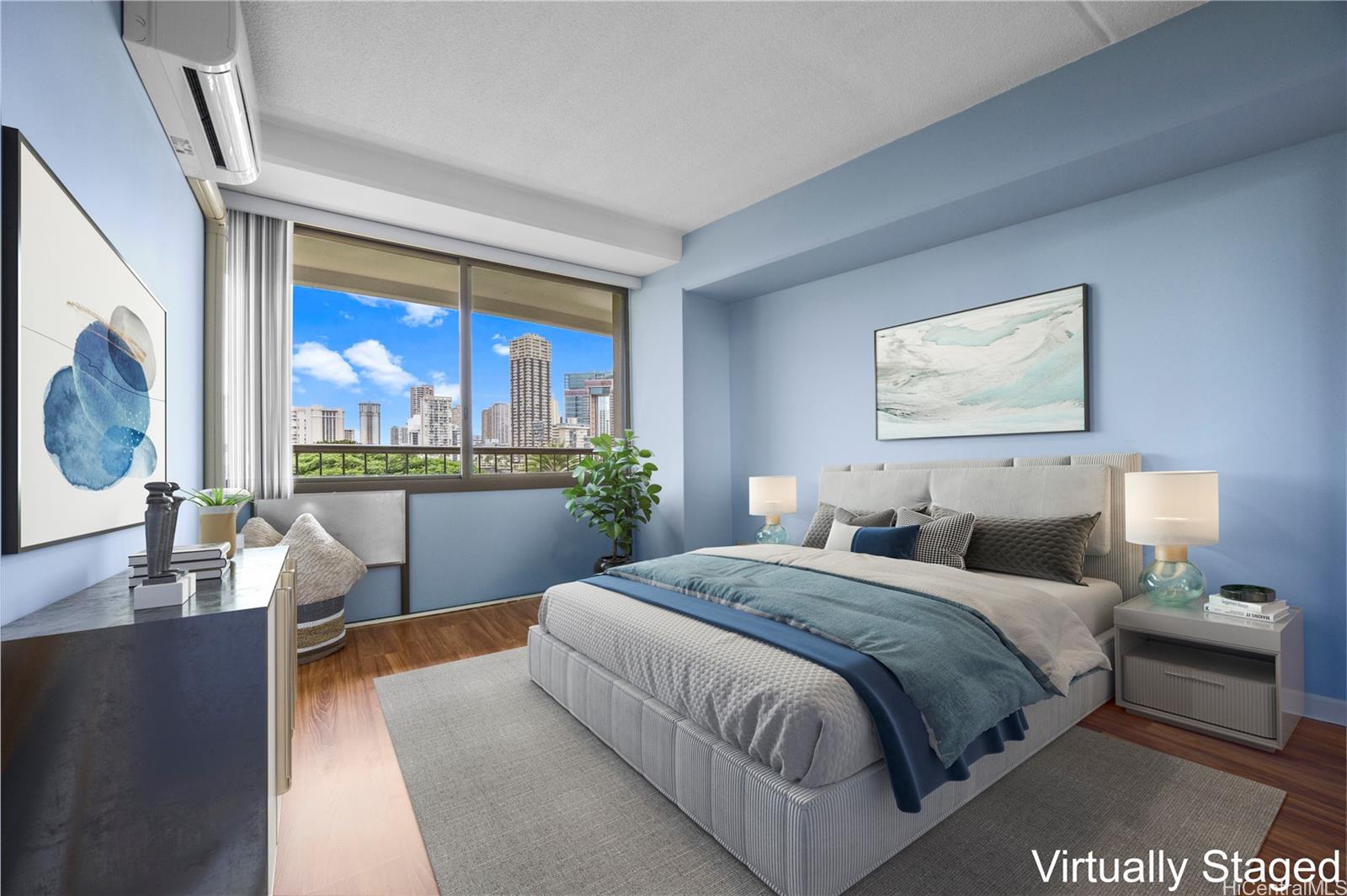 Beautiful lush tree top garden views from this spacious fee simple 2 bedroom. 2 bathroom with covered assigned parking. This rarely available unit features a large primary bedroom, luxury vinyl flooring, split air conditioning in both bedrooms, in-unit washer/dryer and walk-in shower. Enjoy the 135 sq ft lanai with ample room for relaxing and entertaining.Excellent location on park setting with tropical grounds, close to famous Waikiki beaches, Ala Moana Shopping Center, restaurants and the University of Hawaii. The well maintained Marco Polo offers resort-like amenities which include a wonderful swimming pool, sauna, tennis, basketball/pickleball courts, BBQ, golf driving nets, a convenience store in the lobby, car wash area, ample guest parking, storage, 24 hour security,100% Hurricane Coverage with reasonable monthly maintenance fees. The sprinkler/fire PA alarm system has been completed throughout building. The bathroom plumbing project was recently completed. Photos have been enhanced.