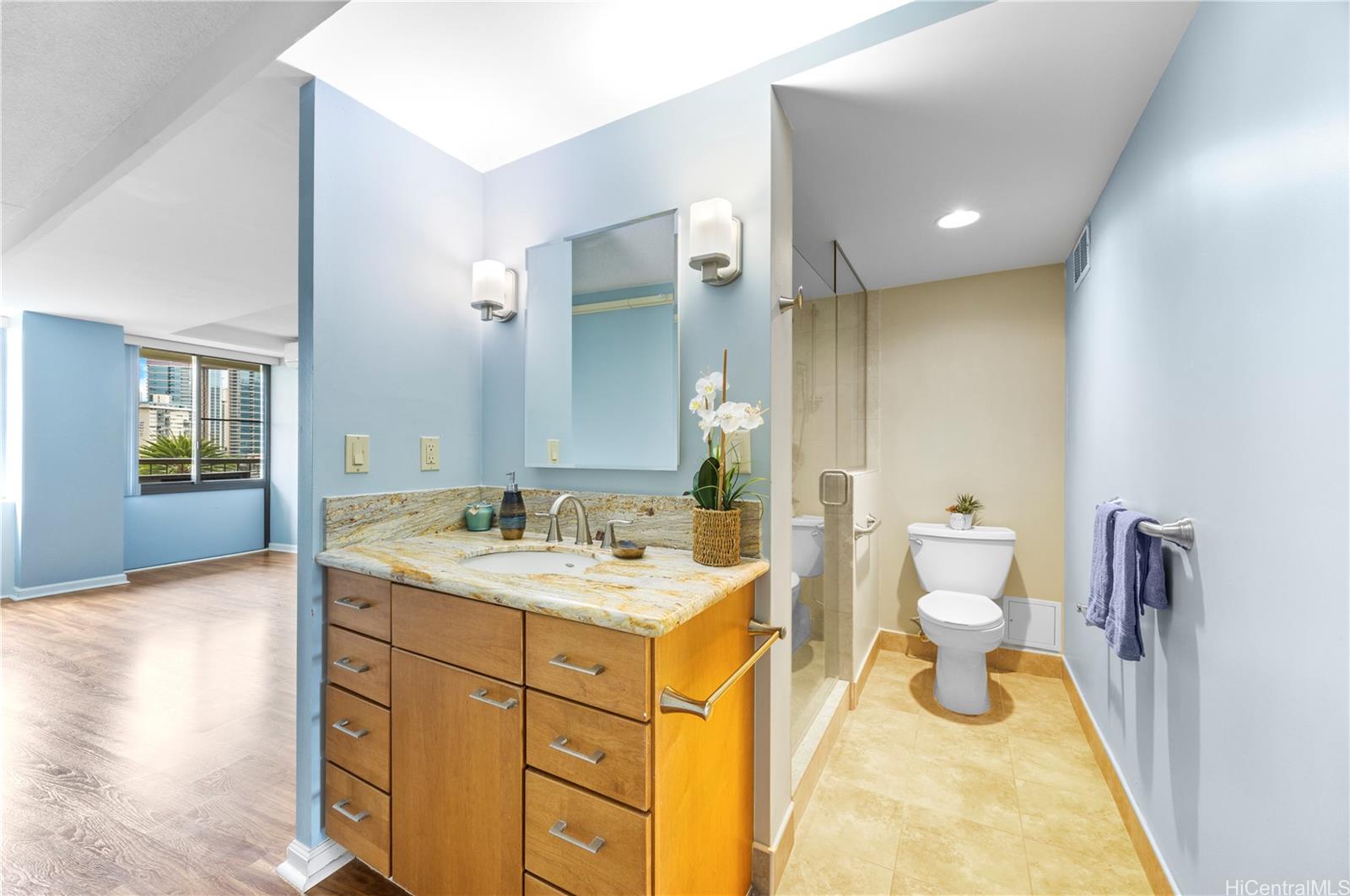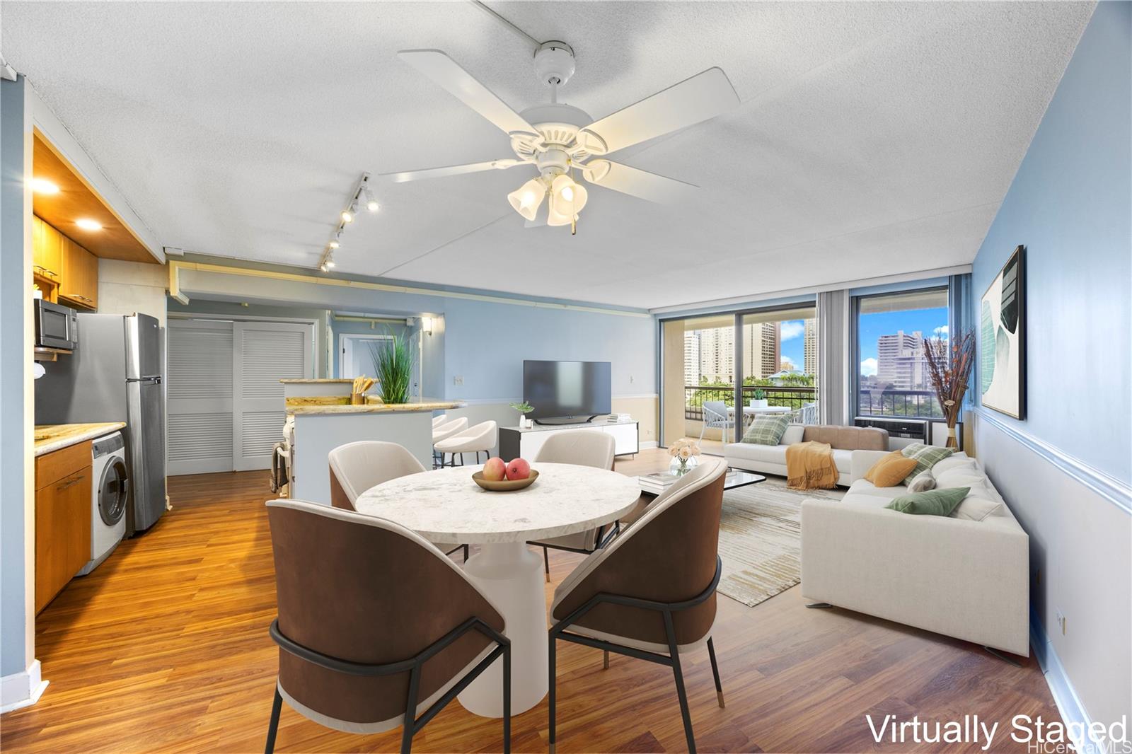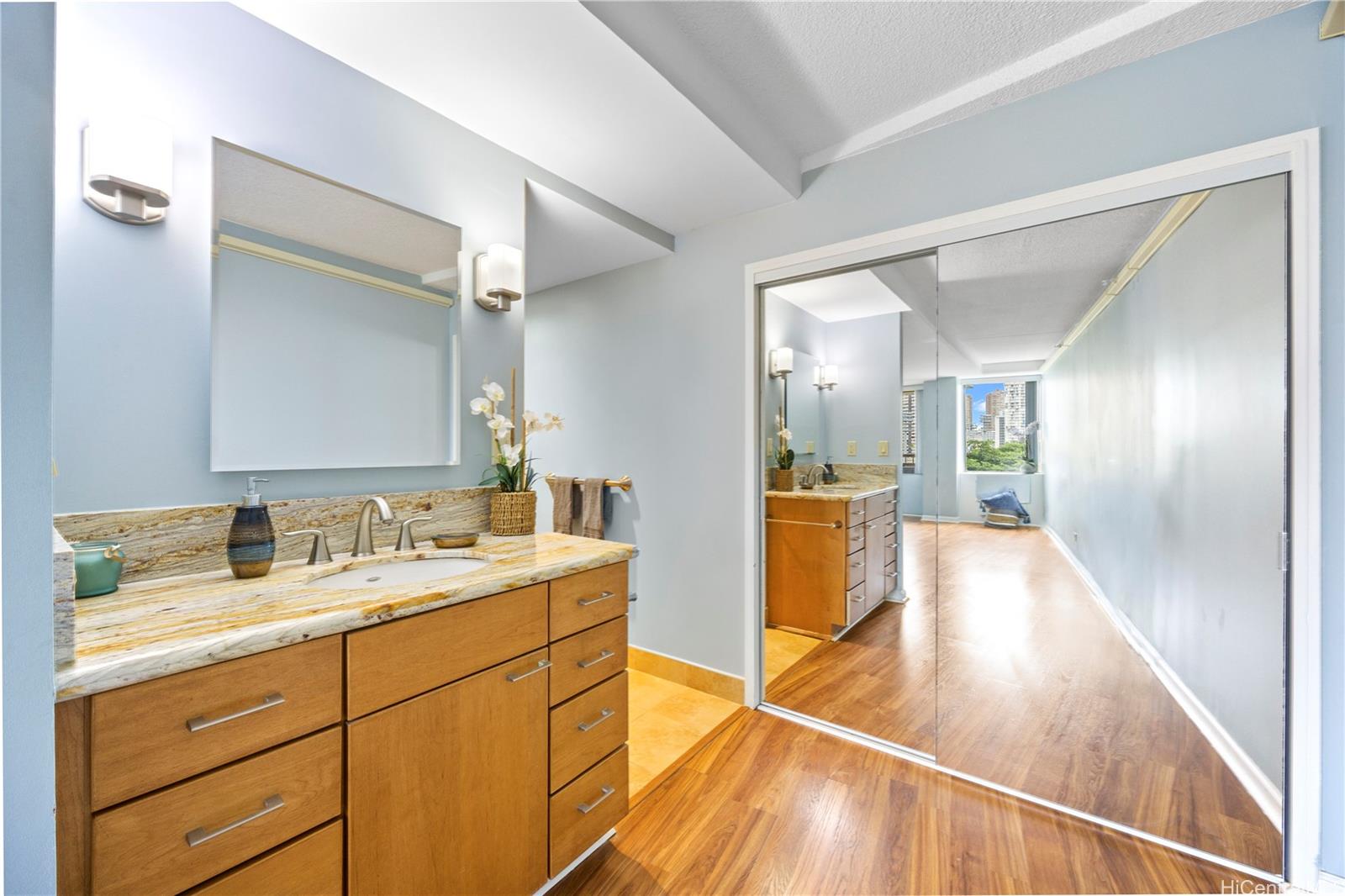 Beautiful lush tree top garden views from this spacious fee simple 2 bedroom. 2 bathroom with covered assigned parking. This rarely available unit features a large primary bedroom, luxury vinyl flooring, split air conditioning in both bedrooms, in-unit washer/dryer and walk-in shower. Enjoy the 135 sq ft lanai with ample room for relaxing and entertaining.Excellent location on park setting with tropical grounds, close to famous Waikiki beaches, Ala Moana Shopping Center, restaurants and the University of Hawaii. The well maintained Marco Polo offers resort-like amenities which include a wonderful swimming pool, sauna, tennis, basketball/pickleball courts, BBQ, golf driving nets, a convenience store in the lobby, car wash area, ample guest parking, storage, 24 hour security,100% Hurricane Coverage with reasonable monthly maintenance fees. The sprinkler/fire PA alarm system has been completed throughout building. The bathroom plumbing project was recently completed. Photos have been enhanced.