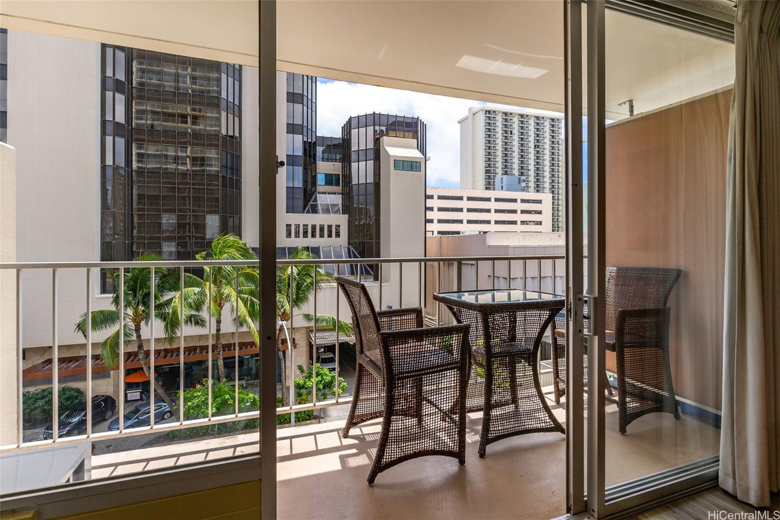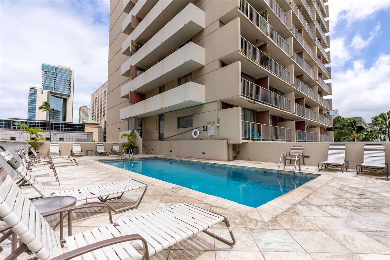 Amazing price for this legal short-term rental. A turn-key opportunity, ideally located right in the heart of Waikiki. This property is a gem for those looking to soak in the ambiance of a vacation stay at a world-class location, with renowned Waikiki Beach, diverse shopping experiences, and an array of amenities all within easy reach. This upgraded sleek and modern studio unit has both a cozy and versatile layout. The kitchen is a standout with its recent enhancements, featuring new cabinets and countertops along with the kitchen’s gold-patterned backsplash that injects a dose of elegance. Relax and take in the sights around you on the comfortably sized lanai. The unit comes with a secured, assigned parking stall, community laundry on each floor, and a building pool.