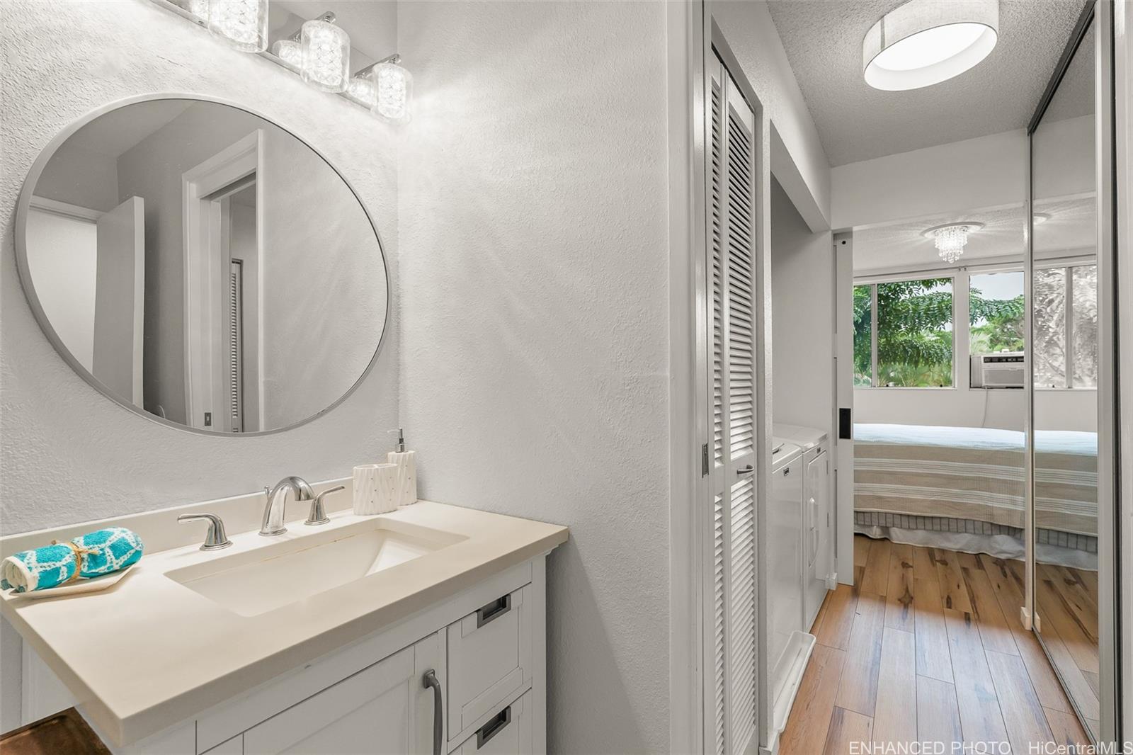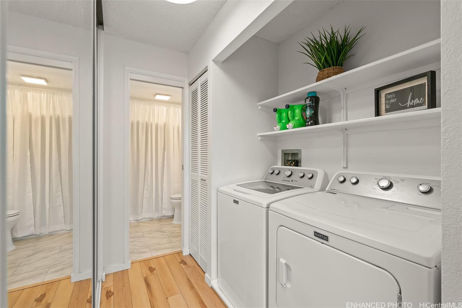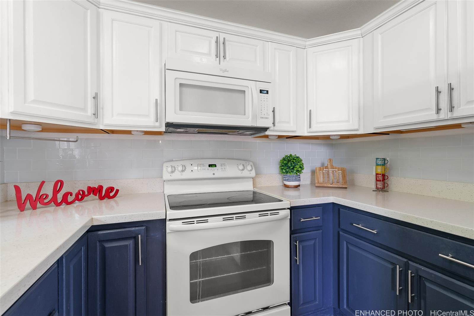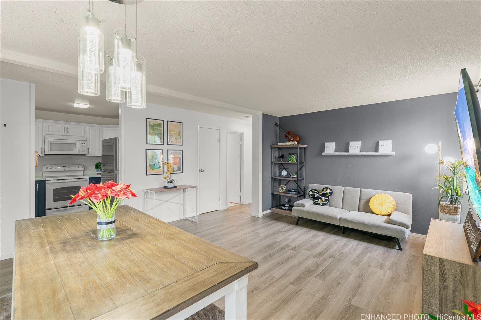Welcome home to Mililani Terrace, a turnkey corner unit that perfectly blends comfort, style, and convenience. This well-maintained2-bedroom, 1-bath residence includes 2 assigned parking stalls located near the unit (307Compact, 323) plus guest and street parking. 2021 upgrades include new waterproof laminate vinyl flooring throughout with new carpet in the second bedroom, paint, new bedroom blinds, updated lighting fixtures, and a stylish barn door to enhance privacy for the primary bedroom. Additional features include AC in the primary bedroom and living room for your comfort and full sized washer and dryer in the unit for your convenience. Relax and unwind while enjoying peaceful treetop views and cool breezes from your living room and kitchen, nestled within a lush, garden-like environment. Ideally located near Mililani Town Center, with easy access to shopping, dining, entertainment, and highway access for work and play. Enjoy the full range of amenities offered by the Mililani Town Association – 7 recreation centers, community pools, party halls and meeting rooms, picnic/BBQ, and much more. You won’t want to miss this move-in ready opportunity in a highly desired community