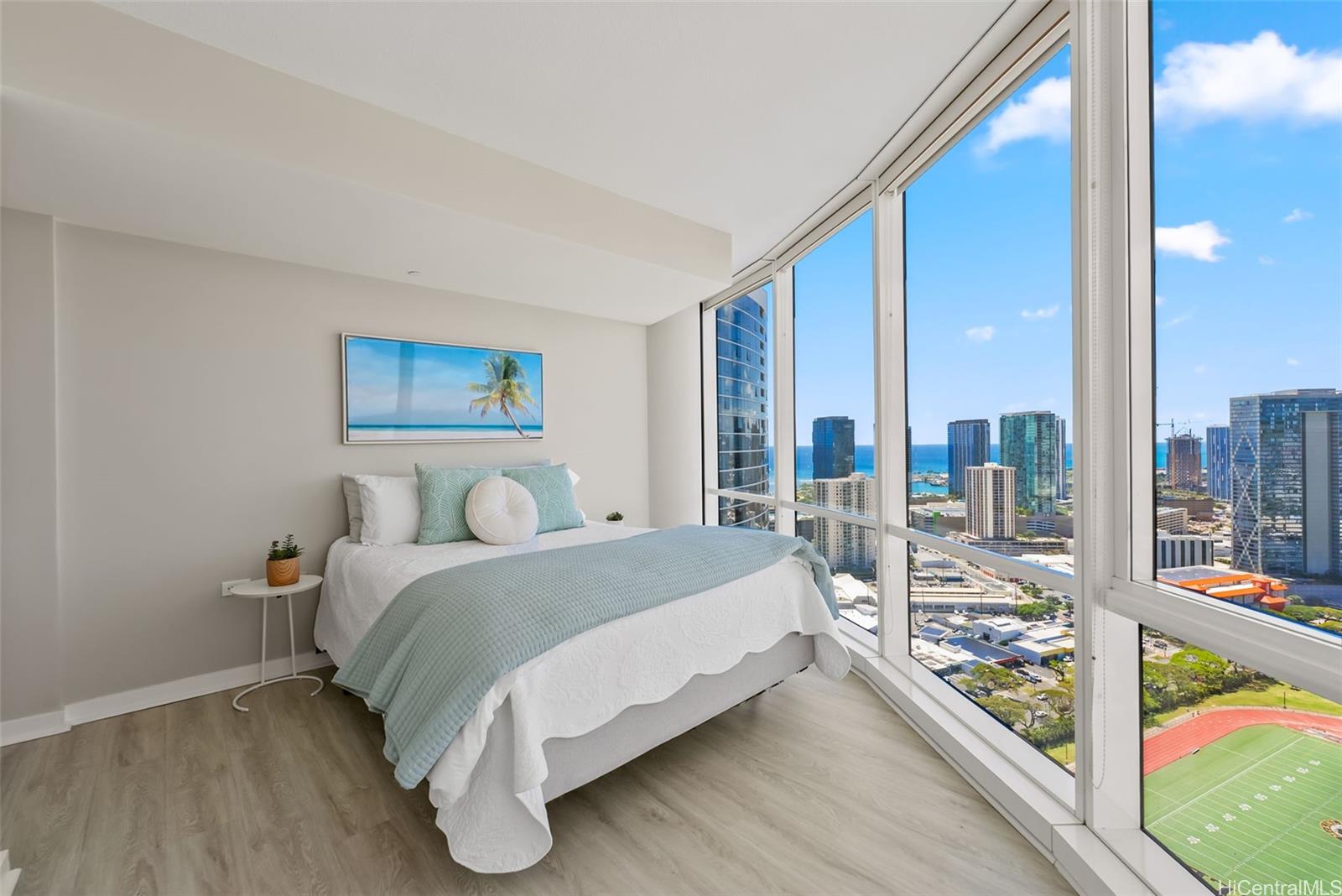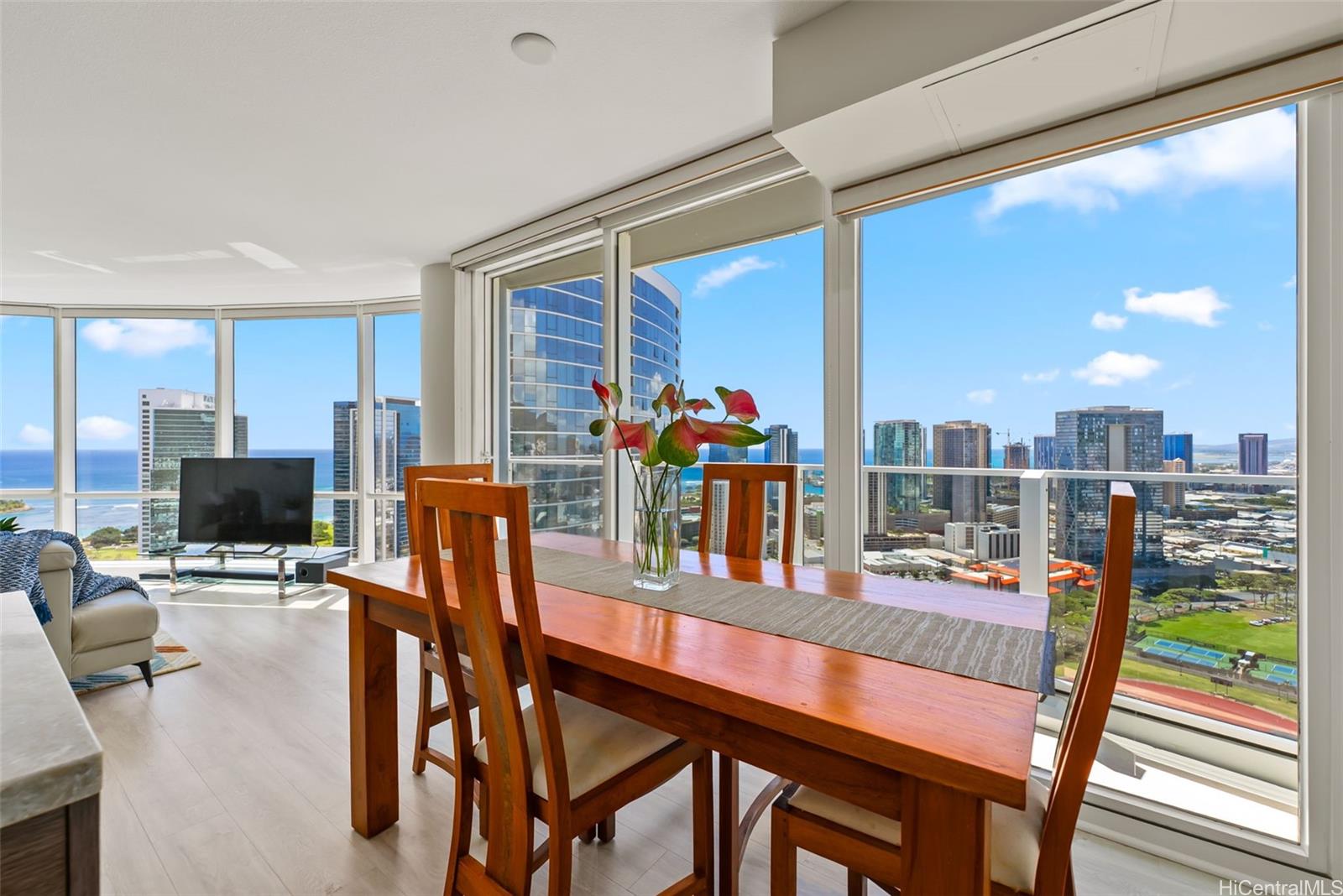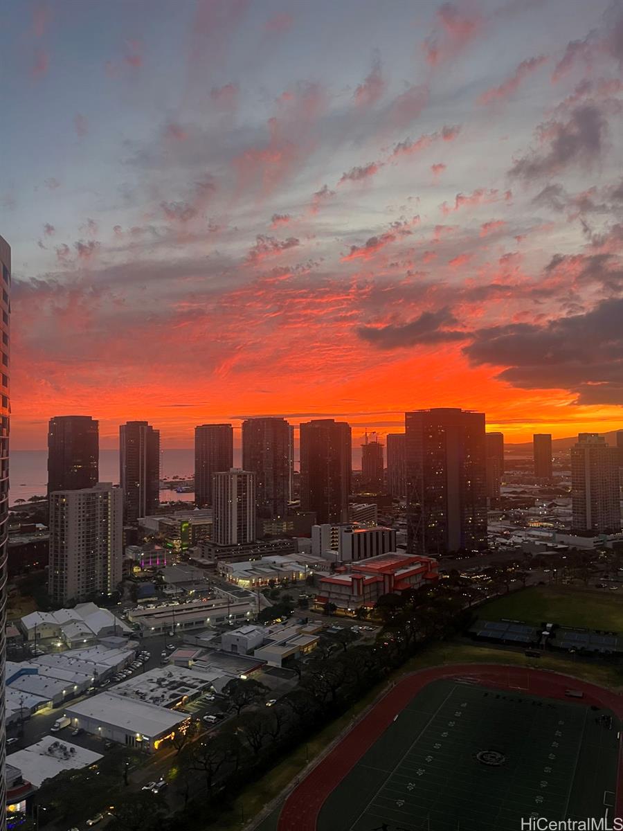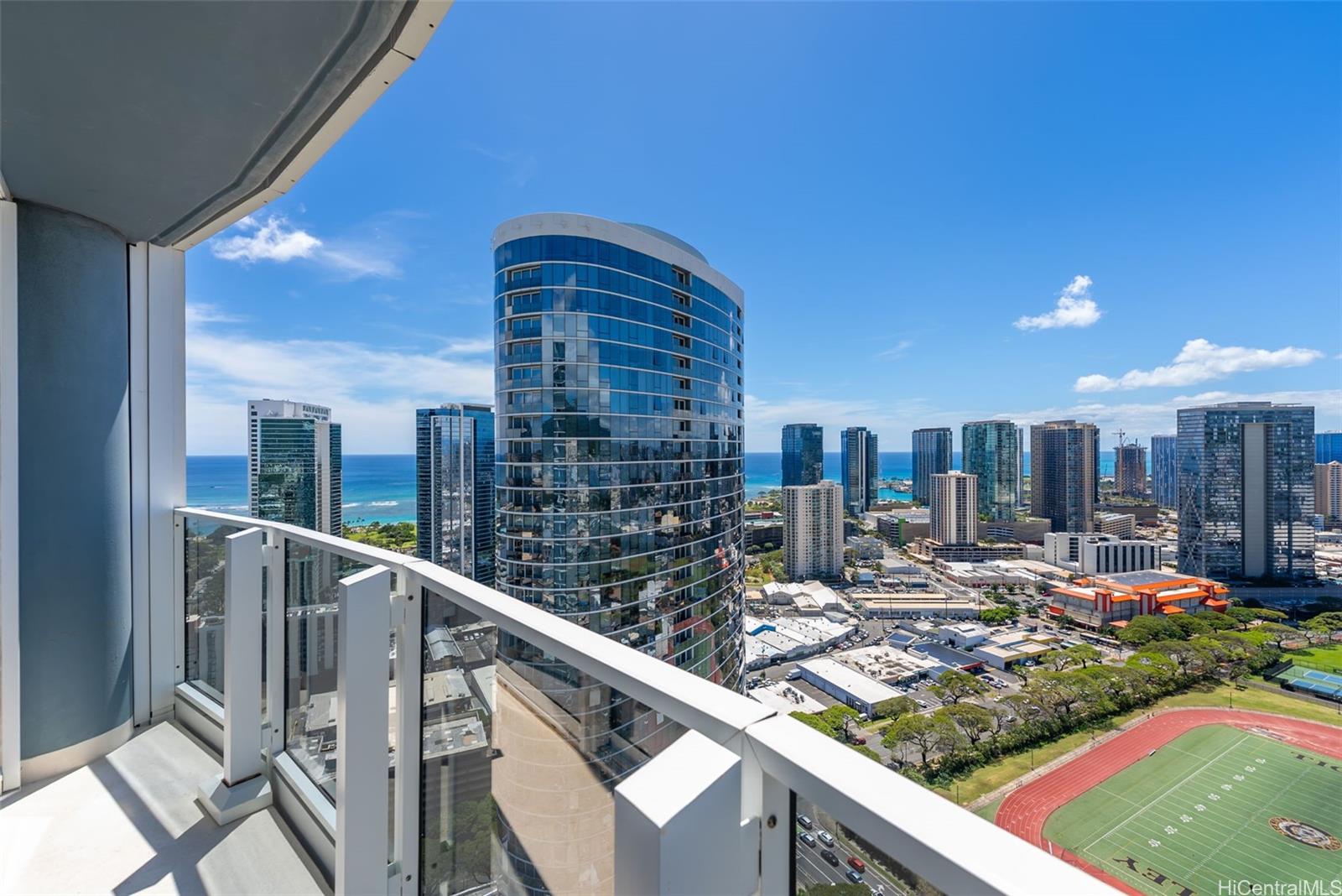 Clean, sleek lines and beautifully appointed finishes define this stunning high-floor residence in the East Tower of Moana Pacific. Perched on the 40th floor, this 3-bed, 2-bath unit showcases panoramic views through dramatic floor-to-ceiling windows, filling the space with natural light and island beauty. The residence features a thoughtfully remodeled kitchen and updated flooring, creating a modern, move-in-ready interior that blends style and functionality. The open layout enhances both everyday living and entertaining, while the elevated vantage point offers a true sense of privacy and tranquility above the city. Moana Pacific is known for exceptional amenities, incl 24-hour security, swimming pool, tennis & pickleball courts, golf driving cages & putting green, fitness center, BBQ cabanas, private theater, kids’ playground, and guest parking. Ideally located in the heart of Ala Moana, moments from Ala Moana Shopping Center, Ala Moana Beach Park, Ward Village, and Kaka‘ako & easy access to some of Honolulu’s best dining, shopping, and entertainment. Pet-friendly bldg (under 25 lbs). Experience elevated island living in one of Honolulu’s most desirable communities.