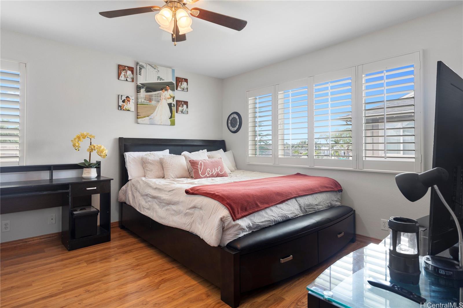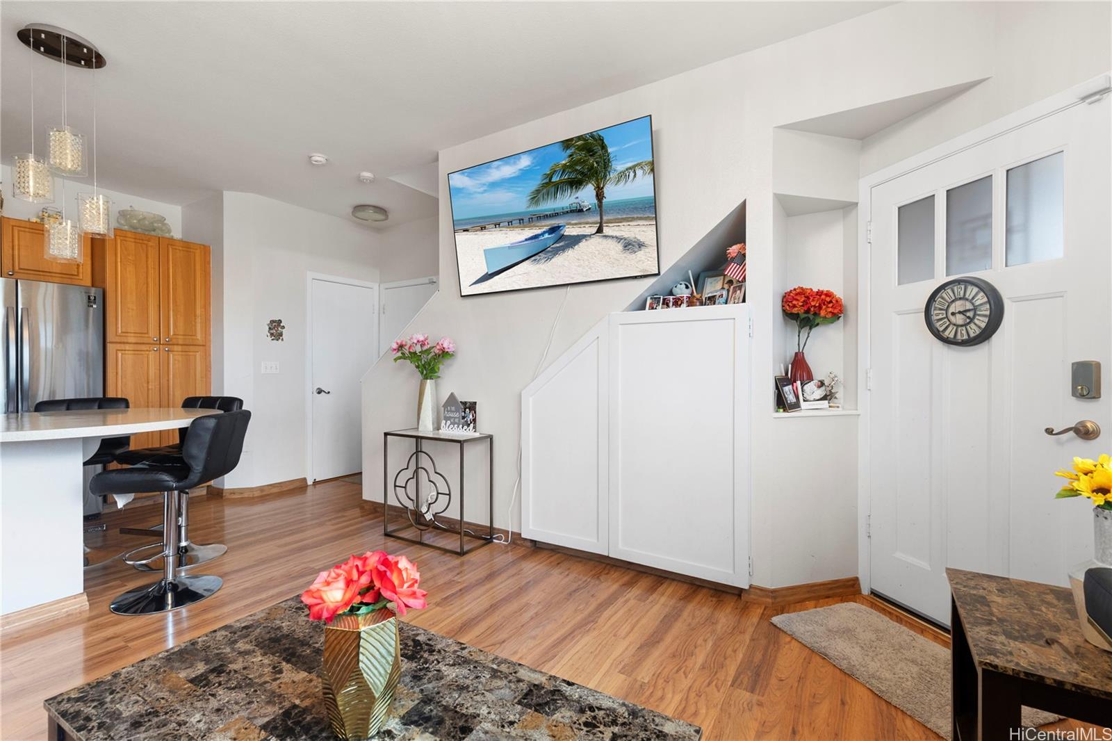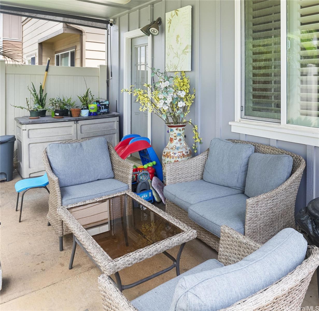 Beautiful corner home in the desirable Montecito/Tuscany community. This well-maintained residence features stainless steel appliances, oak kitchen cabinets, and durable laminate flooring throughout. Stay comfortable year-round with central A/C, smart ECHO climate control, and a built-in security system. Energy efficient upgrades include OWNED Photovoltaic (PV) panels, An Electric Vehicle charging system and a Solar water heater – helping to reduce electric costs. Elegant wood shutters provide both privacy and style. The spacious primary suite includes an ensuite bathroom and a walk-in closet. The property offers an enclosed 2-car garage, driveway and an additional parking stall. A total 4 parking spaces! Ideally located directly across from the community pool, BBQ area, and cabana – perfect for relaxation and entertaining. Ample guest and street parking. Conveniently close to parks, schools, Laulani Shopping Center, restaurants, and more. Please allow 48 hours notice to show.