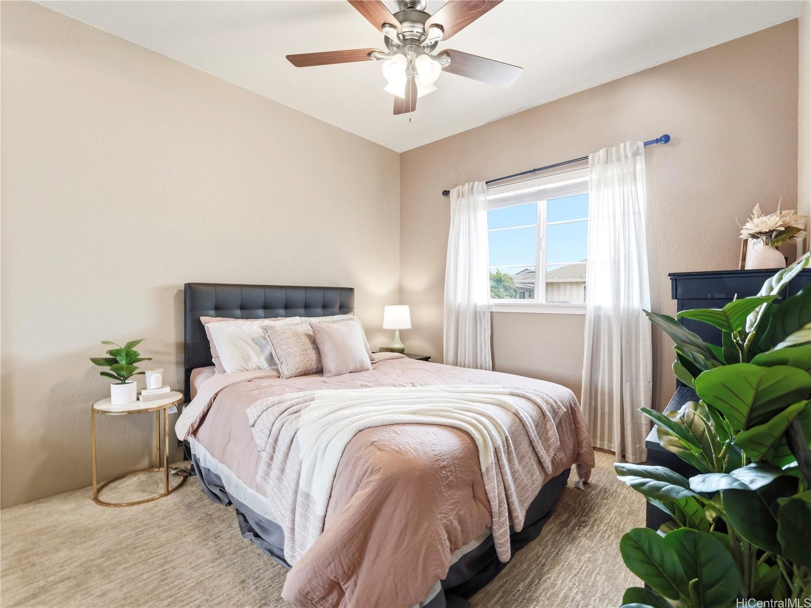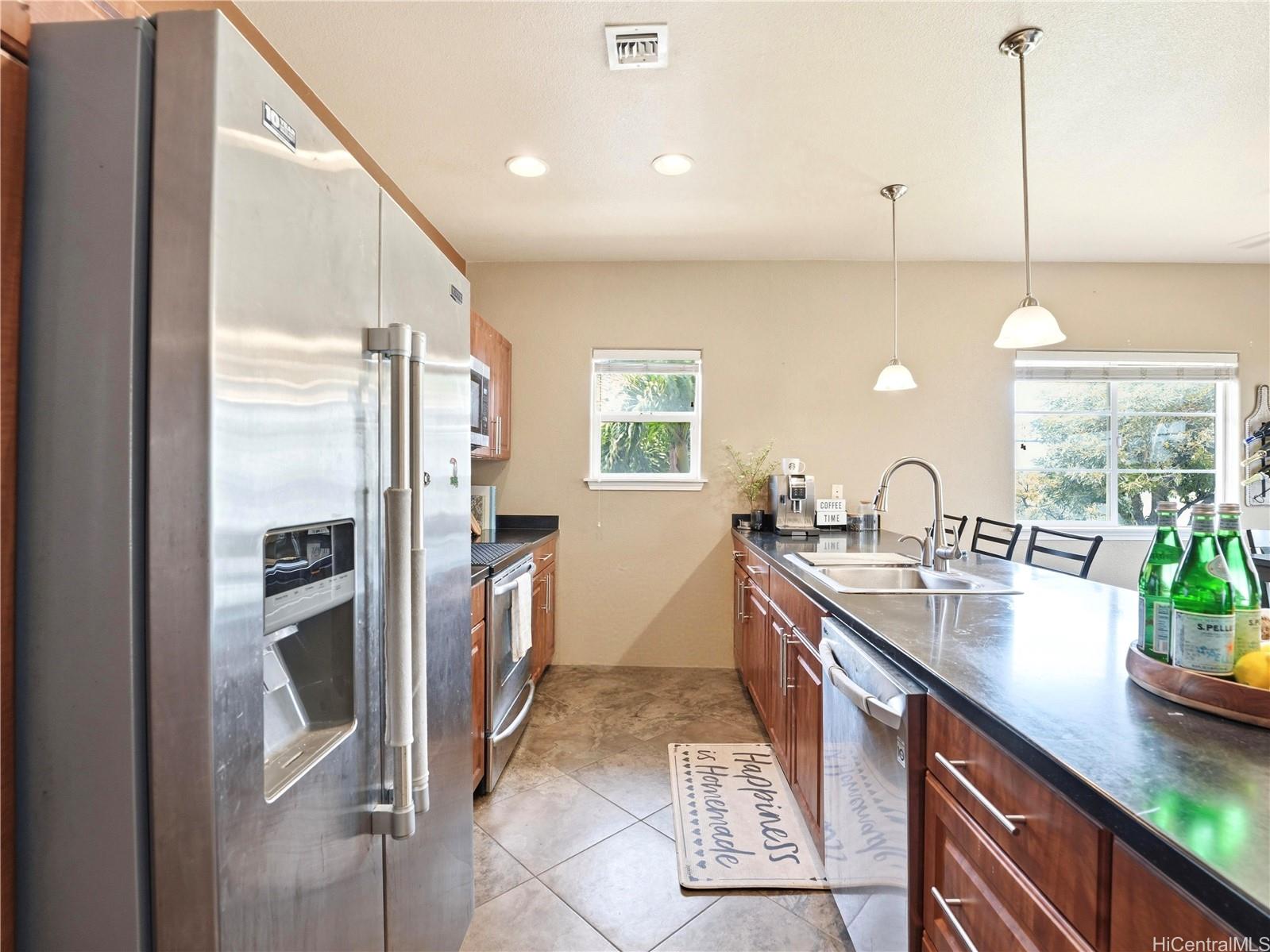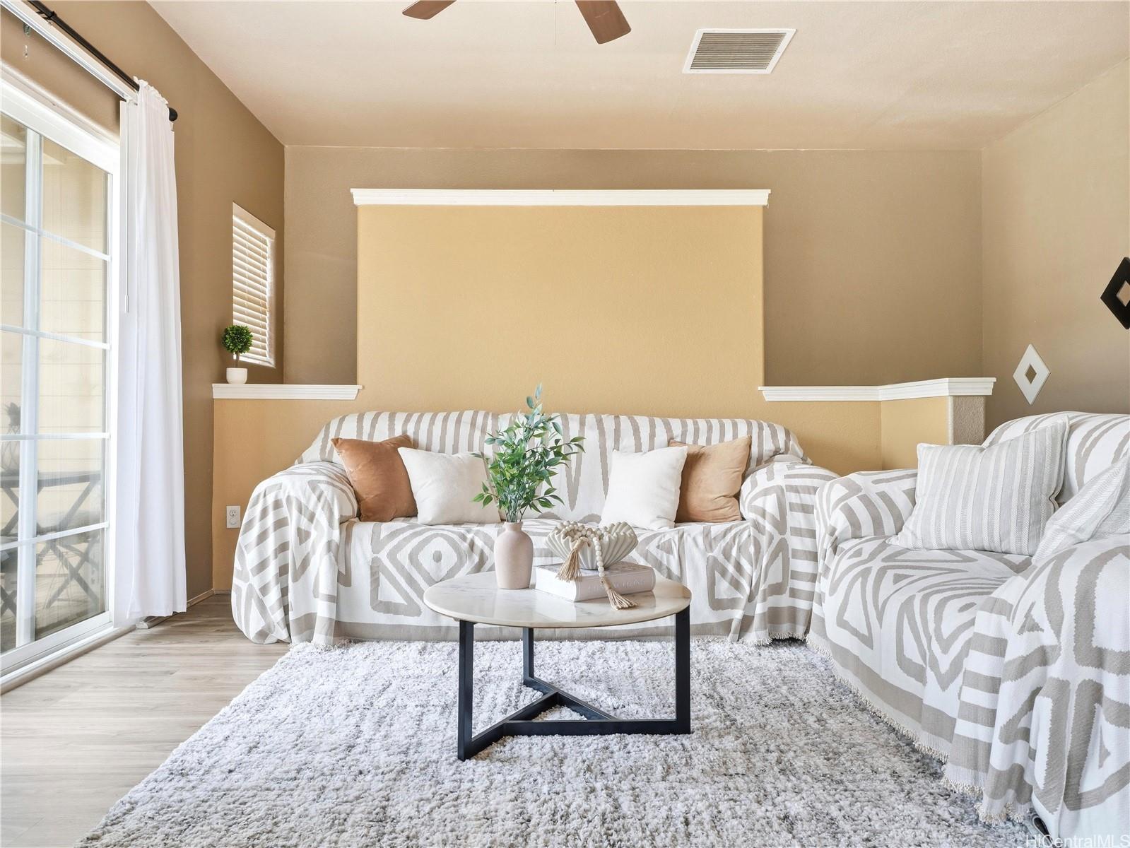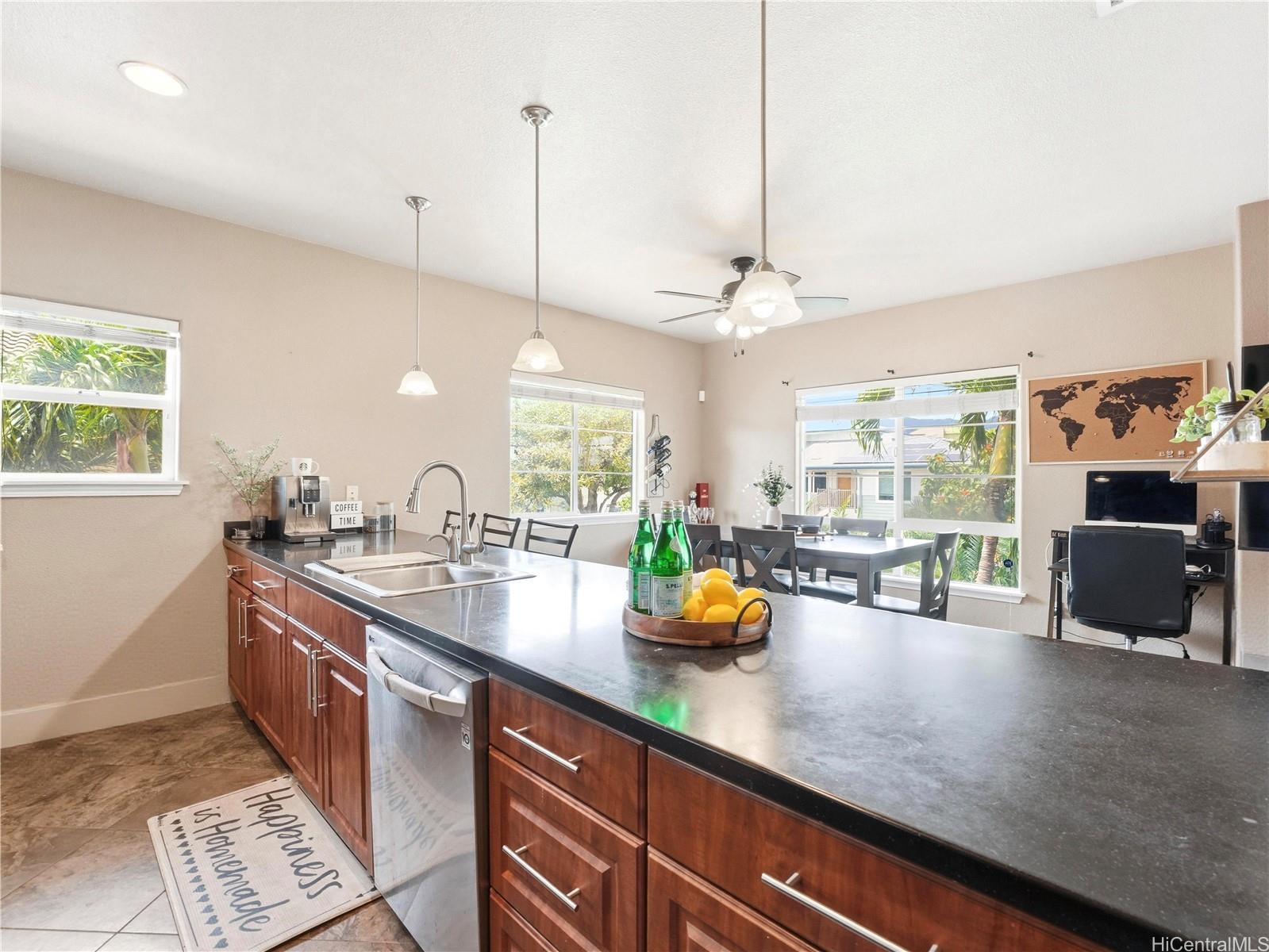 Welcome to 550 Kunehi St #202 in Nanala at Mehana, – where comfort, efficiency, and lifestyle come together in one of Kapolei’s most desirable communities. This bright and spacious 2 bedroom, 2 bath townhome is filled with natural light and designed for easy island living, featuring an open layout that flows seamlessly to your private lanai and patio/front yard (with your very own banana tree), perfect for relaxing or entertaining. Enjoy the added value of 24 leased PV panels, a Tesla EV charger, and a enclosed garage with additional parking, all complemented by a low HOA, offering you single family home features without the single family home price tag. The home offers a generous primary suite complete with a soaking tub, creating a comfortable retreat. Residents of Mehana enjoy resort-style amenities including a pool, fitness center, dog park, and playgrounds, all within a vibrant and walkable community. Ideally located just minutes from Costco, Ka Makana Ali‘i, H-1 access, and major military bases, this home offers the perfect balance of lifestyle and accessibility. Schedule your showing today! First Open House this Sunday 4/19 from 2PM-5PM!