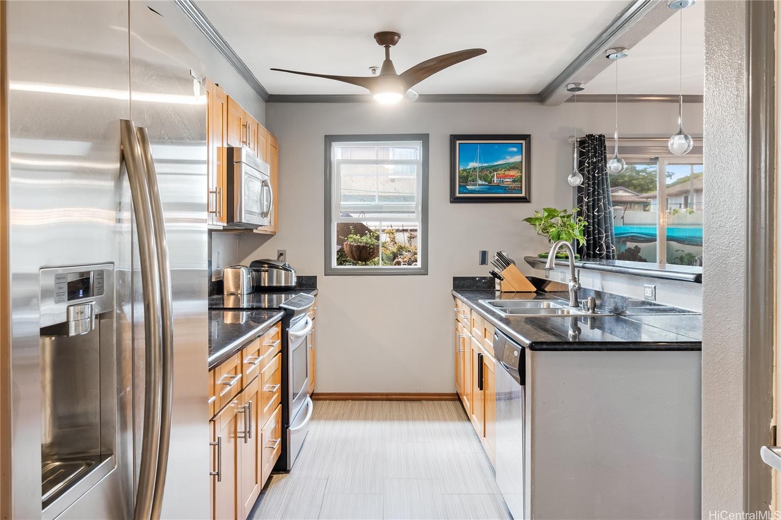 Welcome to Nohona II your new home in Kapolei! This beautiful home features, elegant crown, molding, updated flooring throughout, & sleek open concept living area. The primary suite offers a spacious walk-in closet and completely renovated bathroom. Enjoy the convenience of a full-size washer and dryer in unit plus your own private yard space – perfect for morning coffee or letting your fur babies out. Park easily in your one car garage with tandem parking, plus tons of guest parking available. Walk to the Villages at Kapolei rec center that features three different pools, perfect for families and staying active. This community is known for its quiet, family, friendly atmosphere with tree line street and well-maintained common areas. Located in one of Kapi most desirable neighborhoods, you are minutes from Ka Manana Al’i shopping center, top rated schools, the rail station for easy, Honolulu, commuting, great restaurants, and entertainment. Plus, enjoy quick, freeway access to the rest of the island. This ideally situated home offers the perfect blend of peaceful residential living with Urban convenience.