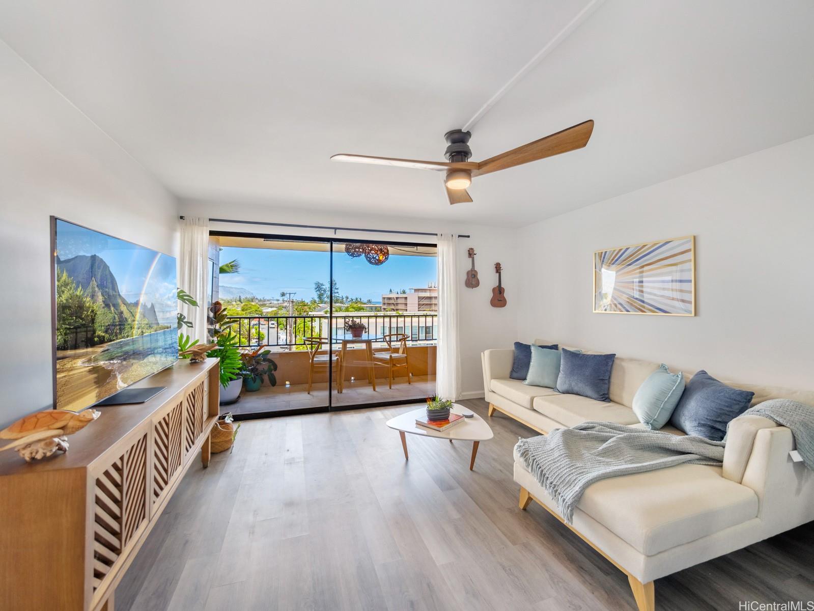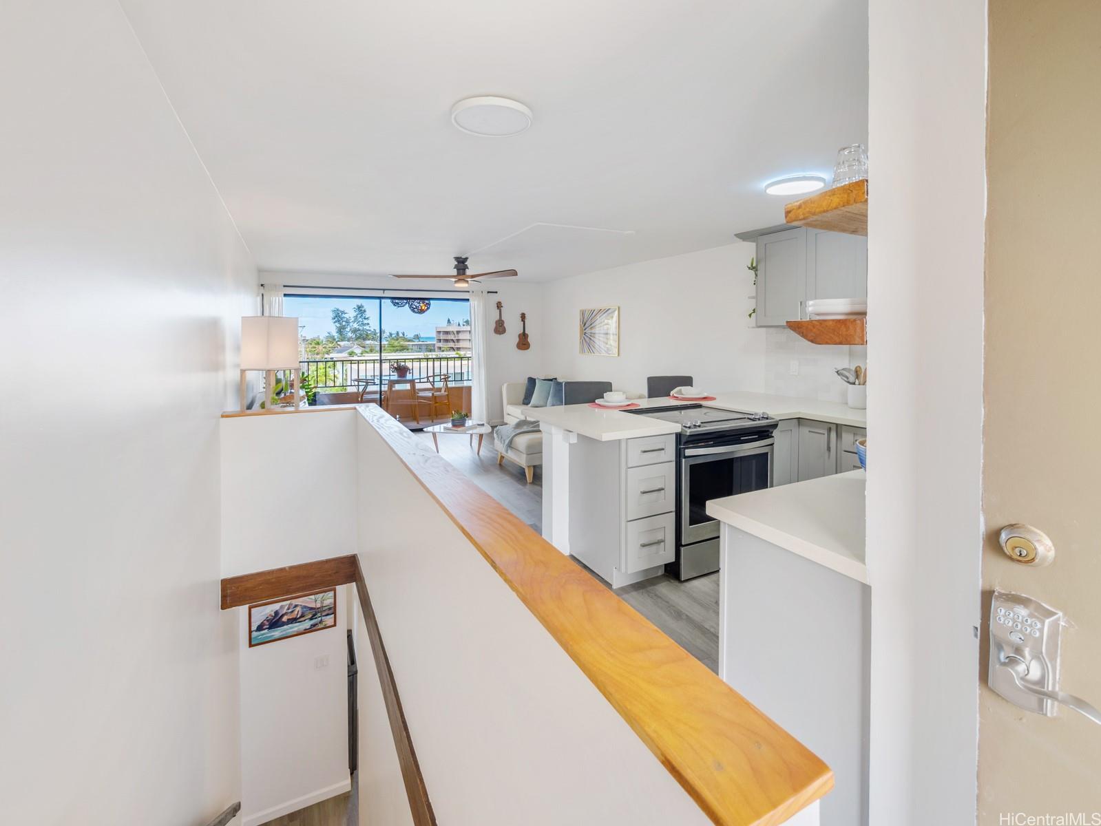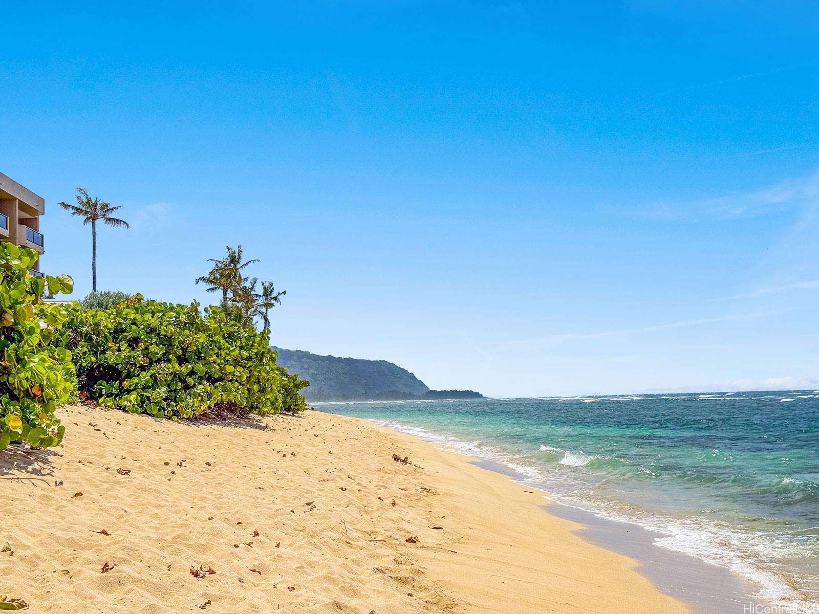 This beautifully remodeled split-level condo features 2 bed/1 bath, perfectly situated one block from the sandy beaches of the North Shore. This building is VA and Pet Approved with 1 deeded parking. The unit’s location is delightfully private as the second to last unit farthest from the elevator. It is in the west facing building, ideal for sunset viewings. Step inside the move in ready unit to discover a bright, clean remodel. With a fresh coat of paint and tasteful furnishings, the unit is turn key. The covered lanai provides breathtaking ocean views and Kaena Point, making it the perfect spot to relax. The layout of this condo is elevated, featuring an open kitchen and a stylish island/peninsula that enhances both functionality and aesthetics. The bedrooms and bathroom are located on the lower level. The bathroom features a full sized vanity and updated fixtures. The main bedroom’s custom built in make it functional and space enhancing. As part of the building’s amenities, you’ll have access to a pool, a relaxing sauna and one assigned parking. Nestled in a quiet, breezy, and local ocean community, this condo offers a rare blend of beauty, comfort, and affordability.
