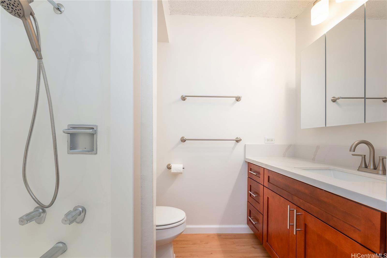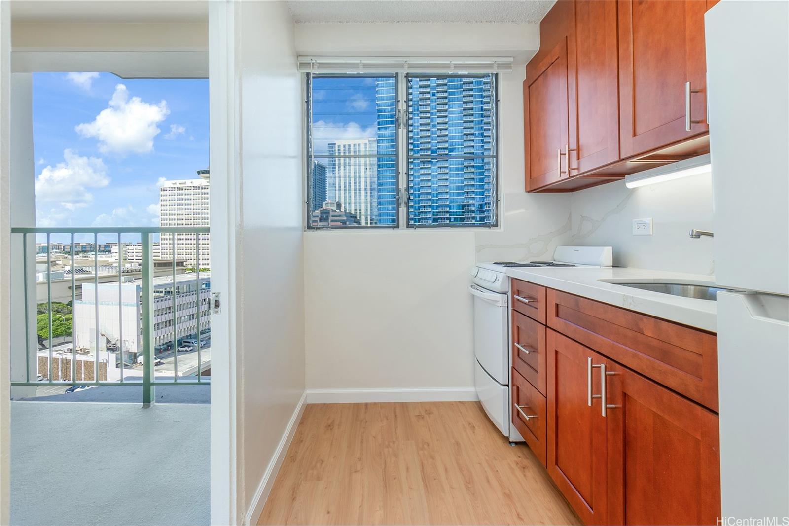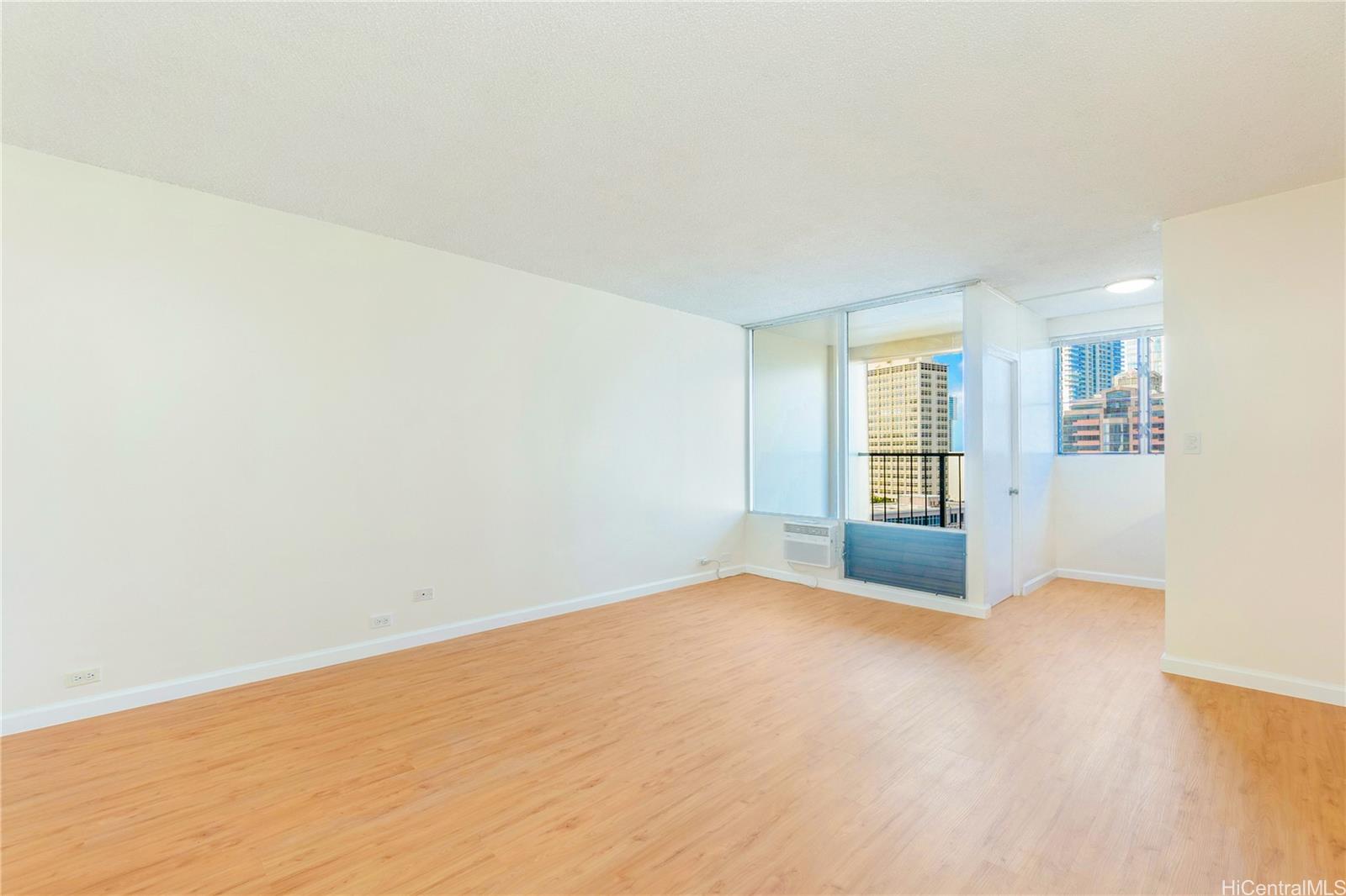 Move-in ready and excellently located studio with one full bathroom in the Pacific Grand condominium. This updated unit features new kitchen cabinets and quartz countertops, fresh interior paint throughout, and new luxury vinyl plank flooring. The bathroom has been refreshed with a new vanity, updated lighting, and a reglazed tub. Ideally situated at the gateway to Waikiki and the Hawaii Convention Center, walking distance to Don Quijote, and just a few blocks from Ala Moana Center and Ala Moana Beach Park. Enjoy close proximity to world-class shopping, dining, and outdoor recreation. Residents benefit from easy access to major bus lines at Ala Moana Center. Do not miss this opportunity to own your piece of paradise. One or more photos have been enhanced.