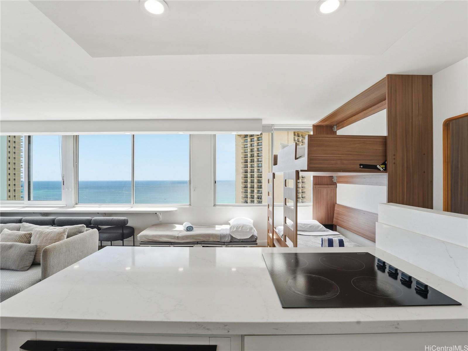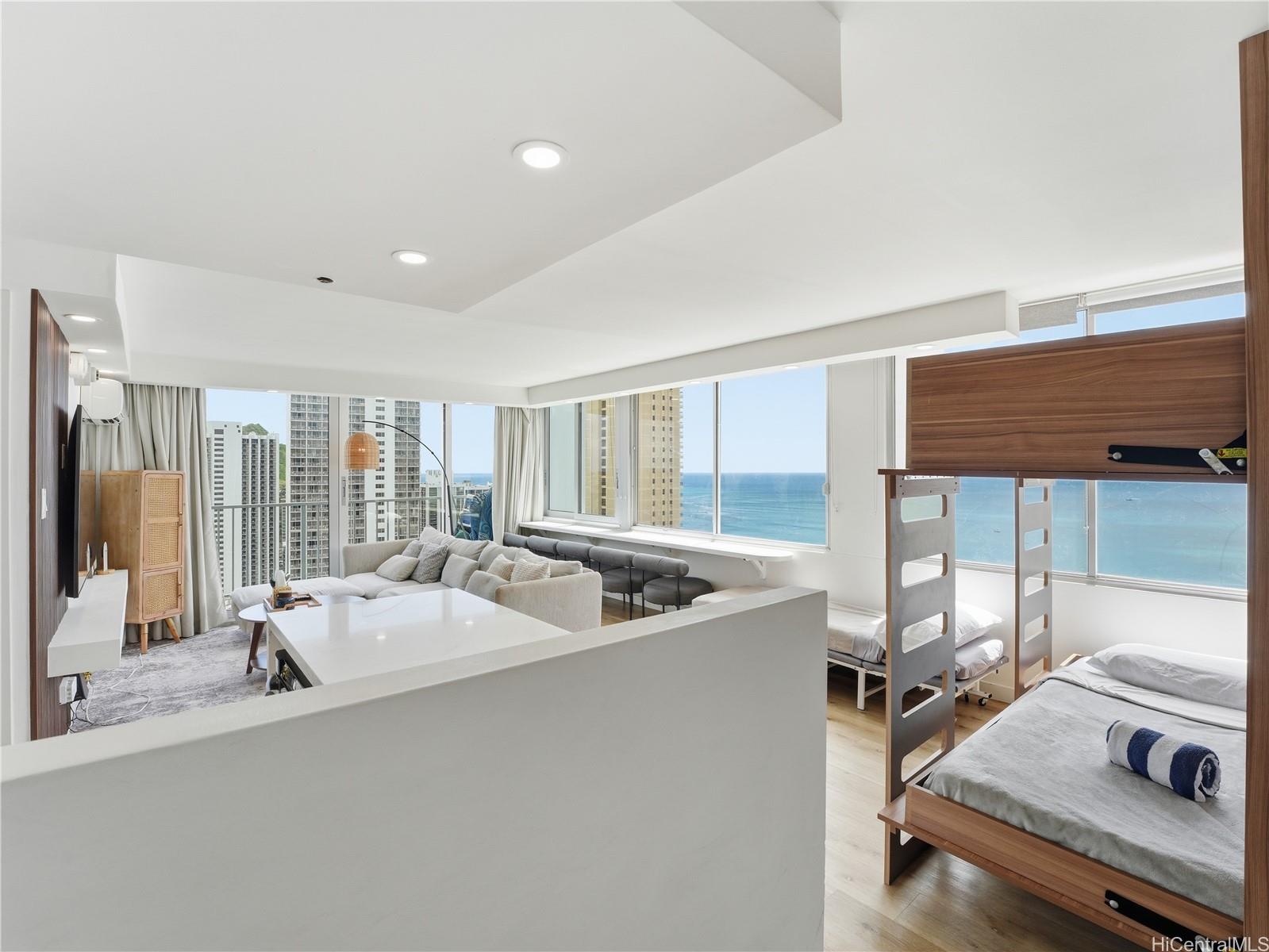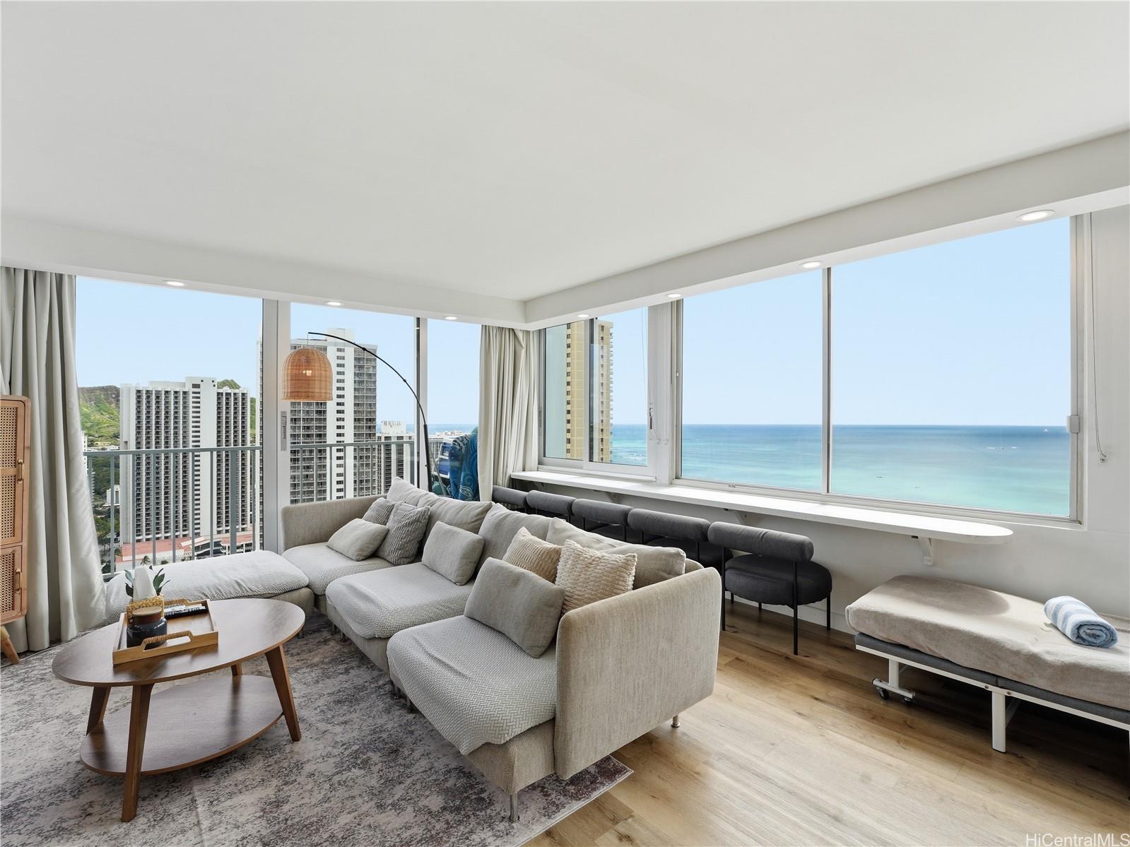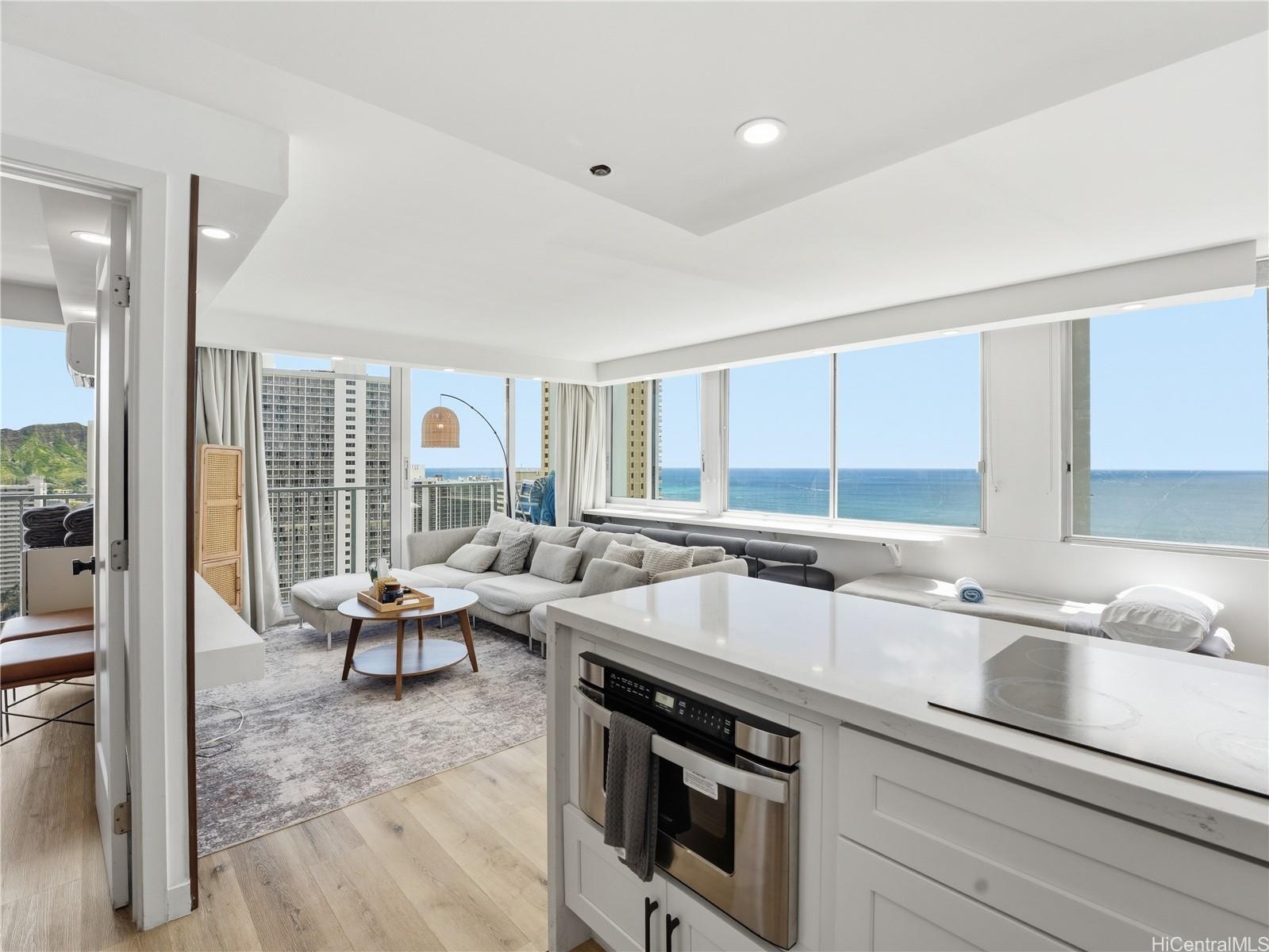人気物件「パシフィック・モナーク」にある、美しく改装された1ベッドルーム・1バスルームの角部屋で、上質な島暮らしをご体験ください。 絶好のロケーションに位置し、息をのむようなパノラマビューを堪能できるこの邸宅では、プライベートな空間でくつろぎながら、ダイヤモンドヘッドときらめく太平洋の素晴らしい景色をお楽しみいただけます。 入念に改装されたインテリアは、モダンな仕上げと洗練された床材を採用し、スタイルと機能性を両立させたすっきりとしたコンテンポラリーなデザインとなっています。 人気の高い角部屋ですので、プライバシーが確保され、自然光がたっぷり差し込み、部屋全体に心地よい風が通り抜けます。 投資効果やスペースを最大限に活用したいとお考えの方には、隣接するユニットも販売中です。 これは、同じフロアにある隣接する物件を所有するまたとない機会であり、建築許可を得て両ユニットを連結する可能性も検討できます。 .