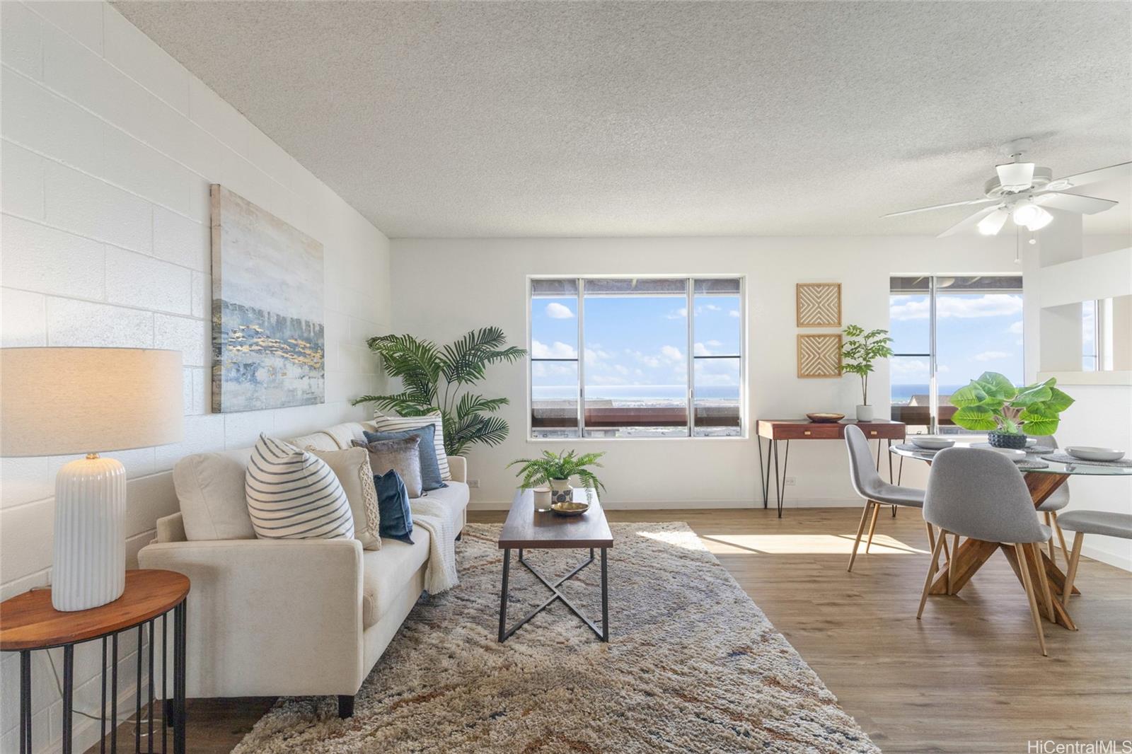 This 3rd-level unit is on the upper terrace, and this unobstructed end unit allows the cool upper makakilo breeze to flow throughout the home. 180 degrees of Spectacular views of Diamond Head through the blue Pacific Ocean of the Leeward Coast. This home features New upgraded flooring throughout the unit. A new water heater, toilet, and mirrored closet doors and tracks in the primary and living room, along with a fresh coat of paint, make this home feel fresh, new, and inviting. Add your own personal design touch to the kitchen and make this home truly yours. Large end parking stall closest to the unit, and 2nd parking is another end stall. Palehua Villas is a pet-friendly complex with a security system throughout the complex. Just off of Makakilo Drive, on major bus lines, and just minutes away from all Kapolei has to offer, Costco, Home Depot, Safeway, restaurants, and entertainment with easy freeway access. Seller will credit the buyer $10,000 towards closing costs!