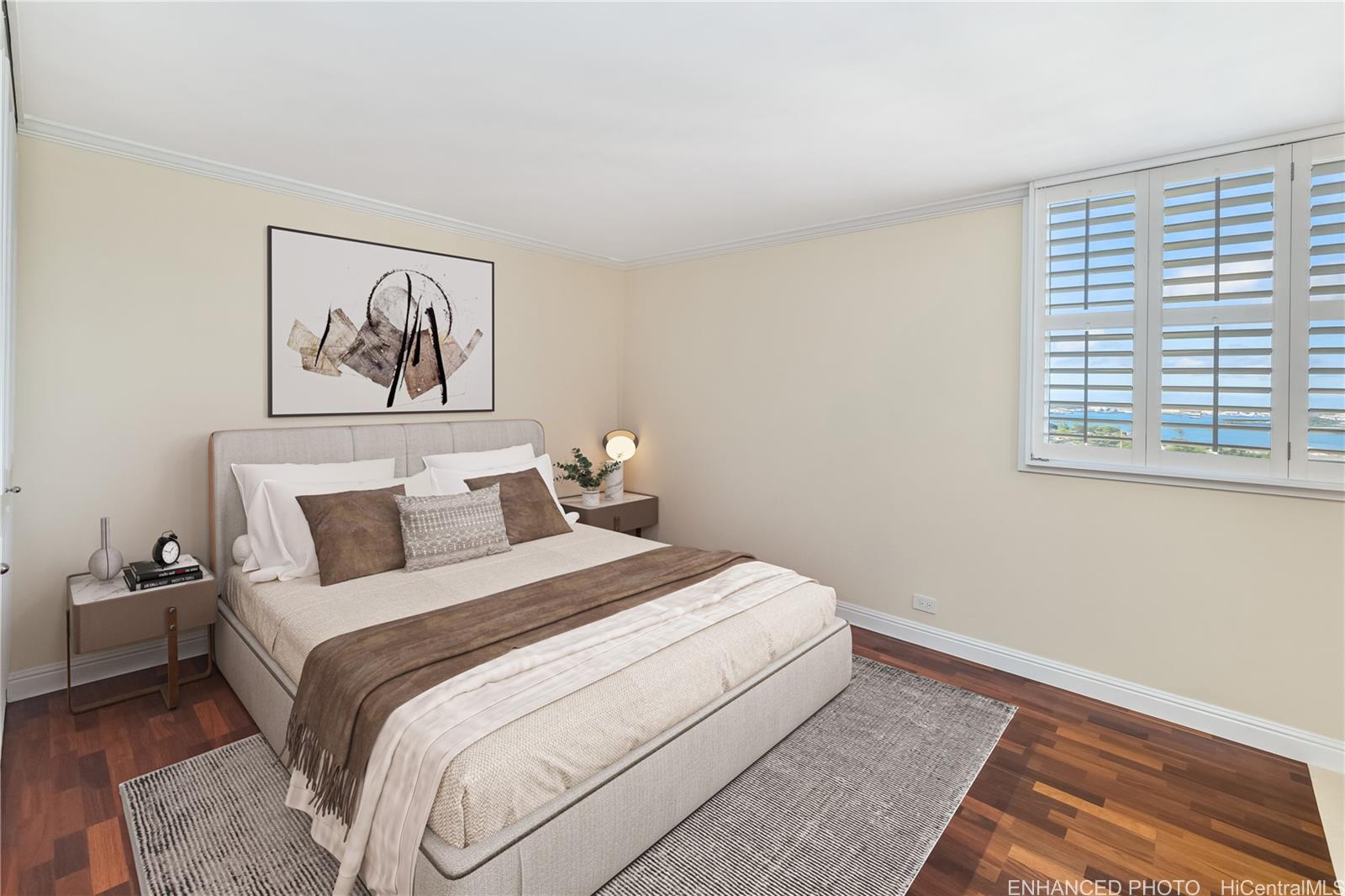 Say aloha to your new home in paradise! This beautifully updated two-bedroom, two-bathroom condominium offers an incredible opportunity to enjoy breathtaking panoramic views of Pearl Harbor and sparkling water from your private lanai. Relax in the open, airy layout, perfect for unwinding or hosting family and friends. The rich Koa vinyl wood floors create a warm and inviting atmosphere throughout. The chef-inspired kitchen features top-of-the-line appliances, including a Bosch stove, microwave, built-in dishwasher, and Sub-Zero refrigerator, all beautifully complemented by elegant marble countertops. For your convenience, a Miele front-loader washer and dryer are included, as well as California closets and Hunter Douglas electric shades that offer a touch of sophistication and ease. Living at The Park at Pearl Ridge offers fantastic community amenities, including a pool, BBQ area, tennis courts, garage parking, lush tropical landscaping, and 24-hour security. With easy access to highways, shopping, and military bases, you’re ideally situated to explore and enjoy the best of O’ahu. This condo offers a lifestyle as easygoing and vibrant as Hawai’i itself.