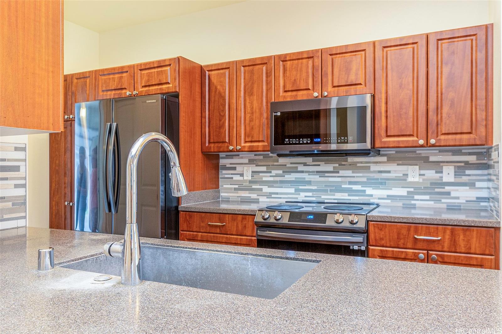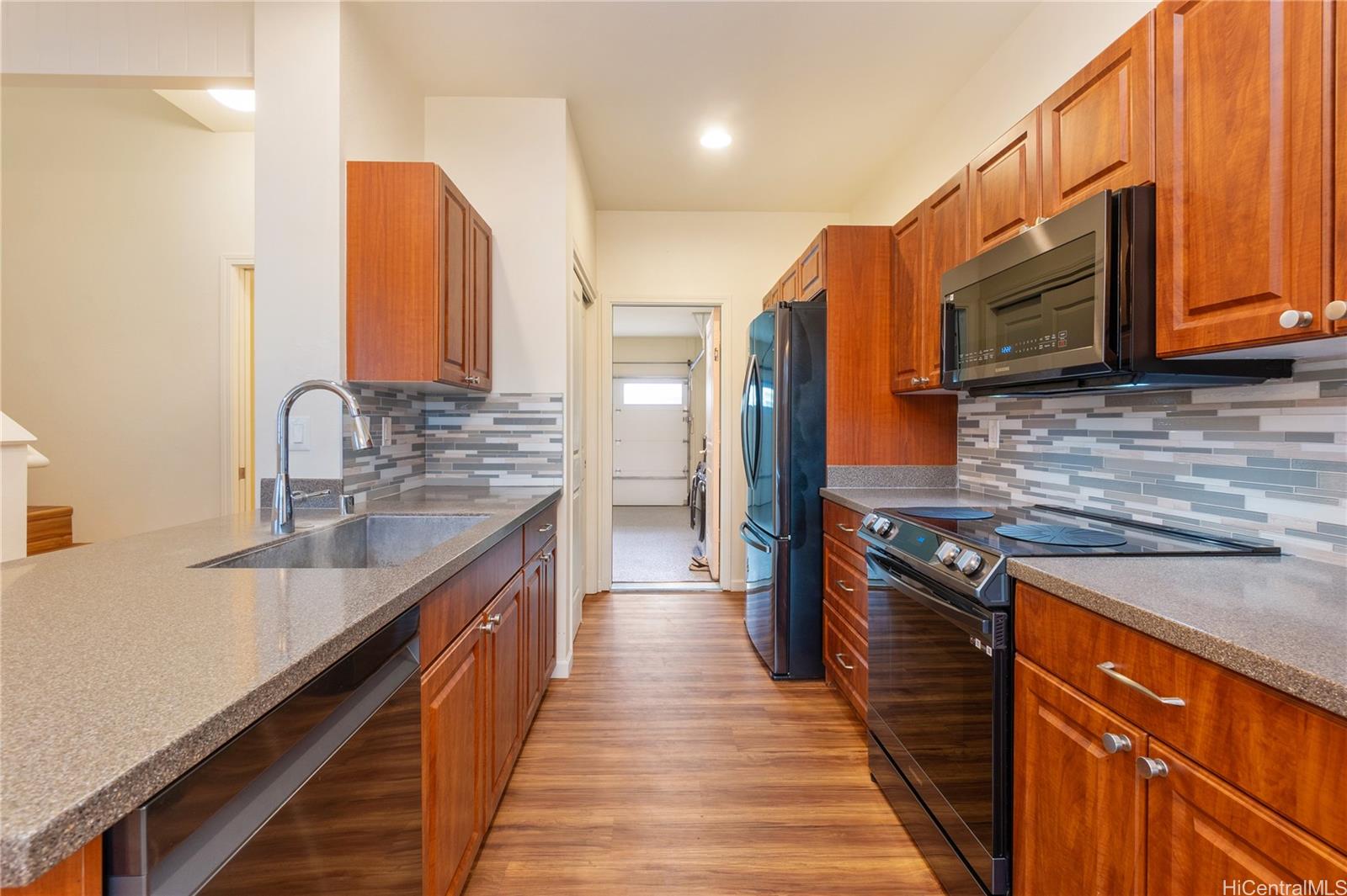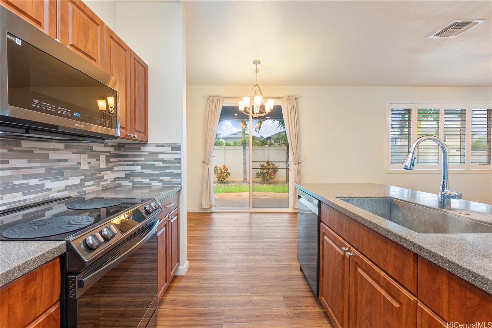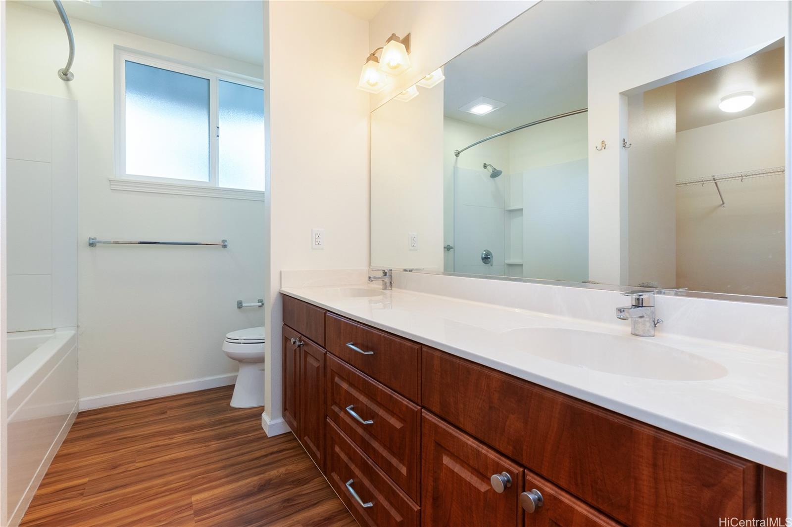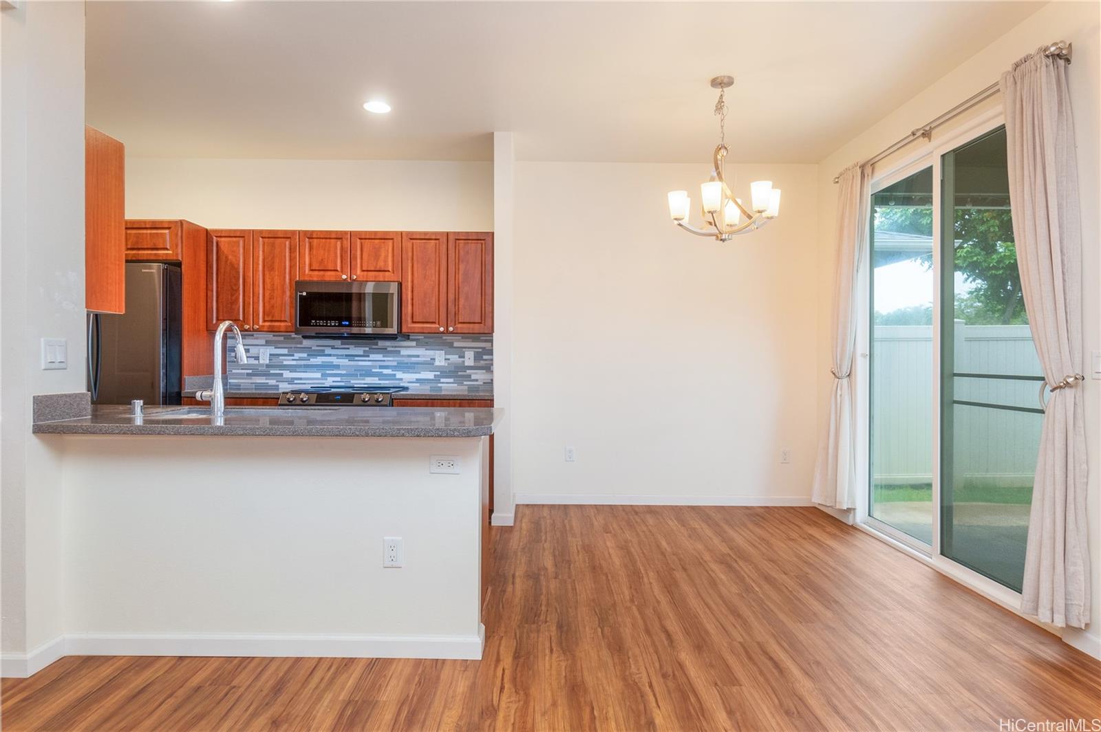 Sunday Open House 2-5pm in the highly sought after Ewa Gentry Parkside community. Come see this beautifully maintained 3 bedroom, 2.5 bath end unit home that showcases true pride of ownership throughout. Inside you will find upgraded vinyl flooring throughout, completely carpet free, creating a clean and modern feel. The spacious primary suite features a walk in closet and an ensuite bath with dual vanities. A versatile upstairs loft provides additional living space, ideal for a home office, media area, playroom, or even an extra bedroom. Additional highlights include plantation shutters, Central AC (brand new Bosch HVAC), new appliances, Full washer / dryer, and solar water heater + 24 leased PV panels plus 2 Tesla backup batteries. Enjoy outdoor living in your manicured backyard with no rear neighbors, complete with a covered lanai perfect for relaxing or entertaining. This home also offers a 2-car garage plus a 2-car driveway, with guest parking just steps away. Residents enjoy access to a community pool.