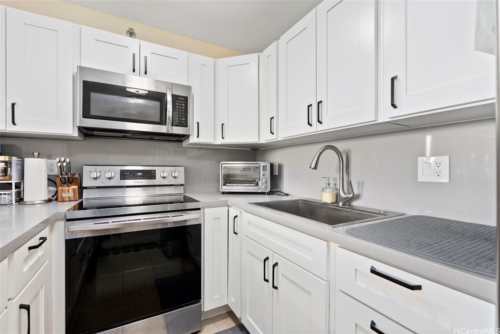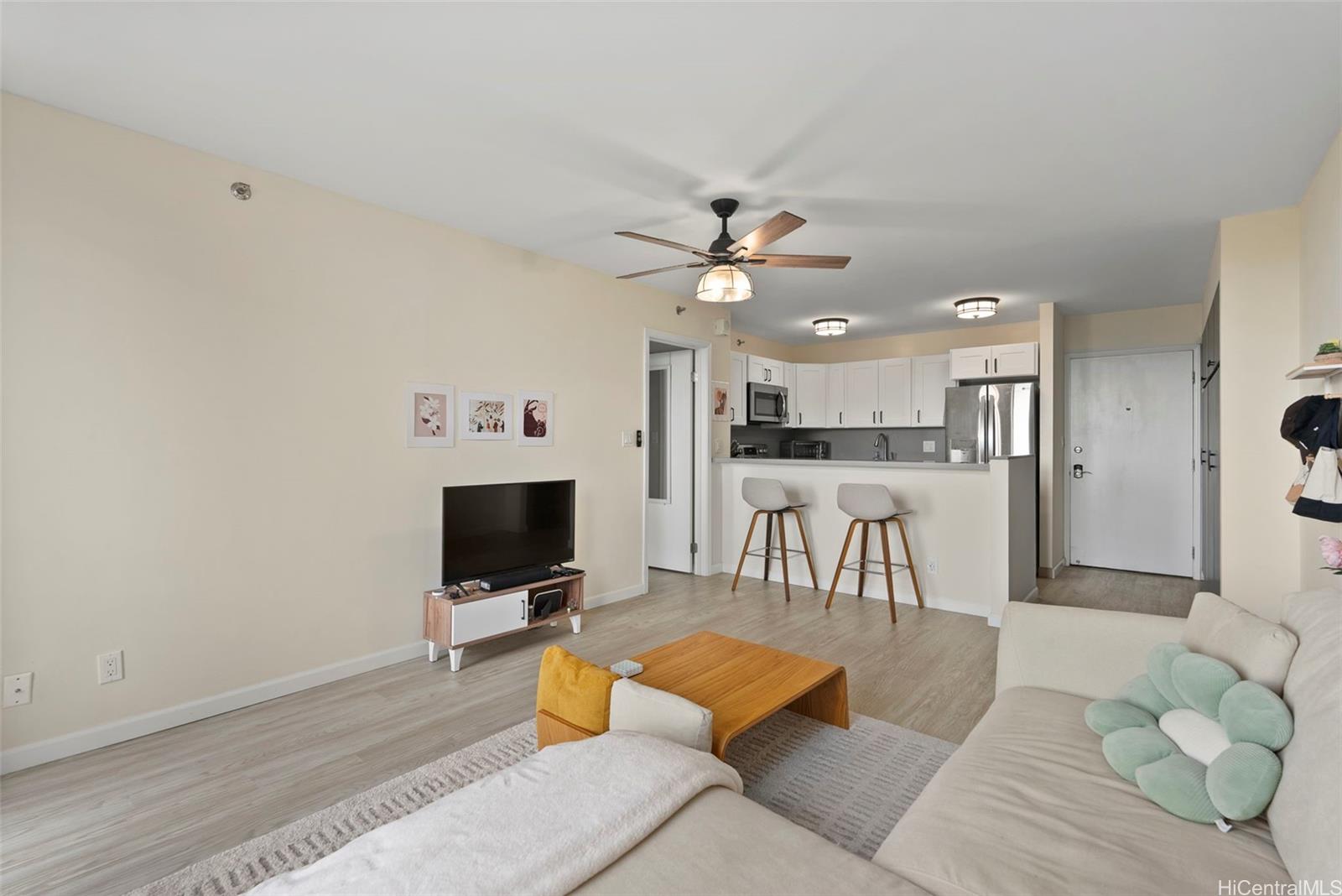 Conveniently located on a low floor on the preferred side, this 1bedrm, 1 bath condo at Pearl Regency has a lanai overlooking the neighborhood. Meticulously kept and recently renovated featuring smooth finished ceilings, AC, ceiling fan, vinyl plank flooring, fully upgraded kitchen with new cabinetry, quartz countertops, stainless steel appliances, and a glazed shower. Enjoy the convenience of an in-unit front load washer/dryer, an assigned parking stall, car wash area, & additional storage. Pearl Regency is a pet friendly well-maintained high-rise community, hurricane insured, fire sprinklers, 24-hr security on site, and generous guest parking. Amenities include a pool, kiddie pool, jacuzzi, tennis court, playground area, exercise room, clubhouse, BBQ area, and pavilion- perfect for entertaining or relaxing. Additional bike, surfboard storage, and motorcycle parking available. Located near Pearlridge Shopping Center and Pali Momi Medical Center, bus route, minutes from Pearl Harbor, Hickam AFB, airport, dining, schools, and freeway access. Don’t miss your chance to live in comfort, style, and convenience in the heart of Aiea!