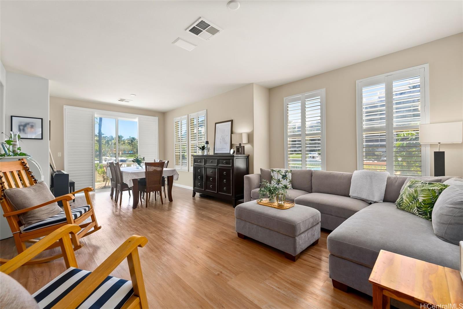 Presenting this rarely available, corner marina-front townhome in the gated community of the Peninsula at Hawaii Kai. Offering unparalleled panoramic views of both the park and the marina, this property is ideally located near resort-style amenities and is perfect for water enthusiasts. The community dock is located just beyond the backyard, providing easy access for paddleboarding, kayaking, or canoeing. The home enjoys a prime location with a large lawn on one side and the active marina on the other, complemented by a marina-front promenade. The property features two enclosed yards, perfect for everything from intimate gatherings to large holiday celebrations, including front-row seats for the annual Christmas boat parade. This spacious “Cottage” townhome has been thoughtfully upgraded with newer flooring, painted kitchen cabinets, a hybrid water heater, and plantation shutters. The interior features high ceilings, central AC, and a generous primary suite with a walk-in closet and a luxurious bath.This is truly a remarkable find in East Honolulu.