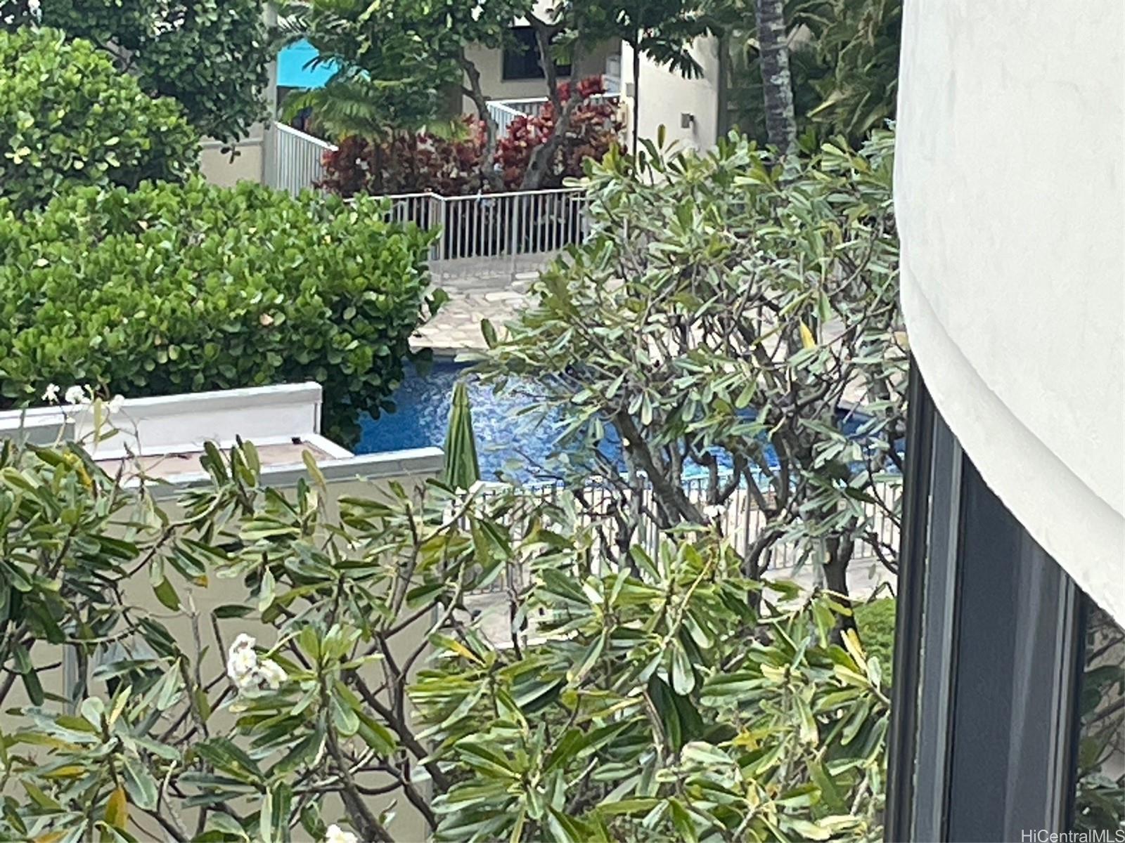 TWO LANAIS are major features of this CORNER unit designed to enjoy dining and gardening while taking in marina and ocean views, colorful sunsets and even a glimpse of Diamond Head. Wonderful ventilation embraces this two-bedroom two bath unit surrounded by sights and sounds of mother nature. Sliding doors from Living Room provide direct access to lanais. Versatile floorplan with lots of space for dining, living and entertaining and separate nook off kitchen with passthrough bar. Large Primary front bedroom also has direct access to main lanai, double set of closets with mirrored sliding doors, double sinks and separate tub shower and toilet area. Back bedroom enjoys cool mauka breezes and convenience of bathroom and laundry appliances in adjacent hall. Two assigned side by side full size stalls, extra storage locker and location at end of floor next to exit stairwell adds to the PRIVACY and QUALITY of living in this special corner.Inviting circular driveway, loading zone next to lobby entry, pool, barbecue, exercise and meeting/social room, lots of guest parking enhance living in this distinctly designed, well-maintained project which has already undergone major retrofitting.