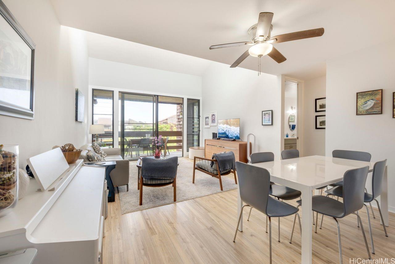 Welcome to Poinciana Manor, where comfort and convenience meet in this top 4th-floor residence. The open and airy living area features a vaulted ceiling with windows that invite abundant natural light and refreshing cross-breezes, creating a bright and welcoming atmosphere. Enjoy tranquil treetop views from the private lanai. This thoughtfully designed 2-bedroom, 2-bath home includes an updated kitchen and bathrooms, luxury vinyl flooring throughout, and tile flooring in both bathrooms. The second bedroom offers added flexibility with a built-in Murphy bed. Additional highlights include two covered parking stalls and storage conveniently located in the parking garage. Community amenities include a swimming pool, BBQ area, 3 elevators, clubhouse, and on-site resident manager. All just minutes from famous Kailua beaches, shopping, dining, and outdoor adventures – This is island living at its best!