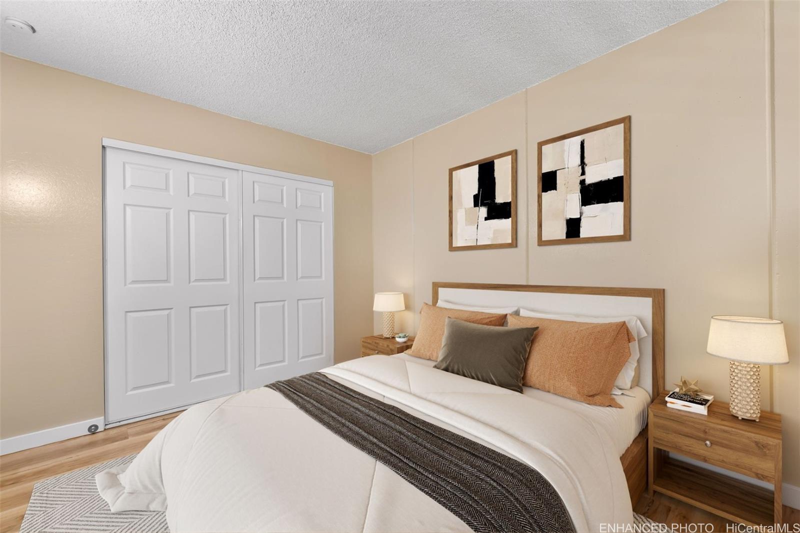 VA assumable opportunity with a very low gap in desirable Ridgecrest-Melemanu! This 2-bedroom, 1-bath, 799 sq ft unit offers addedprivacy with no rear neighbors and includes a covered lanai and one assigned covered parking stall. Thoughtfully upgraded with new vinyl flooring throughout, fresh interior paint, white shaker cabinets to the ceiling, quartz countertops, and a beautifully renovated bathroom. The kitchen is equipped with stainless steel appliances, including a full-size washer and dryer. Custom entertainment center with flush-mounted 65” TV conveys. Assumable VA loan features a 3.75% interest rate, approximately $407,000 remaining balance, and estimated monthly payment of $2,208. Loan serviced by Mr. Cooper; assumption available to qualified Veteran with COE. Well-managed community with low maintenance fees and strong association. Centrally located in Mililani with convenient access to Schofield Barracks, shopping, dining, and freeway access. Ideal for owner-occupants seeking value, efficiency, and location.
