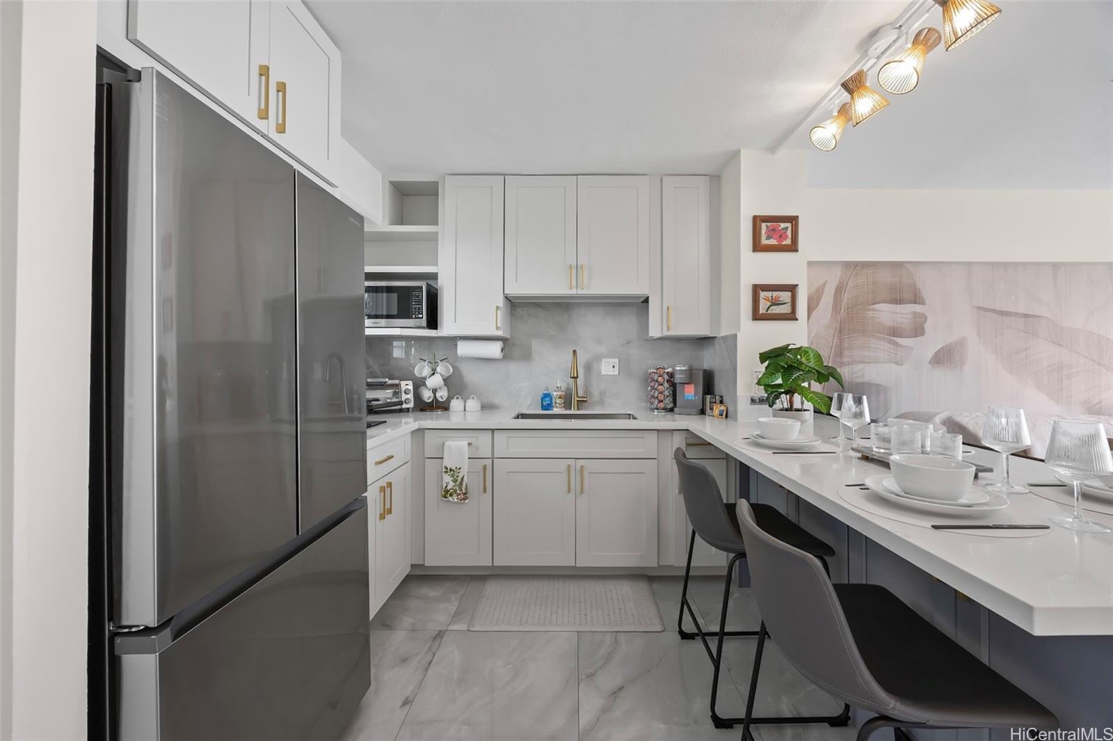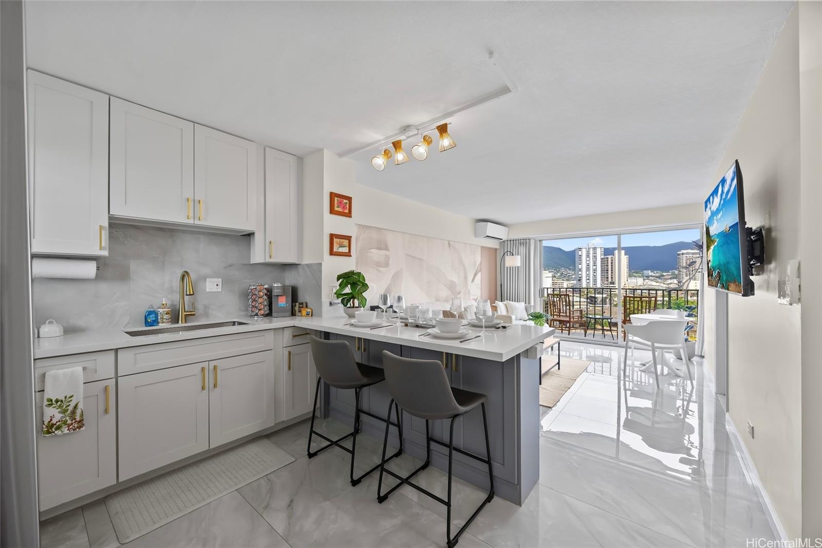 カイマナ・ラナイスの高層階にある、美しく明るい角部屋へようこそ!1ベッドルーム、1バスルーム、屋根付き駐車場1台分付き。 新品の冷蔵庫、コンロ、食器洗い機、洗濯機、乾燥機、生ごみ処理機、キャビネット金具、バスルームの設備、トイレ ...