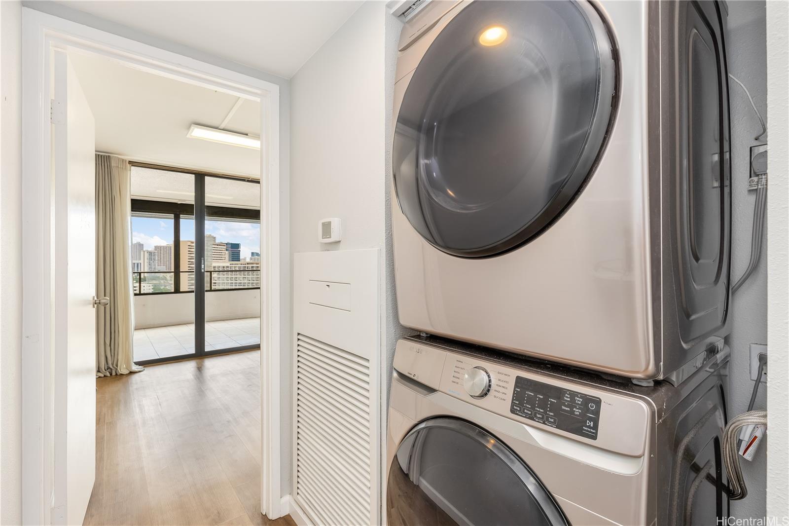 Welcome to Royal Iolani, a highly sought-after condominium perfectly situated near Waikiki, Ala Moana, and Iolani School. This spacious 2-bedroom, 2-bath corner unit on the 19th floor offers sweeping views of the ocean, Ala Wai Canal, Waikiki Beach, and the Honolulu city skyline. Enjoy cool trade winds and beautiful sunsets from your extra large 331 sqft covered lanai—perfect for relaxing, entertaining, and outdoor dining. The open-concept living area features floor-to-ceiling windows, upgraded laminate flooring, and a modern renovated kitchen with stainless steel appliances and granite countertops. Resort-style amenities include a pool, jacuzzi, sauna, BBQ areas, tennis courts, fitness center, dog park, kids playground, and 24-hour security. Comes with 1 covered parking stall and all utilities are already included in the maintenance fee. Assessment already paid off in full for a lower monthly maintenance fee compared to other units. Don’t miss this rare opportunity to experience convenient city living in peace, comfort, and style at Royal Iolani#1907. Schedule your showing today!