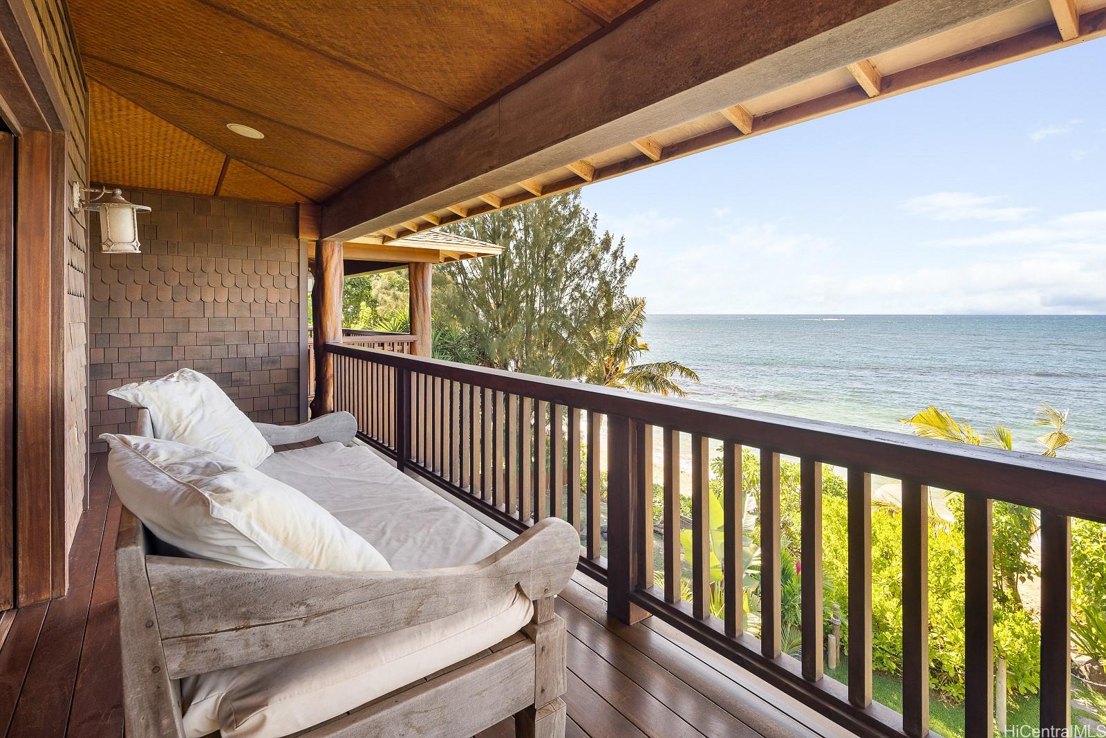 Custom built Bali style Oceanfront custom home with exceptional ocean and mountain views from multiple oversize Lanais. Live in your own resort surrounded by high end finishes. Hardwoods such as African Mahogany, Teak and Ohio woods in addition to natural stone are fitted throughout the home. The chef’s kitchen is completed with high end appliances including a Viking stove, large island and a beautiful wraparound bar area perfect for entertaining.This home is architect designed to capture as many views and as much light as possible. Glass is used frequently and with deliberate intention to capturing as many view plans as possible. Heavily Insulated walls and brand new mini splits A/C throughout for year round comfort. The private yard is a tropical oasis which has direct sandy beach out front. The oversize 2car garage has plenty of room for vehicles plus all your ocean and sports equipment storage . A roll up door opens on the oceanside offering an another entertaining area or rec room. Convenient hike and bike path in the neighborhood. Close to Haleiwa, shopping, restaurants, world class surfing and easy accessibility to Honolulu and the airport.
