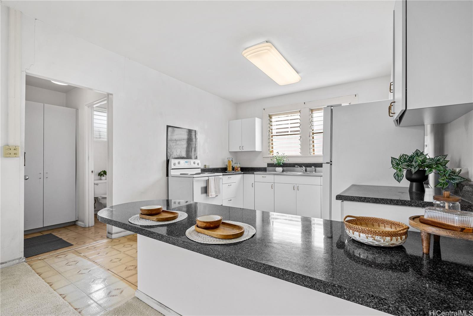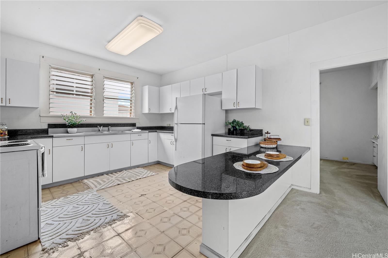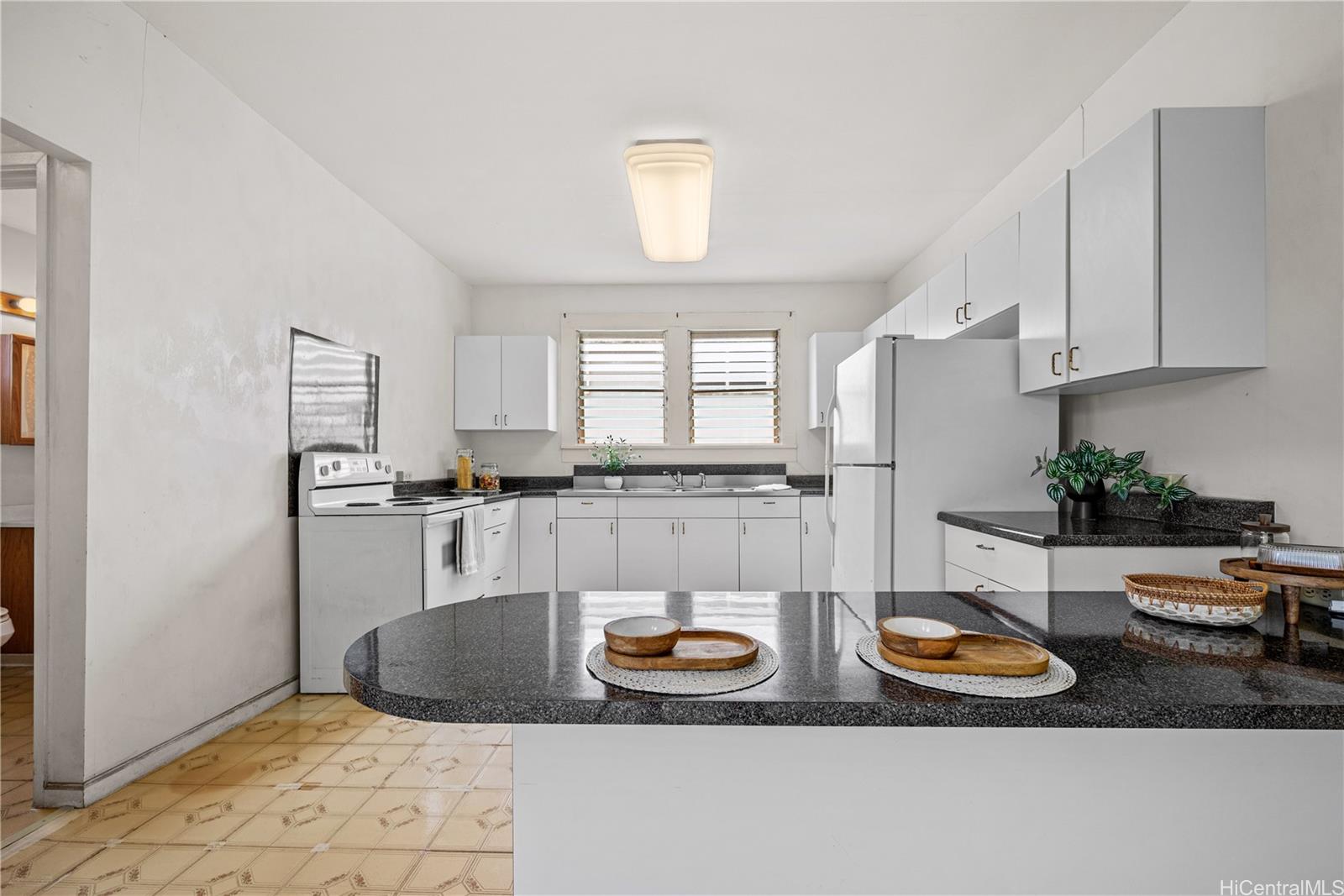 Don’t miss this charming 2-bedroom, 2-bath single-family home in the heart of Kaimuki, just behind Diamond Head Theatre. You’ll love the high ceilings and open floor plan that includes an extra large kitchen with eat-on peninsula that opens seamlessly to the living area. There are lots of windows in every room, offering cool cross breezes and lots of natural light. This home has been loved by generations of the same family and is now ready for your personal touch. Enjoy the privacy of being at the end of a little lane with a covered parking space under a shared carport, and a gated yard with room to play and grow. Located close to shops, dining, and neighborhood favorites. Property is being sold in its As-Is condition.