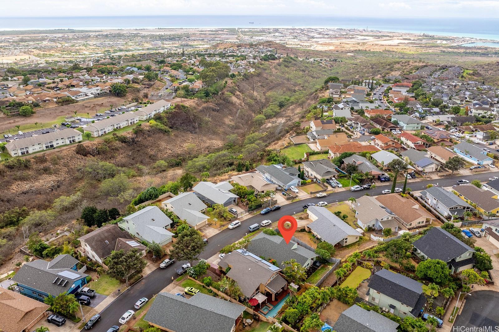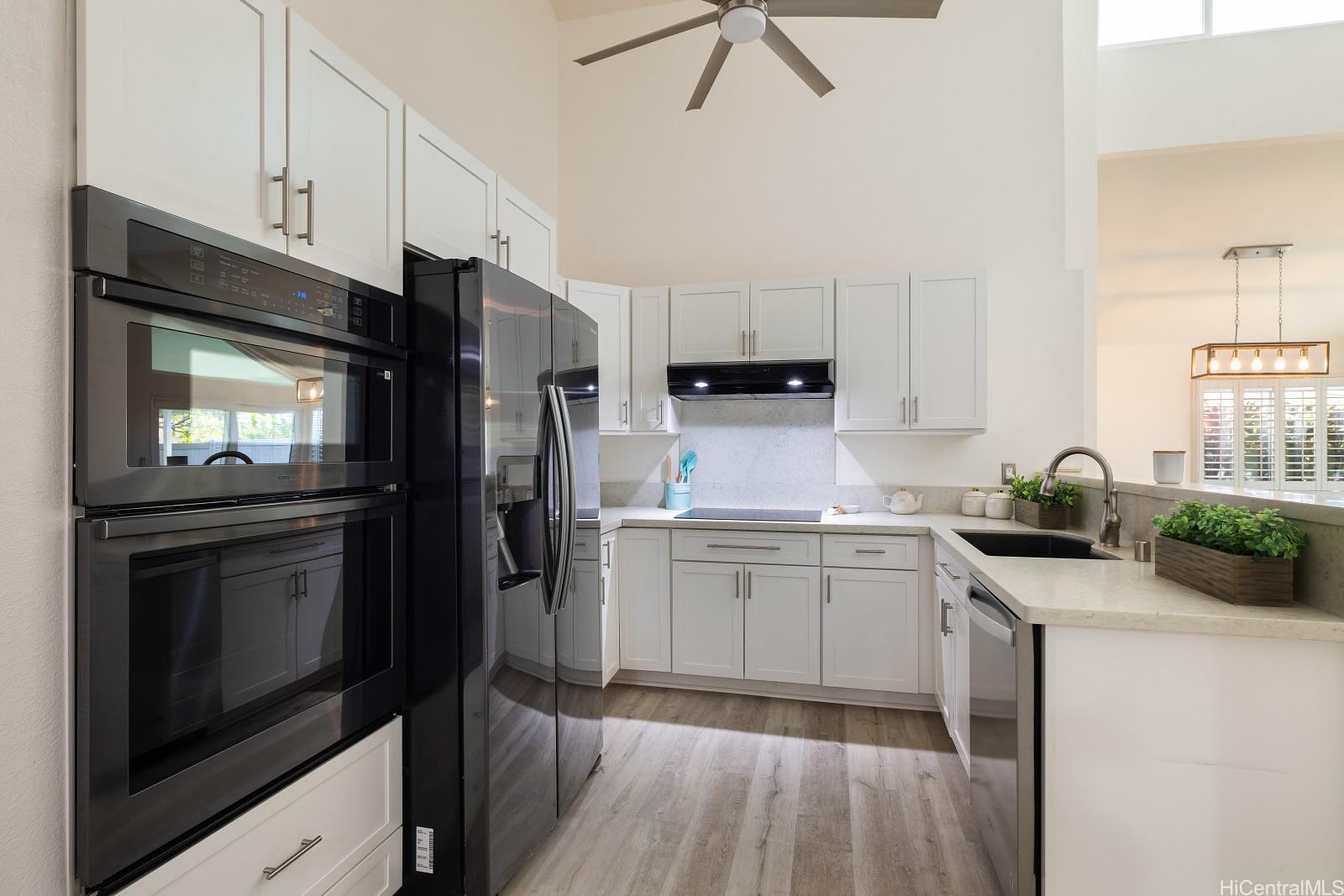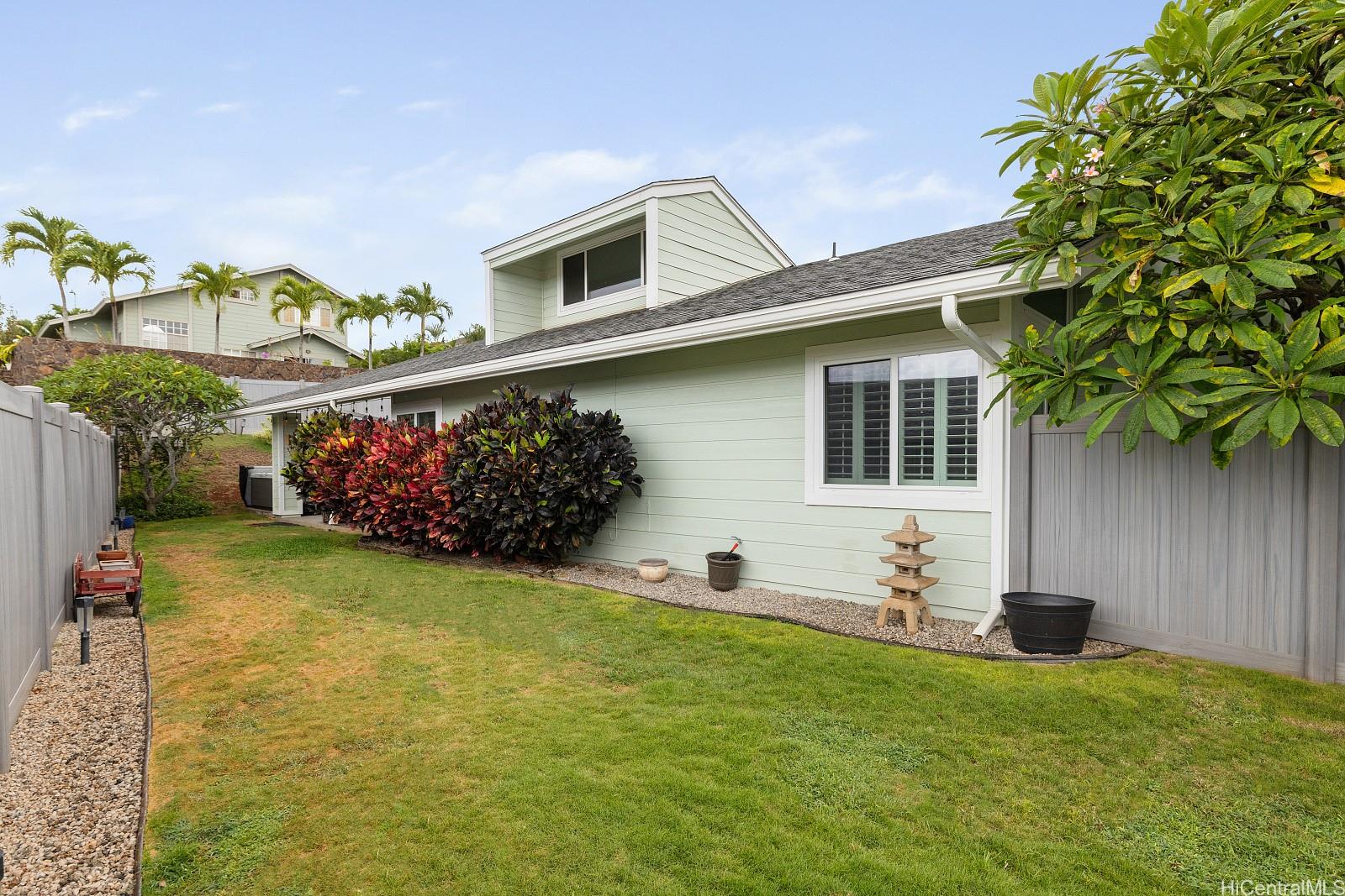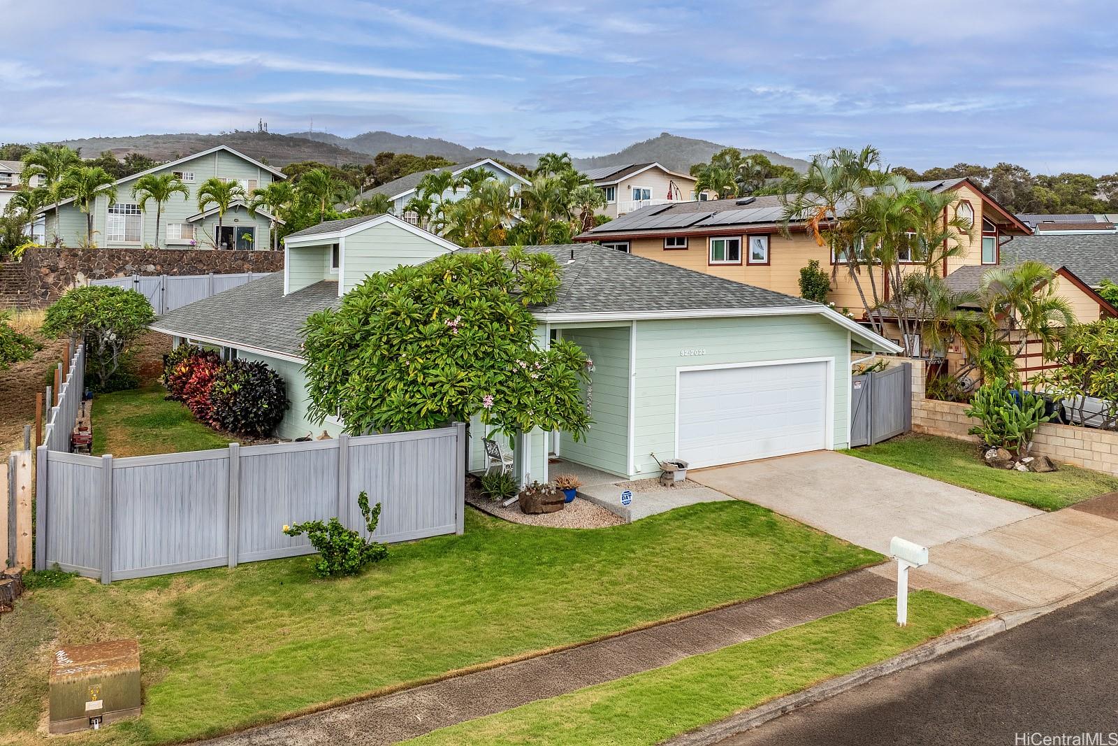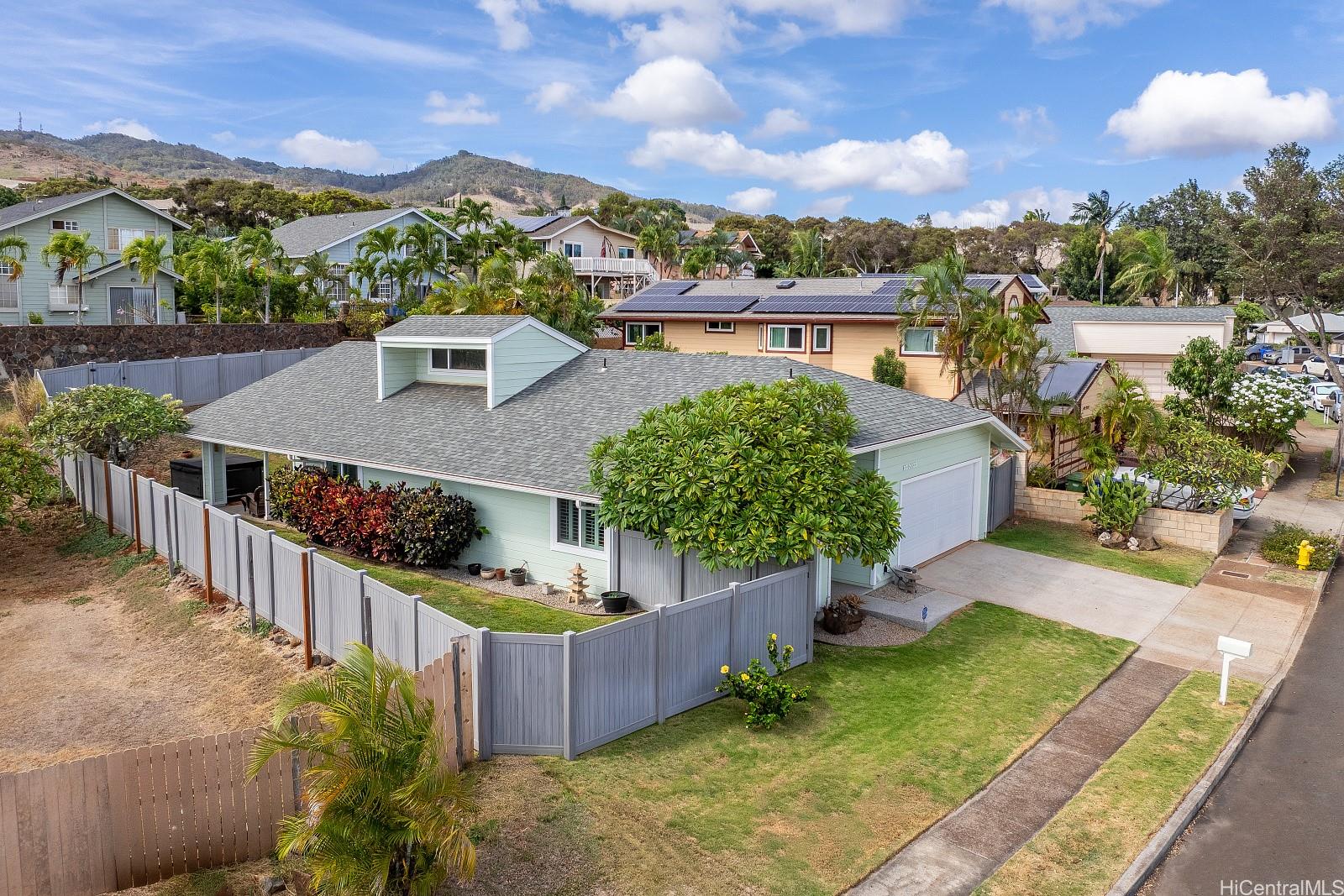 Elegant and spacious single level 3 bedroom 2 bath home located in upper Makakilo with over 6,000 square feet of land and spacious front and back yards with newer vinyl fence for privacy and pets. Enjoy the vaulted ceilings and all new windows throughout which provide ample natural light and boast plantation shutters. This home features a remodeled kitchen with hardwood cabinets, pull-out pantry shelves and soft close doors, quartz countertops and newer appliances. The open kitchen design includes bar top seating as well as a separate breakfast nook. The Primary suite is spacious with luxury vinyl plank floors and Corian finishings complete the new accessible shower in the en suite bath. Two guest rooms share a guest bath and are carpeted. Throughout the home you’ll find split A/Cs in the living room and bedrooms, Luxury Vinyl plank flooring, fresh paint, newer windows and sliding doors, new closet doors and an asphalt shingle roof was installed in 2019. This home gives meaning to the phrase turnkey! Relax under your large covered lanai, enjoy gardening around the property, long soaks in your hot tub and the easy maintenance of an epoxy floor.