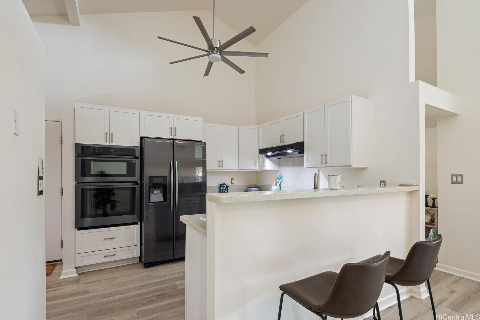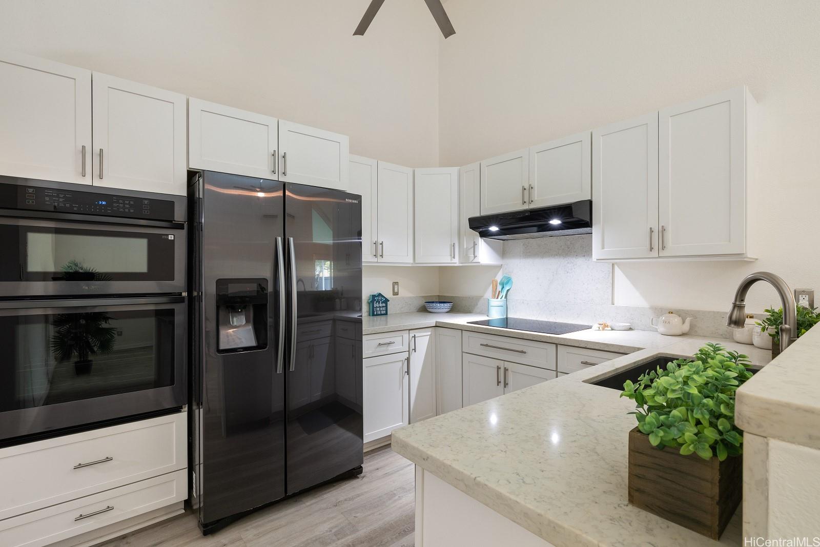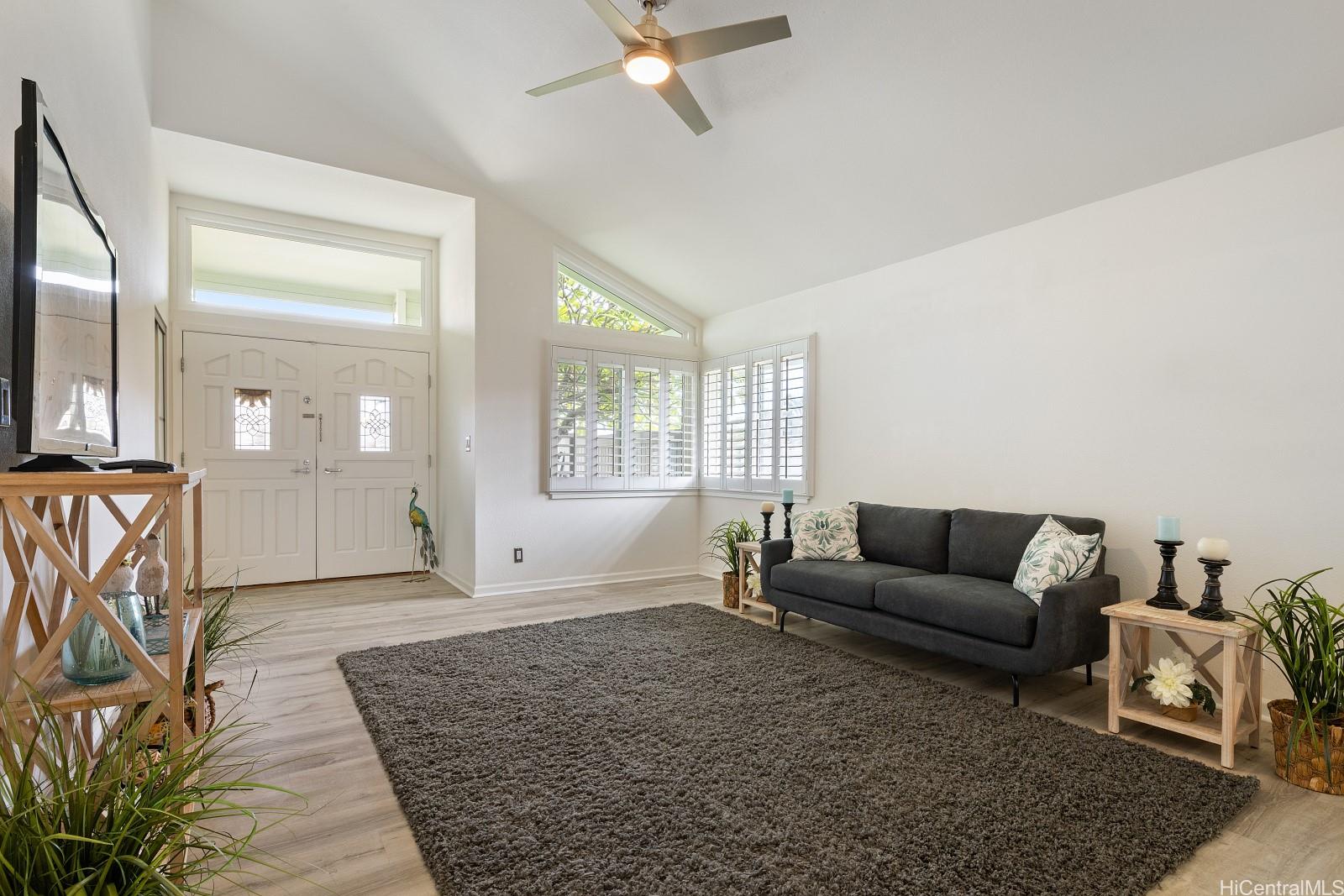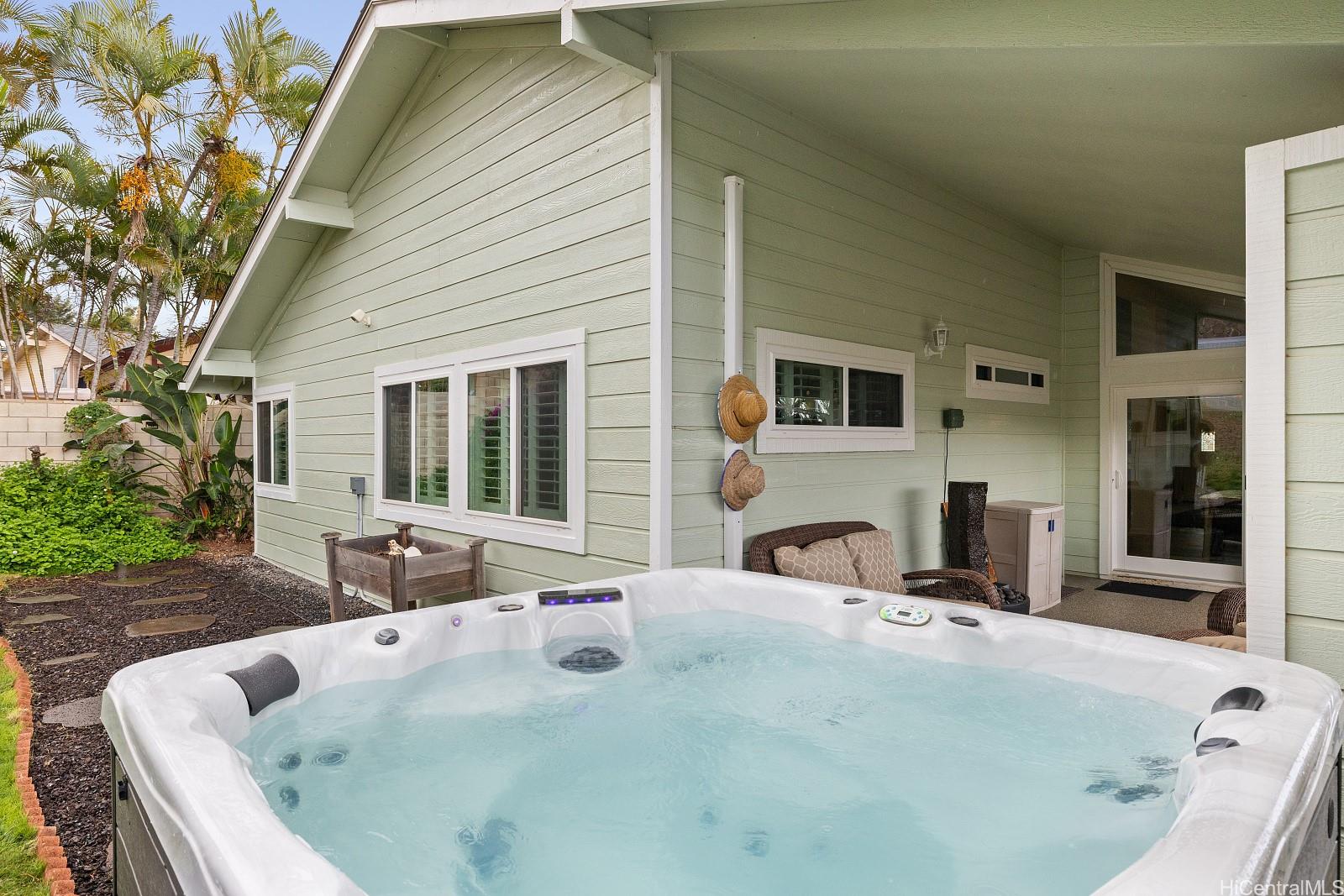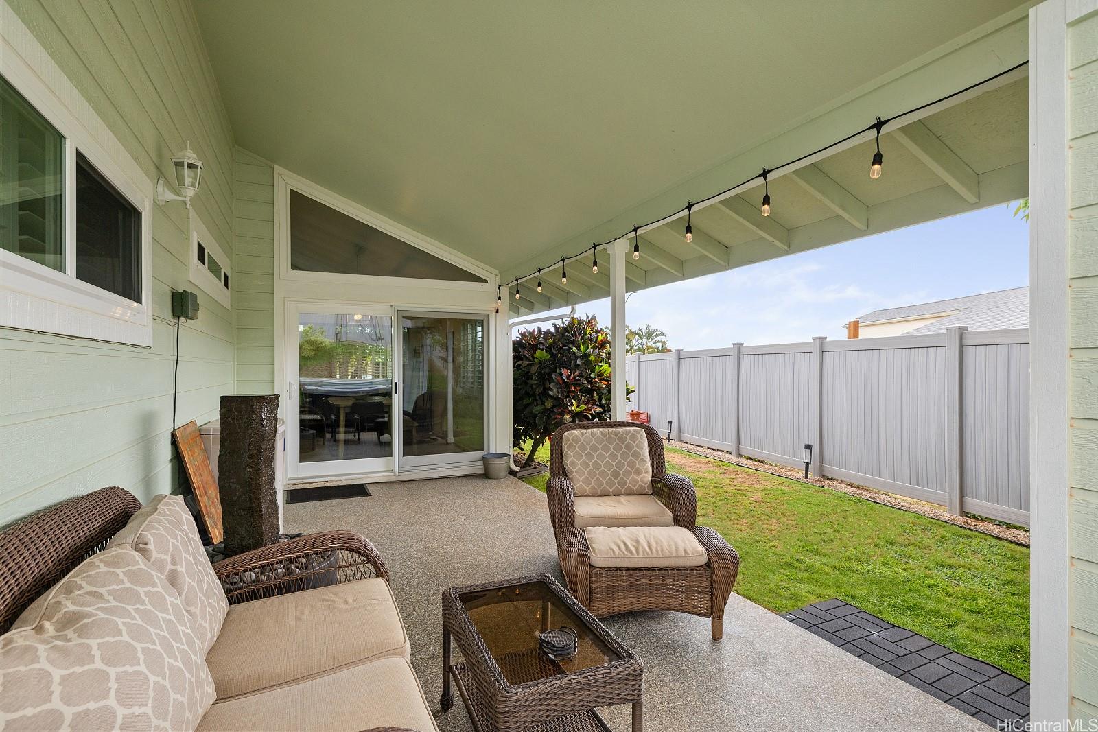 Elegant and spacious single level 3 bedroom 2 bath home located in upper Makakilo with over 6,000 square feet of land and spacious front and back yards with newer vinyl fence for privacy and pets. Enjoy the vaulted ceilings and all new windows throughout which provide ample natural light and boast plantation shutters. This home features a remodeled kitchen with hardwood cabinets, pull-out pantry shelves and soft close doors, quartz countertops and newer appliances. The open kitchen design includes bar top seating as well as a separate breakfast nook. The Primary suite is spacious with luxury vinyl plank floors and Corian finishings complete the new accessible shower in the en suite bath. Two guest rooms share a guest bath and are carpeted. Throughout the home you’ll find split A/Cs in the living room and bedrooms, Luxury Vinyl plank flooring, fresh paint, newer windows and sliding doors, new closet doors and an asphalt shingle roof was installed in 2019. This home gives meaning to the phrase turnkey! Relax under your large covered lanai, enjoy gardening around the property, long soaks in your hot tub and the easy maintenance of an epoxy floor.