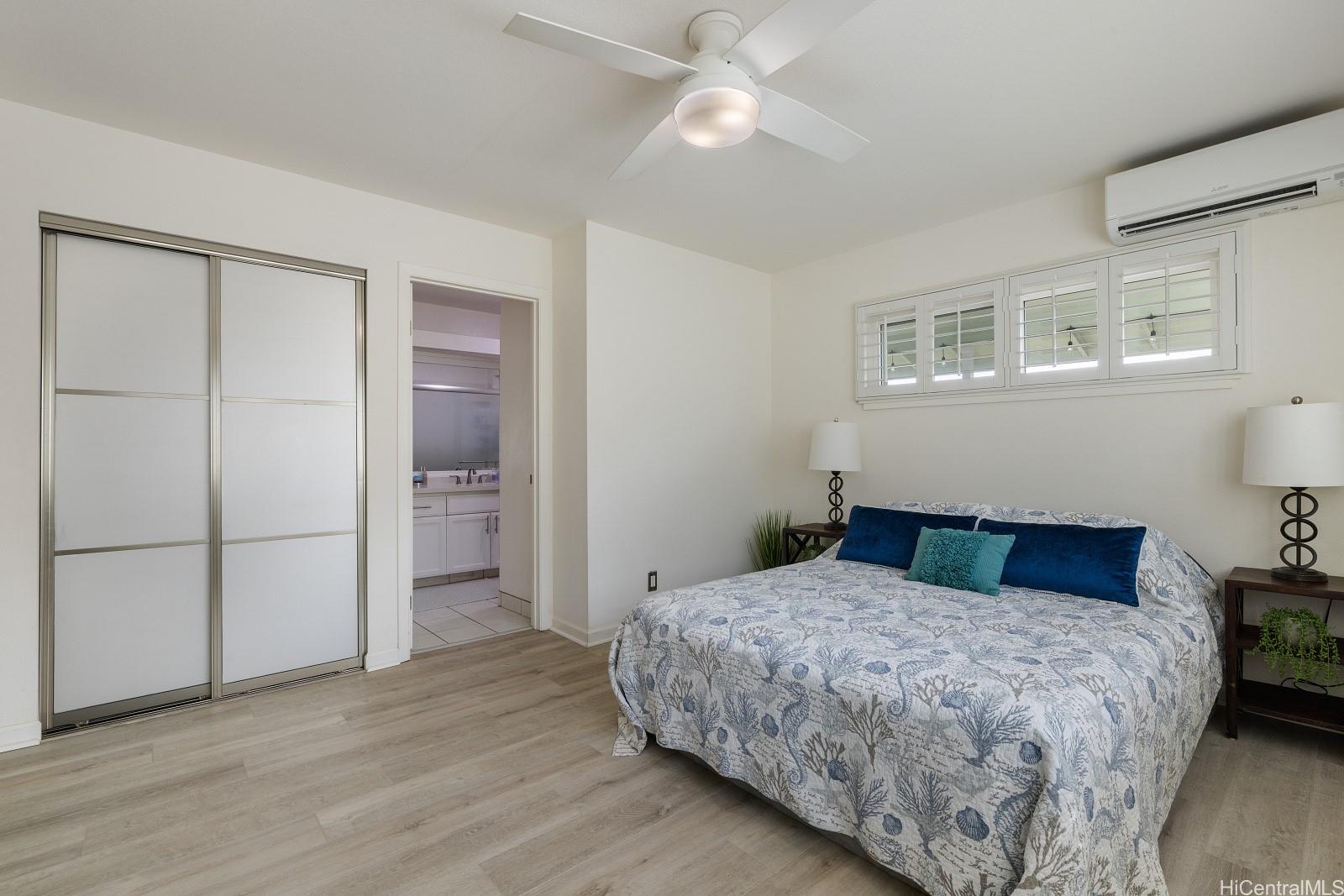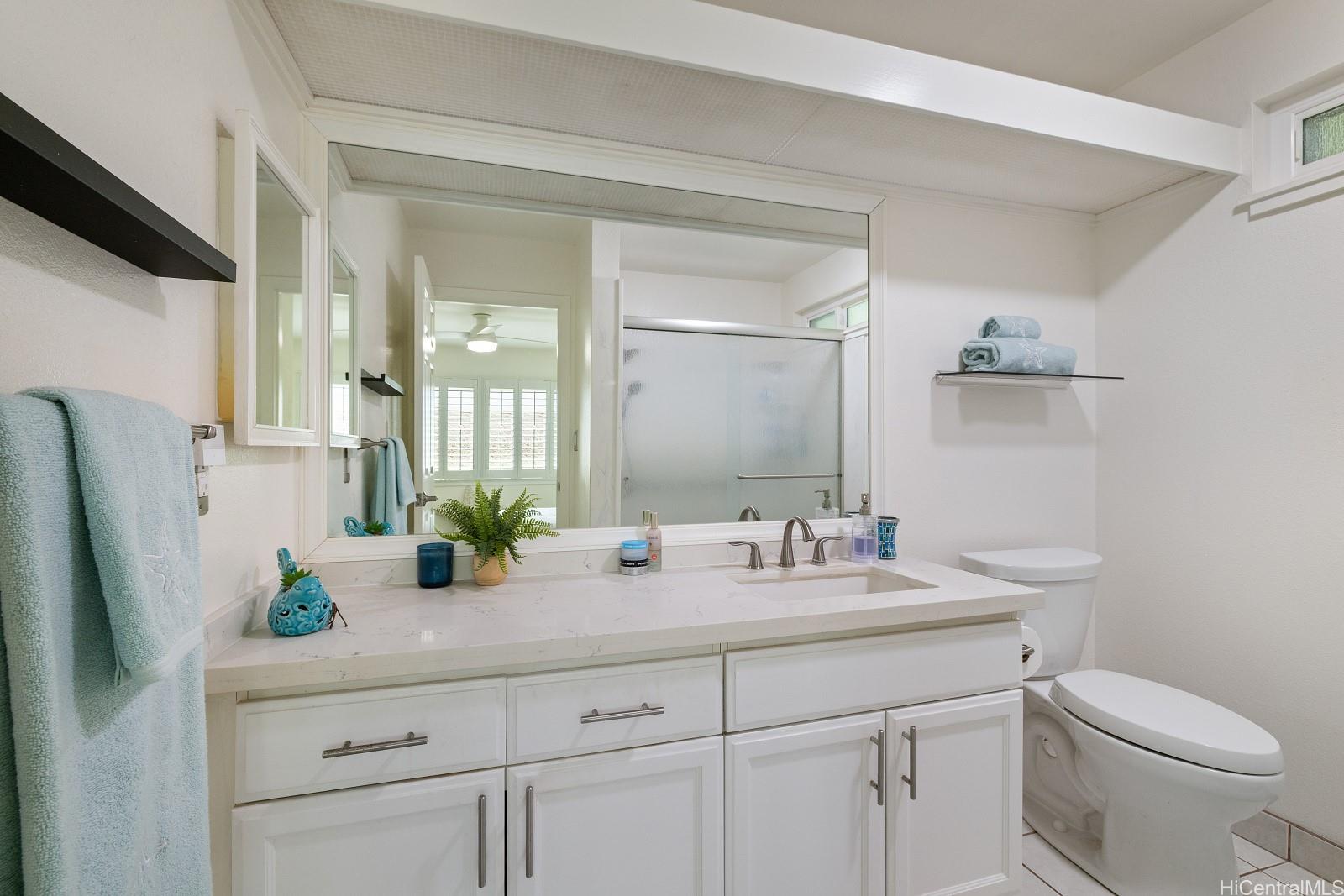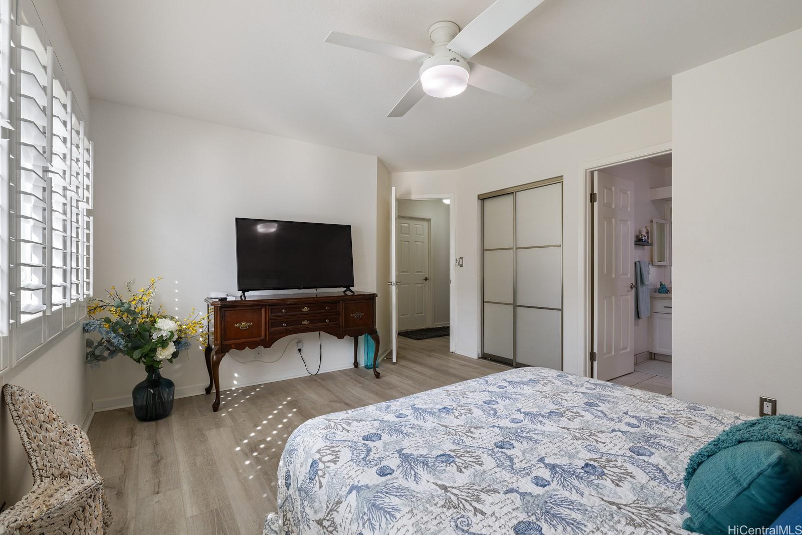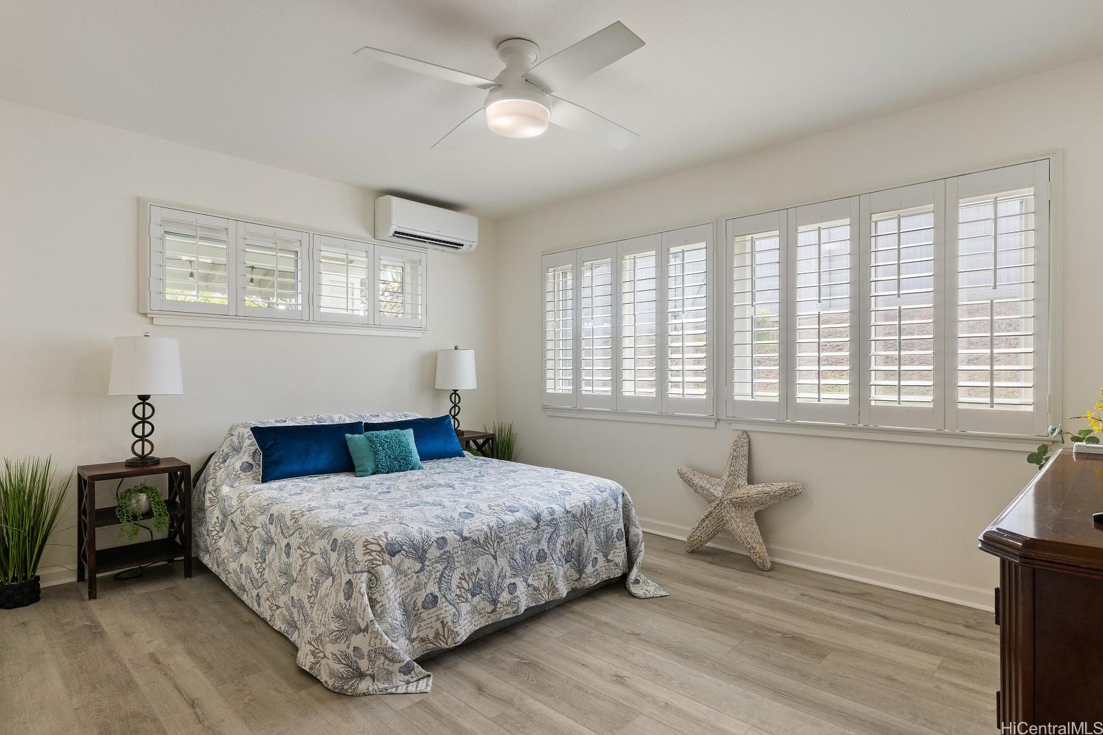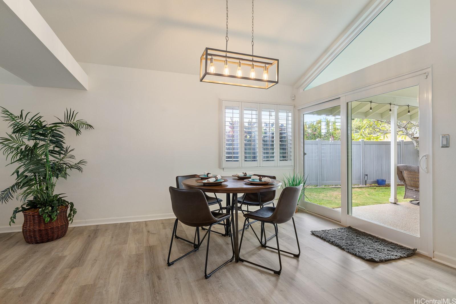 Elegant and spacious single level 3 bedroom 2 bath home located in upper Makakilo with over 6,000 square feet of land and spacious front and back yards with newer vinyl fence for privacy and pets. Enjoy the vaulted ceilings and all new windows throughout which provide ample natural light and boast plantation shutters. This home features a remodeled kitchen with hardwood cabinets, pull-out pantry shelves and soft close doors, quartz countertops and newer appliances. The open kitchen design includes bar top seating as well as a separate breakfast nook. The Primary suite is spacious with luxury vinyl plank floors and Corian finishings complete the new accessible shower in the en suite bath. Two guest rooms share a guest bath and are carpeted. Throughout the home you’ll find split A/Cs in the living room and bedrooms, Luxury Vinyl plank flooring, fresh paint, newer windows and sliding doors, new closet doors and an asphalt shingle roof was installed in 2019. This home gives meaning to the phrase turnkey! Relax under your large covered lanai, enjoy gardening around the property, long soaks in your hot tub and the easy maintenance of an epoxy floor.