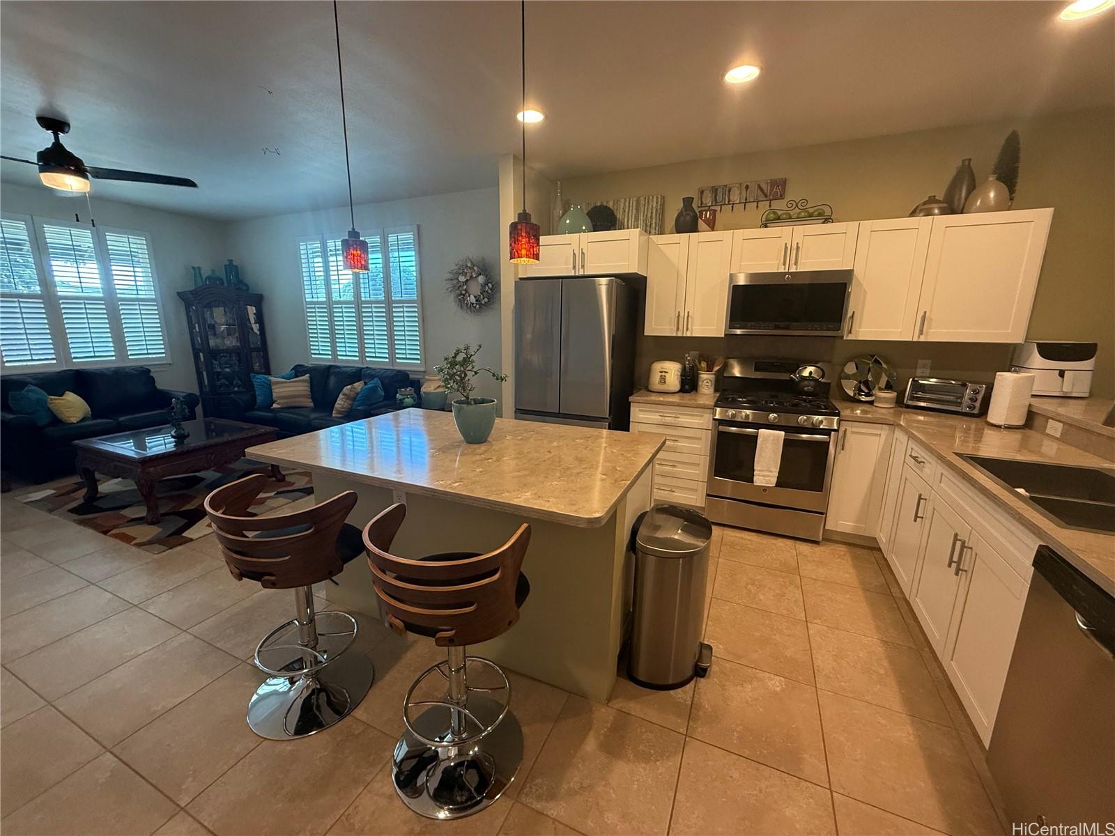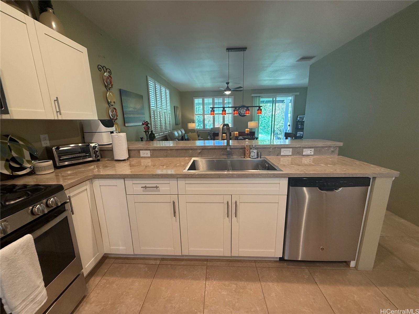 Easy living in this spacious 3 bed/ 2 bath single level Ewa Beach home. 1,608 sq ft of comfort with automated control of your irrigation, HVAC, security, photovoltaic, and lanai Sonos speaker systems. Gas lines for cooking, clothes dryer and on-demand water heater cuts use of electricity. Electricity collected by owned solar panels. Landscaped with irrigation system feeding your lawn and gardens with ornamental plants, two calamansi trees and one tangerine tree. Meticulously cared for, this one-owner home is beautiful. Call your Realtor to book your “by appointment only” showing. This is it!
