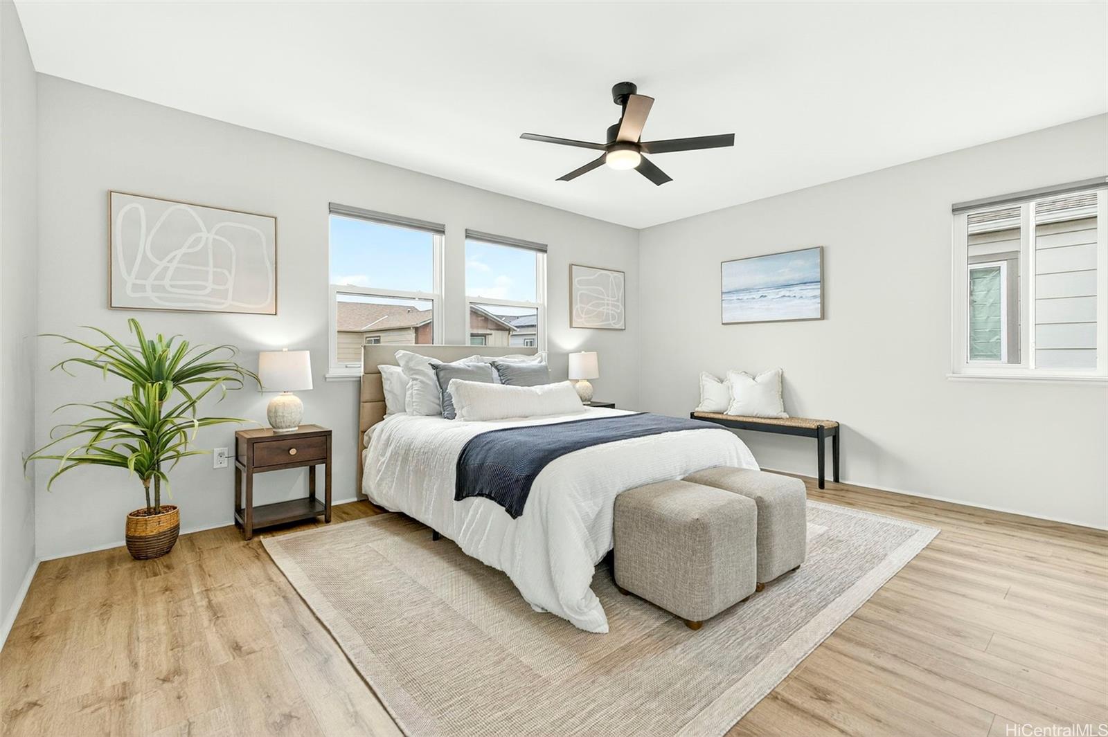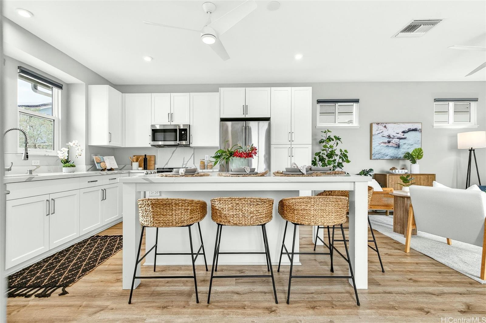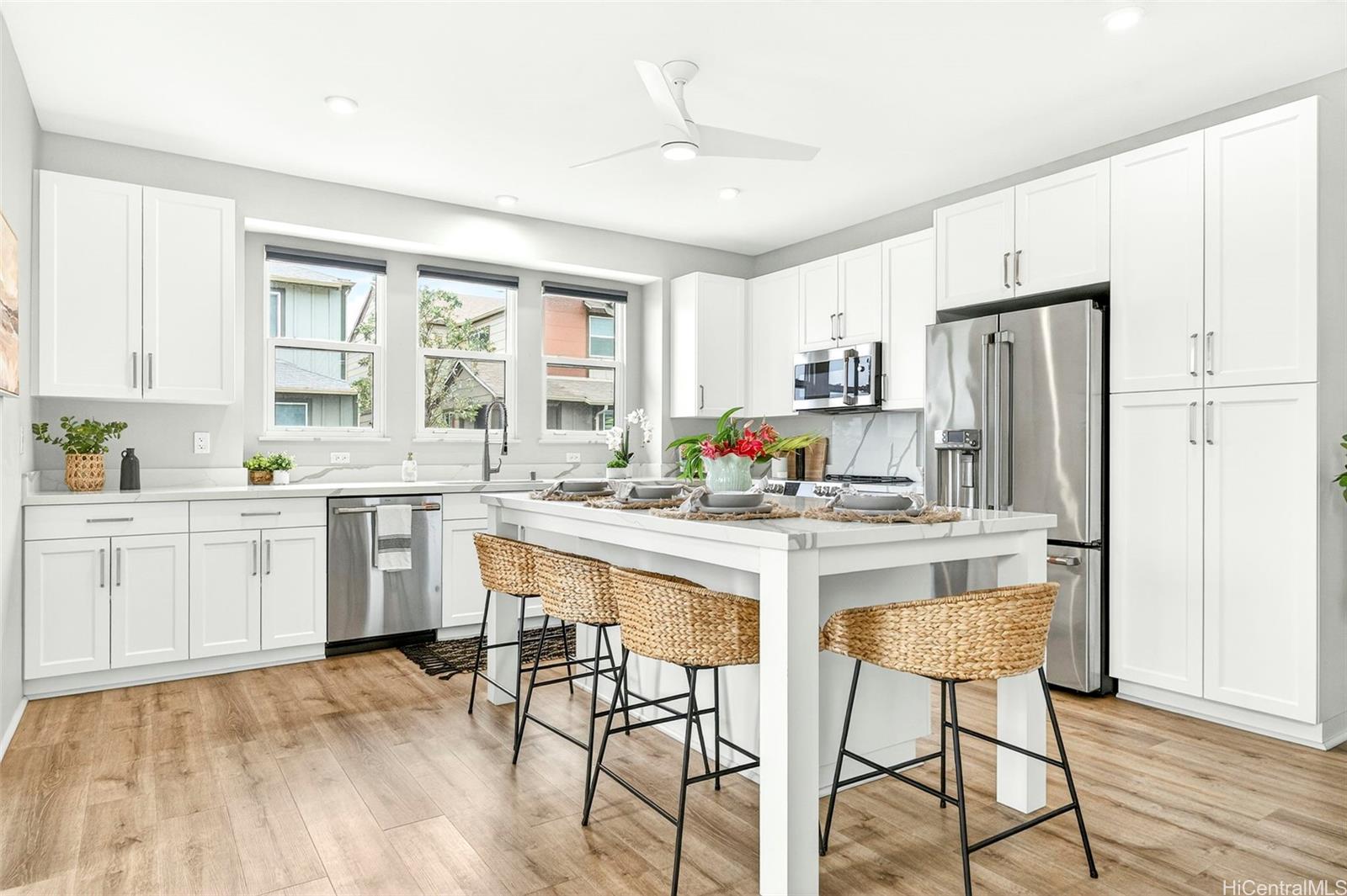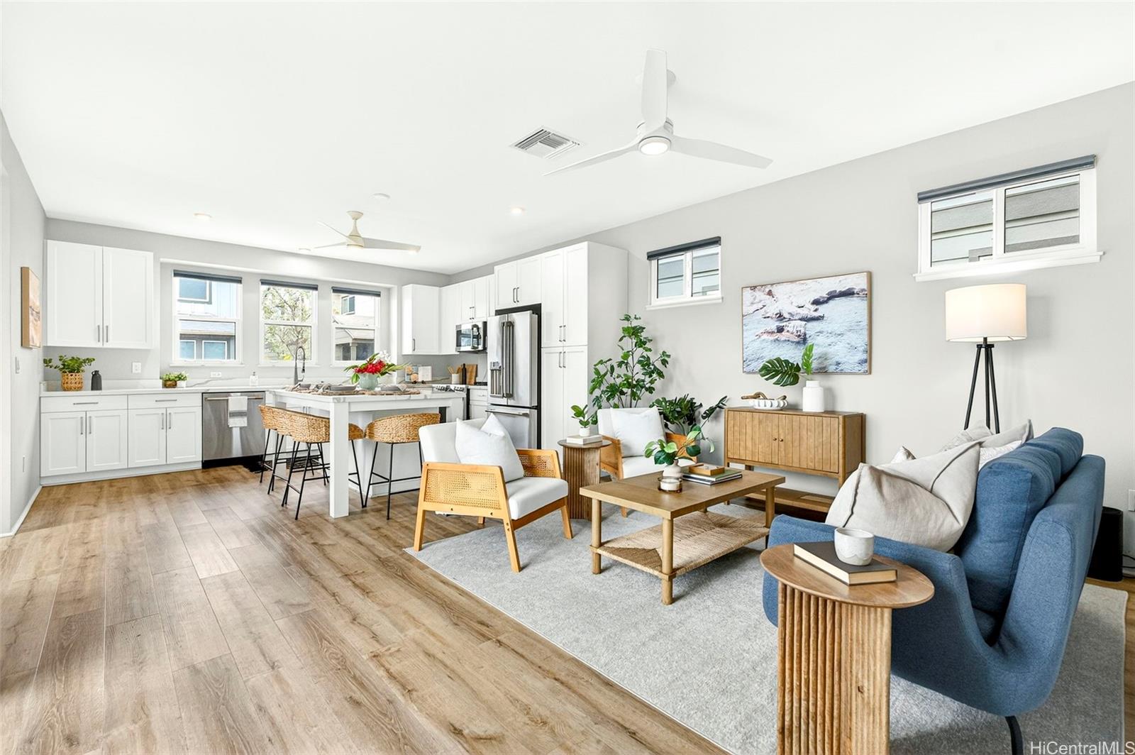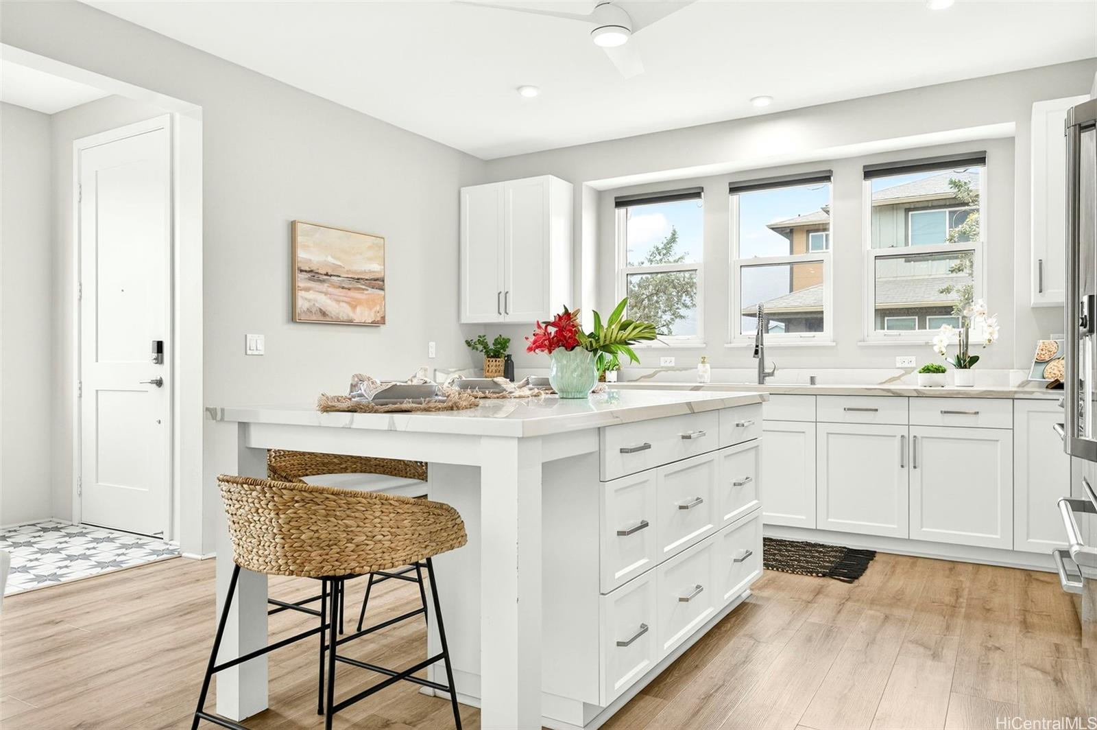 人気のカウル地区へようこそ!築浅の3ベッドルーム、2. バスルーム5室を備えた一戸建て住宅は、1,673平方フィートの洗練された居住空間を誇り、モダンなスタイルとプライバシーを両立させています オープンコンセプトのレイアウトには、天井高9フィート、全室に敷かれた高級ビニールプランクフローリング、特注のタイル仕上げ、そして多目的に使えるボーナスロフトが備わっています。 キッチンは、白いシェーカー調のキャビネット、クォーツ製のカウンター、そしてグレードアップされたGE Caféの家電が特徴で、日々の生活や来客をもてなすのに最適です。 PV SOLARとTESLA POWERWALLのバッテリーバックアップシステムをリースして、ご自宅のセントラルエアコンを稼働させながら電気代を節約し、安心な生活をお楽しみください。 緑地帯沿いの角地に位置し、近隣にはわずか5軒の住宅があるこの物件は、片側に隣家がなく、より一層のプライバシーが確保されています。 美しく手入れされた庭は、プロの手によって設計されており、最新式の散水システム、飛び石、緑豊かな熱帯植物、そして2つのコンクリート製ラナイが備わっています。ゲストをもてなすのに最適です!フェンスで囲まれたプライベートな裏庭の隠れ家で、デラックスジャグジーに浸かりながら、ゆったりとくつろいでください。 H-1からわずか数分の便利な立地にあり、ビーチやショッピングエリアへも簡単にアクセスでき、 .