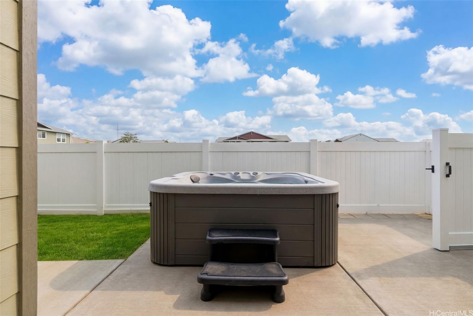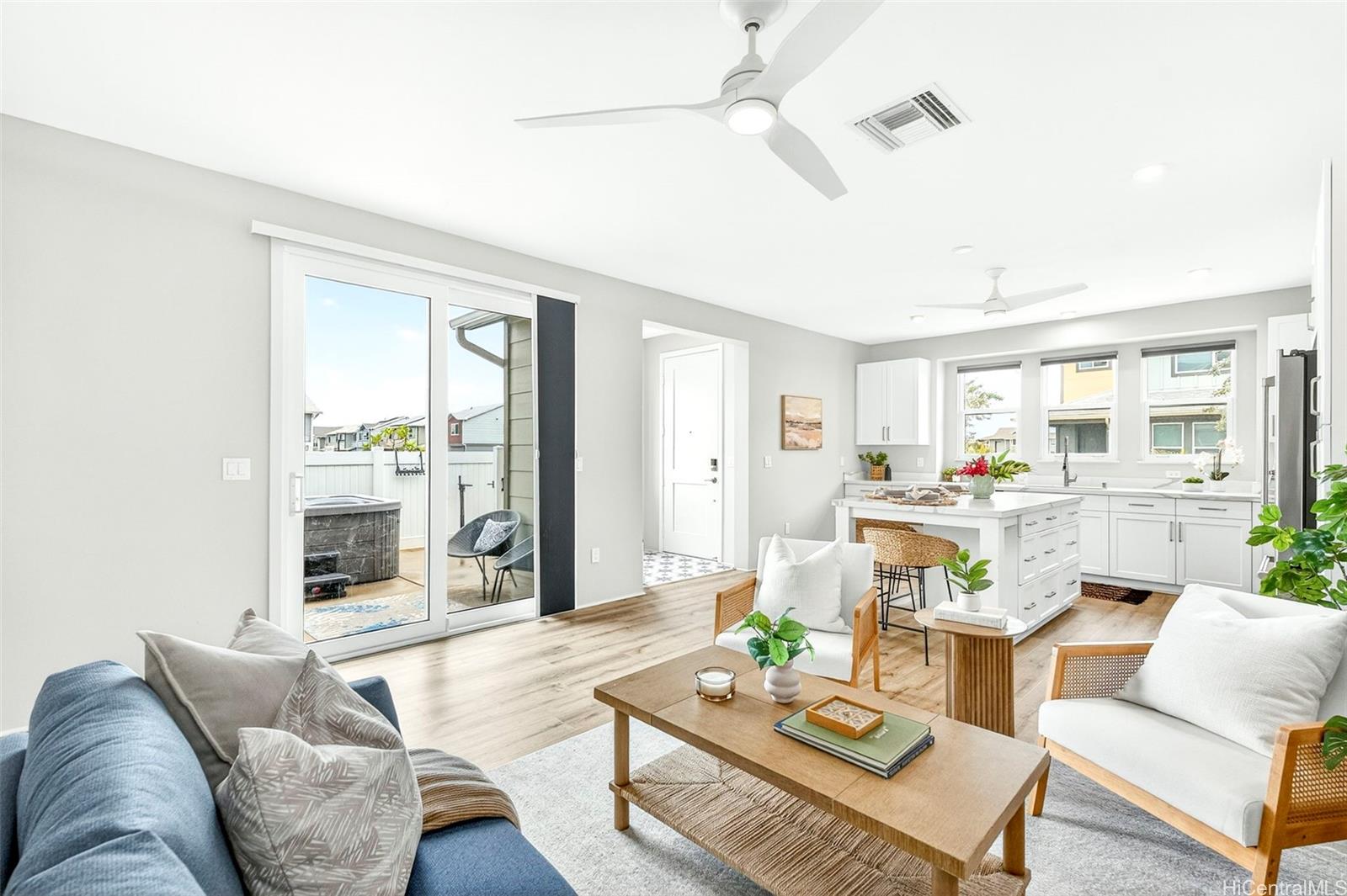 Welcome to the highly sought-after Ka’ulu neighborhood! This newer 3-bed, 2.5-bath single-family home offers 1,673 sq ft of thoughtfully designed living space, blending modern style, privacy & energy efficiency. The open-concept layout features 9-ft ceilings, luxury vinyl plank flooring throughout, custom tile work, and a versatile BONUS LOFT. The kitchen is a true standout with white shaker cabinetry, quartz counters, and upgraded GE Café appliances, perfect for everyday living and entertaining. Enjoy peace of mind with leased PV SOLAR and TESLA POWERWALL battery backup, helping reduce electricity costs while powering the home’s central A/C. Ideally situated on a CORNER LOT along a greenbelt with only five neighboring homes, the property offers added privacy with no neighbors on one side. The beautifully landscaped yard has been professionally designed with an upgraded sprinkler system, stepping stones, lush tropical plants, and two finished concrete lanais- perfect for entertaining! Unwind in the DELUXE JACUZZI in your private, fenced backyard retreat. Conveniently located just minutes from H-1, with easy access to beaches, shopping, & dining in the growing “2nd City” of Kapolei.