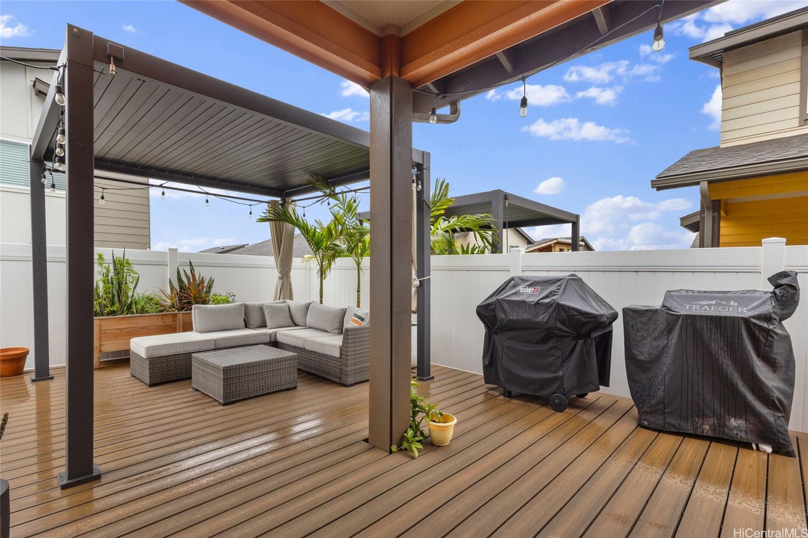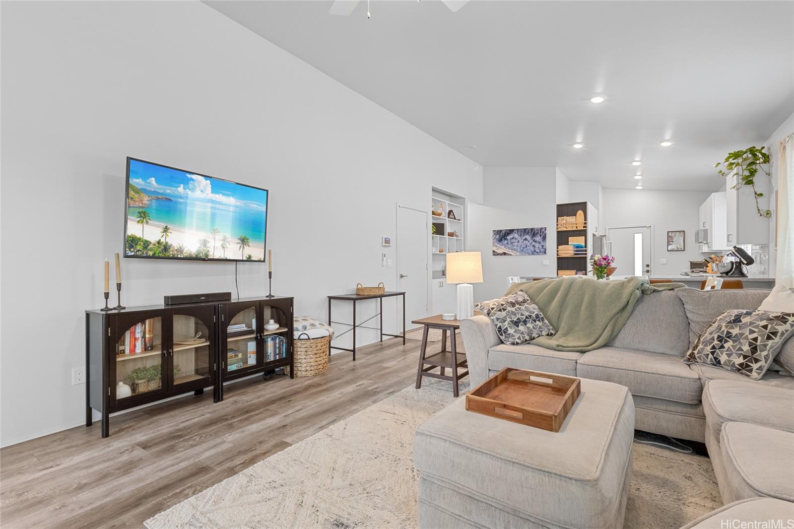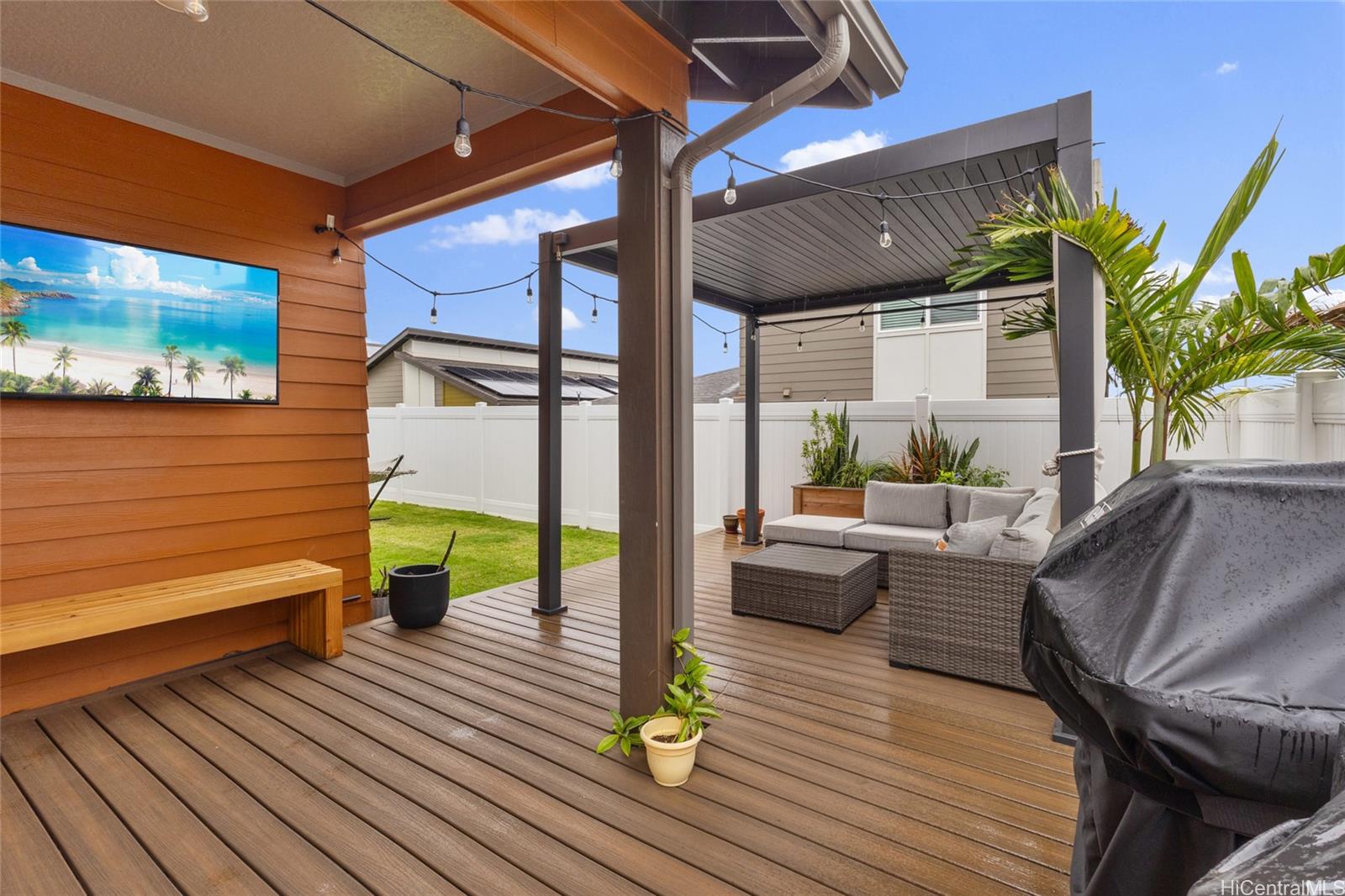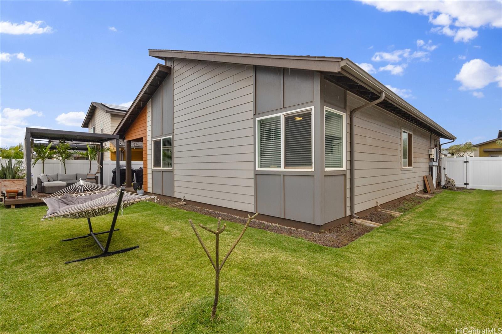 Welcome to Hoopili! This 3 bed 2 bathroom home is exactly what you have been looking for and it checks all the boxes! The modern open concept living space with huge vaulted ceilings is filled with natural light and character which makes it feel like home. The kitchen includes plenty of storage space and a beautiful new cutting board wall. The three bedrooms are spacious and include split AC systems. The primary bedroom closet includes plenty of space and built-ins. Step outside into an absolute oasis with a pergola, deck, and ample yard space. Host plenty of family and friends outside for a BBQ or inside the home with all of the space. The 2 car garage has a laundry sink and a washer and dryer and still allows plenty of space. The home includes a security system as well as 18 leased PV panels and 1 battery. Conveniently located in one of the most desirable neighborhoods in the Ewa Beach/Kapolei area, you are literally minutes away from dining, golf courses, playgrounds, and you have access to Farrington Highway and H-1 for an easy commute. Schedule a showing to come see it before it’s gone!