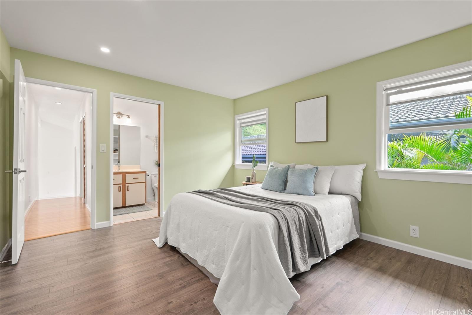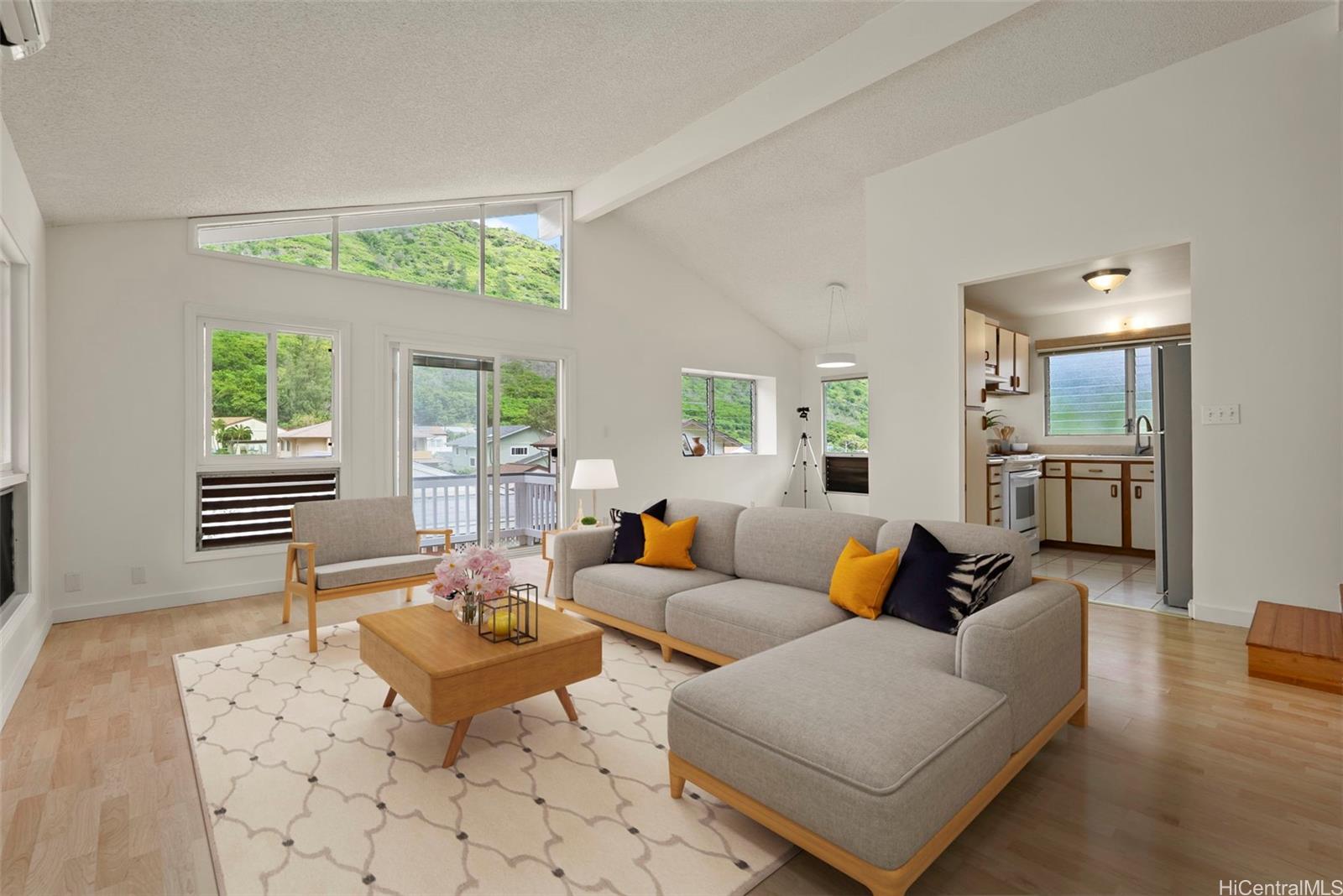 Experience true island-style living in East Honolulu in this immaculate 3-bedroom, 2-bathroom single-family home nestled in lush Kuliouou Valley. Built in 1988, this well-maintained residence features double-wall construction, an owned solar PV system with net metering agreement, fresh interior paint, luxury vinyl flooring, well-designed closet systems, and a beautifully renovated bathroom. Vaulted ceilings and recently installed vinyl double-pane windows fill the home with natural light while capturing cool valley breezes. Relax on your lanai and take in gorgeous ocean views. Ideally located near Kuliouou Beach Park, Costco, restaurants, and just a short drive to town. Move-in ready and offering exceptional value, this East Honolulu single-family home is not to be missed! A few photos have been virtually staged(enhanced).