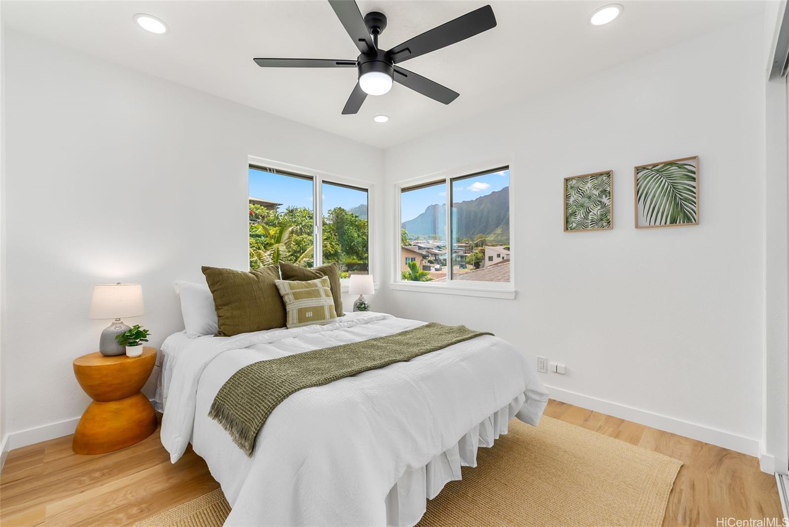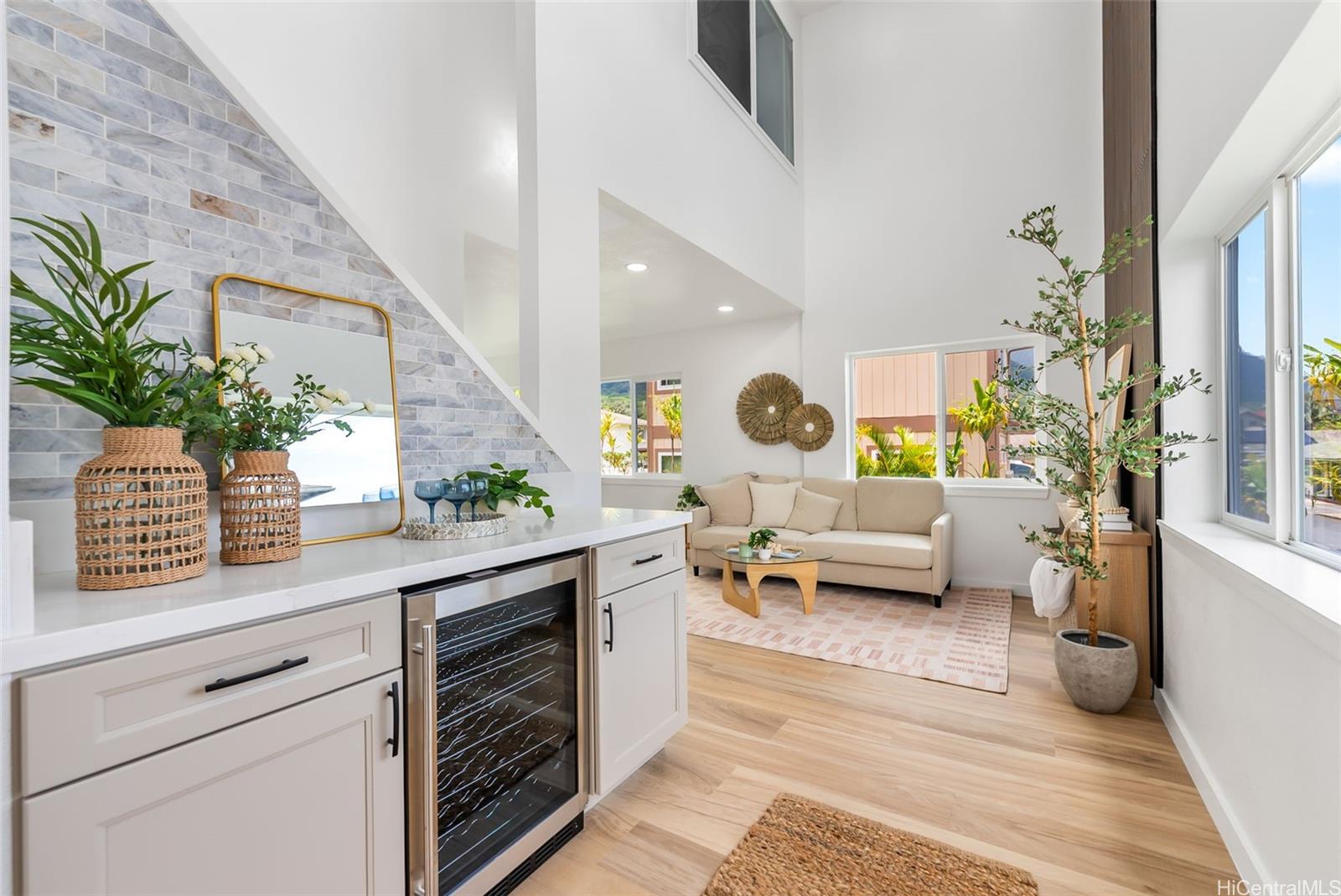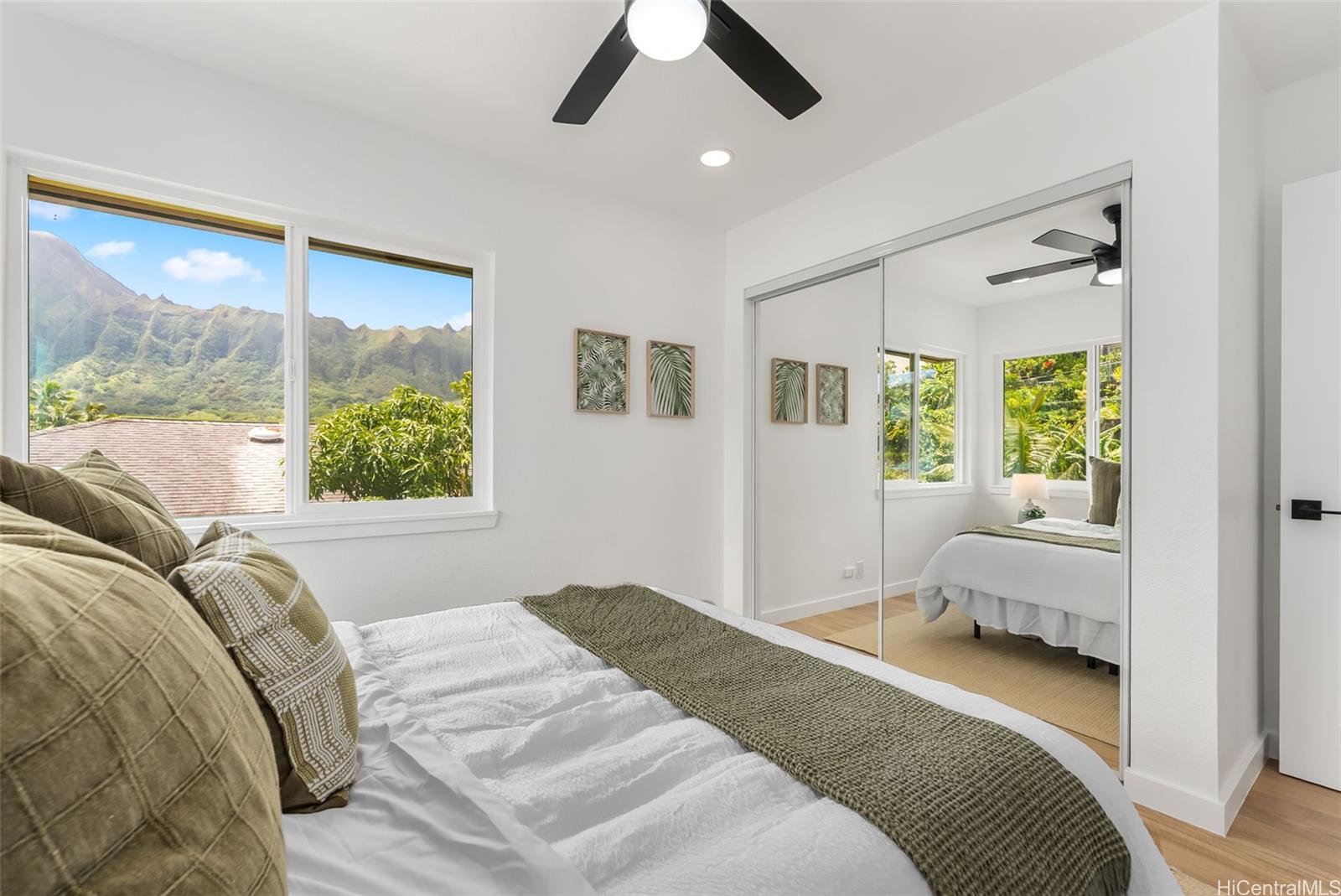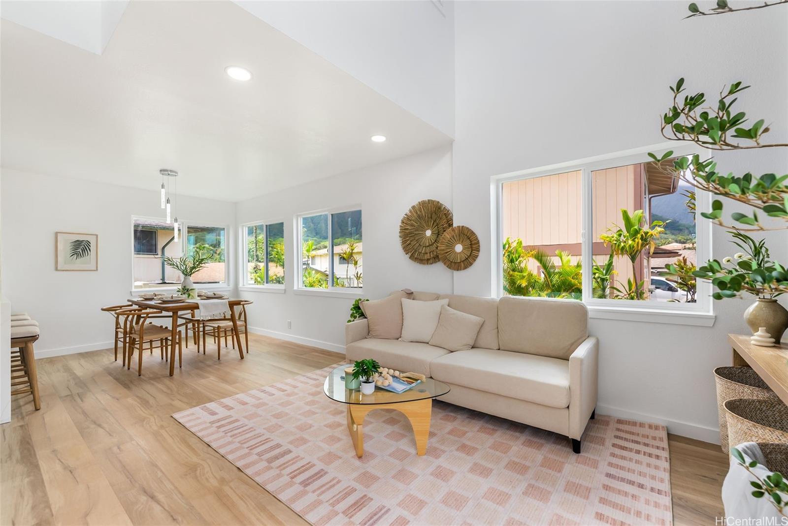 Sweeping views of the Koolau Mountain range create a stunning backdrop for this beautifully renovated 3-bedroom, 2½-bath home in the Keapuka neighborhood. Tucked within Kamooalii III Cluster, a gated community of just 22 homes built in 1990, this residence offers a rare sense of privacy, peace and elevated island living.Extensive upgrades include new vinyl plank flooring, a fully reimagined kitchen and bathrooms with elegant quartz countertops, new appliances, updated windows, ceiling fans, modern lighting and fresh paint throughout.Move-in ready and thoughtfully updated, this home invites you to relax and unwind in comfort while enjoying the tranquility and beauty of Kaneohe.