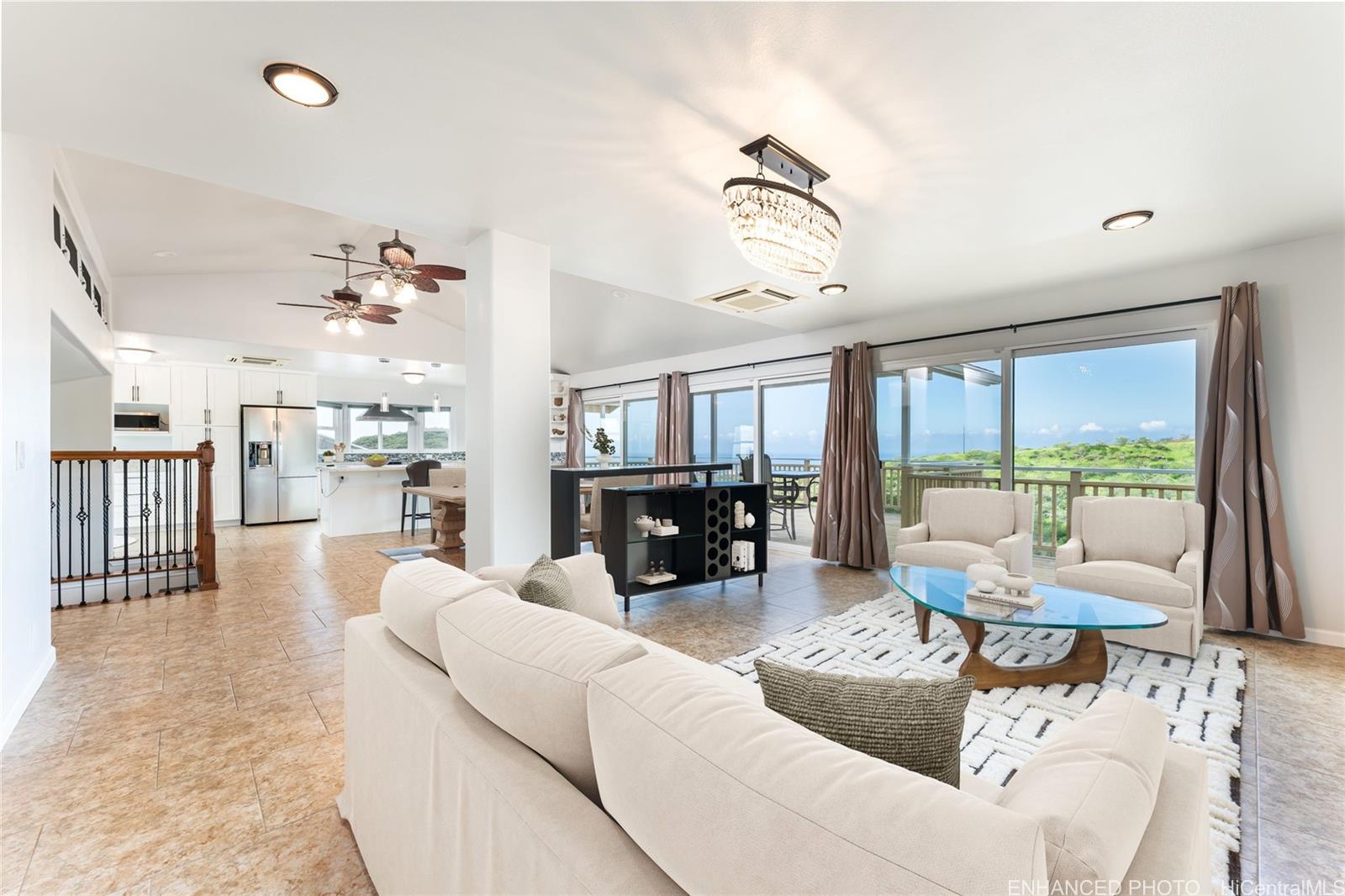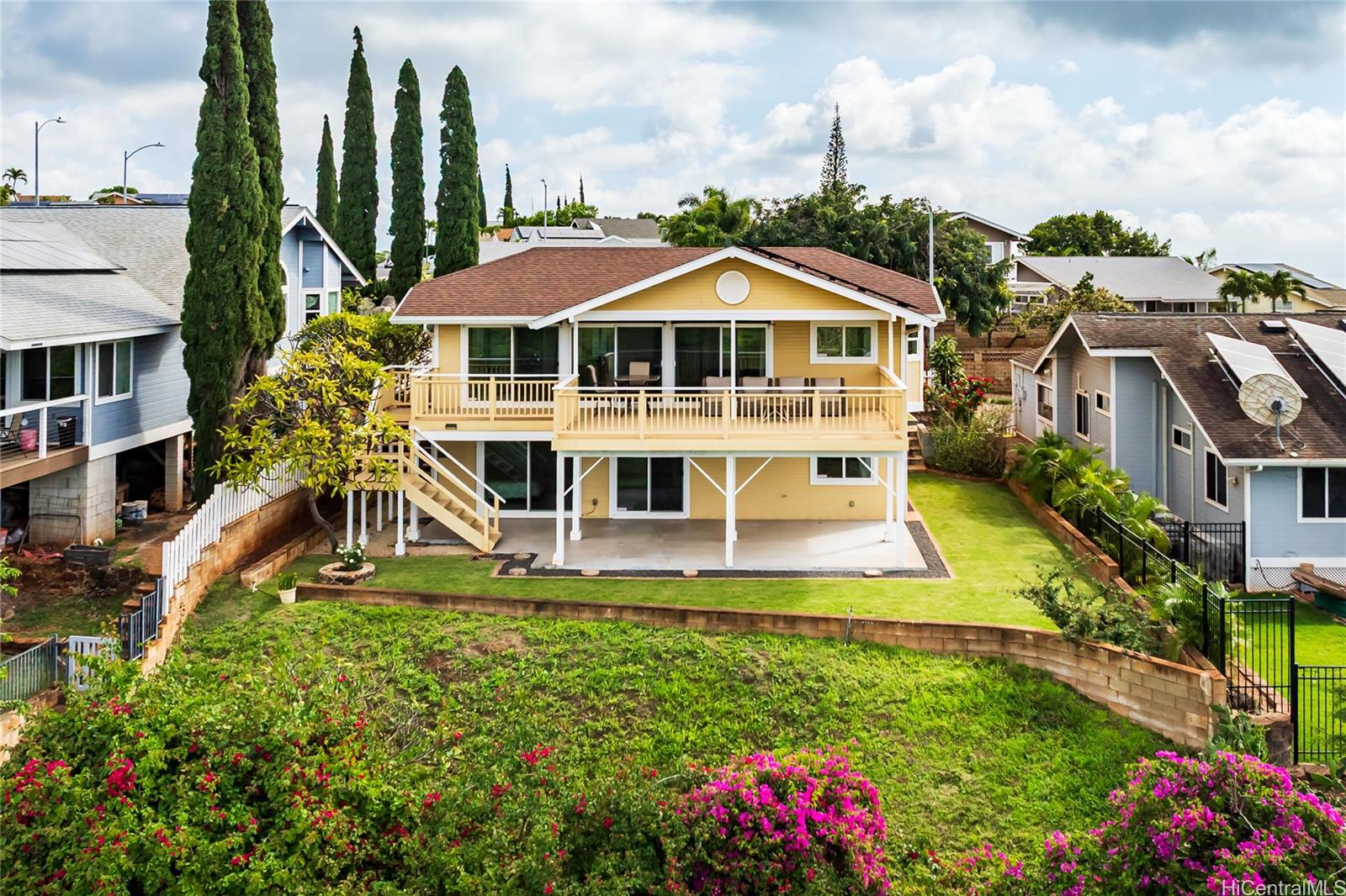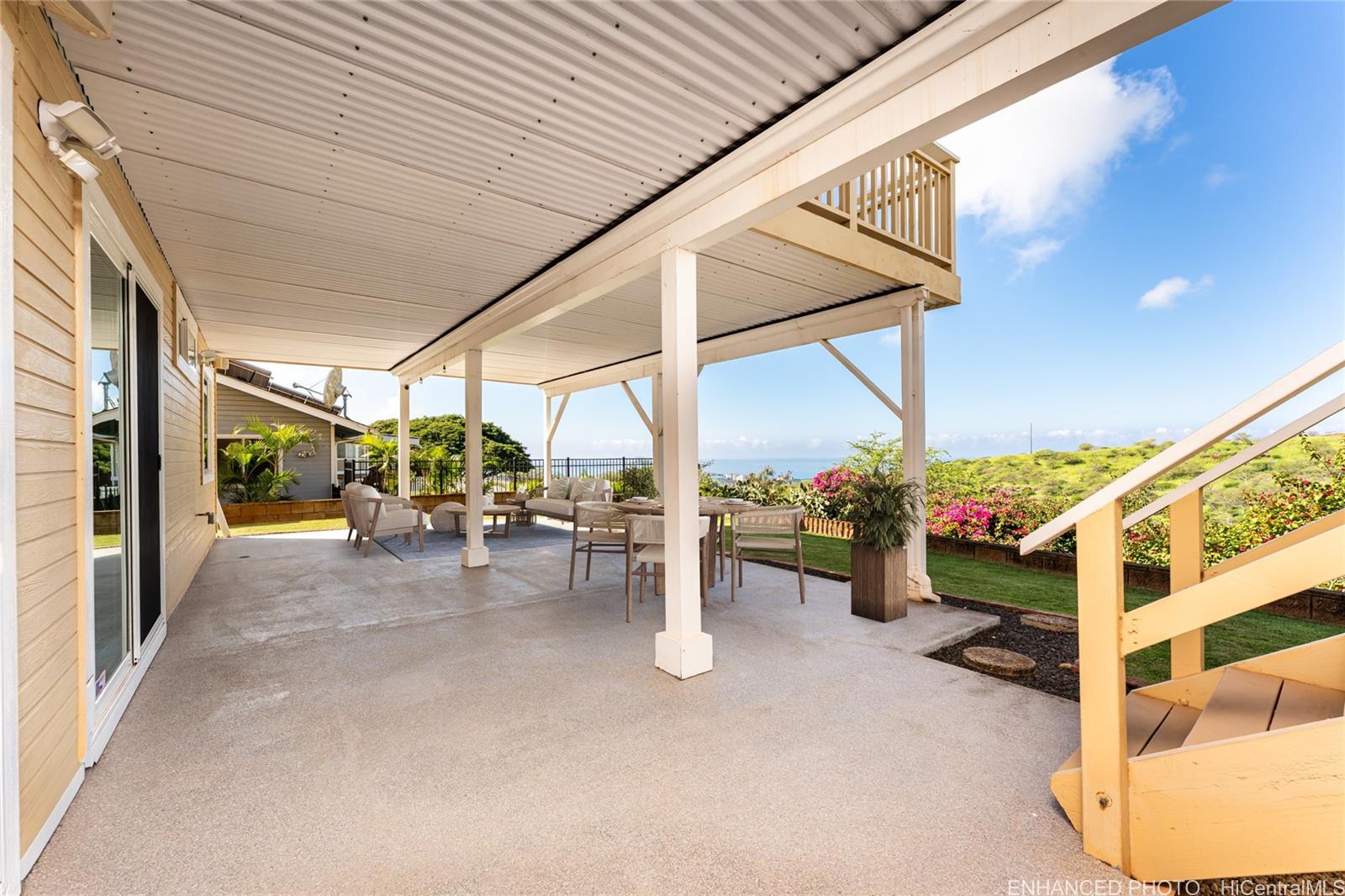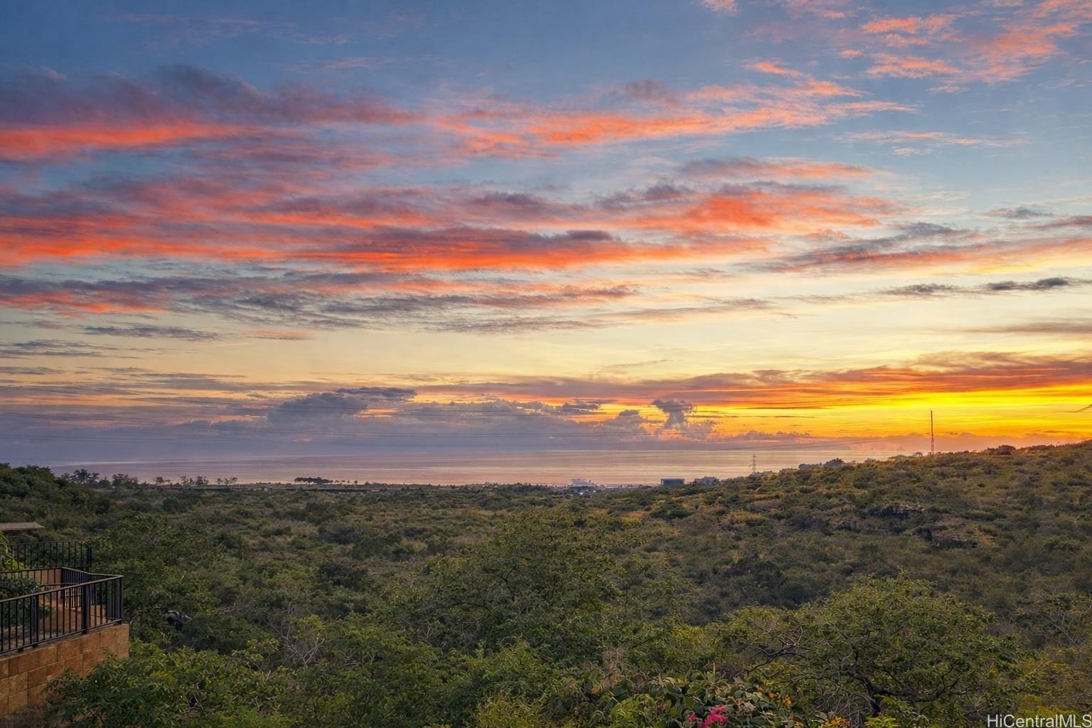 Beautifully upgraded 3bdrm, 3baths, two-story home on a rare perimeter (rim) lot in Makakilo with no rear neighbors. Enjoy panoramic west-facing views of sunsets, the ocean, coastline, and mountains. The main level features a spacious open living area that flows to a large lanai—perfect for indoor-outdoor living and entertaining in Makakilo’s cool breezes. Recent upgrades include a brand-new kitchen with new cabinetry and all-new appliances, fresh interior paint, modern finishes, and a spacious primary bedroom with a large closet. Additional features include porcelain tile flooring, split and ceiling-mounted A/C systems, and 20 leased solar PV panels with the lease paid in full. The system is on HECO Net Energy Metering (NEM), resulting in very low monthly electric costs. Enjoy multiple outdoor spaces, including a large covered main-level lanai, a lower-level patio, and a private backyard, all ideal for gatherings. This rim lot property offers the perfect blend of comfort, privacy, and breathtaking views, conveniently located minutes from Ka Makana Ali’i Mall, H-1 freeway access, restaurants, schools, bus stops and much more! (Some photos have been virtually staged/enhanced)