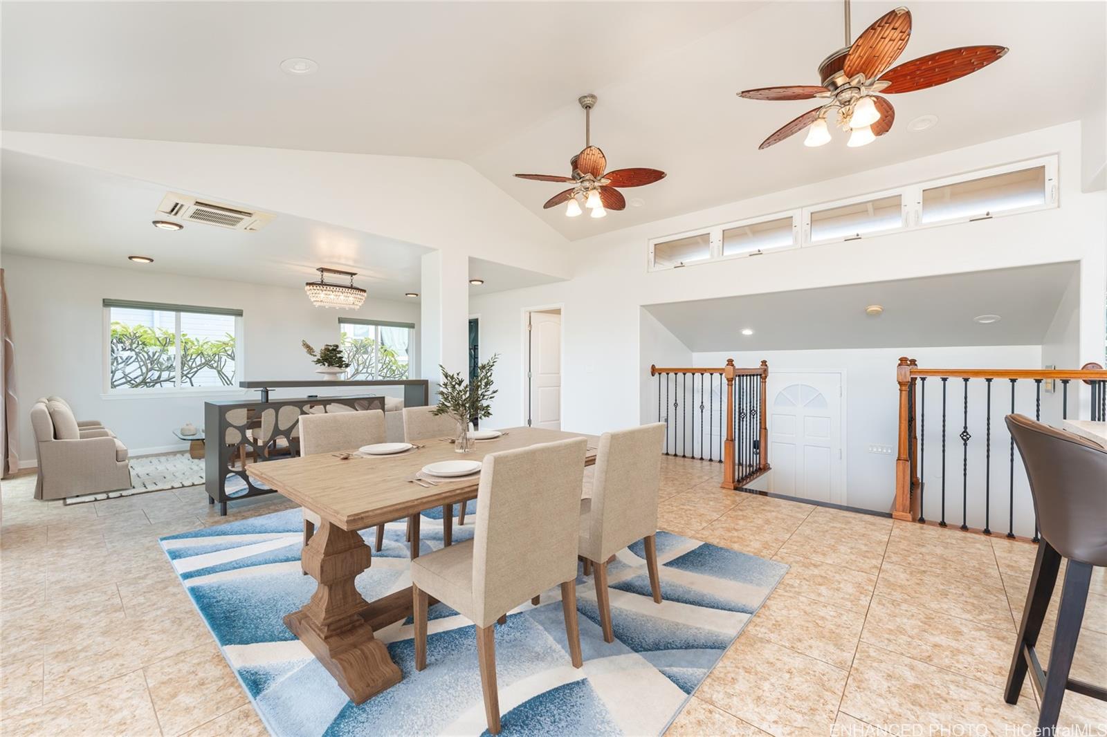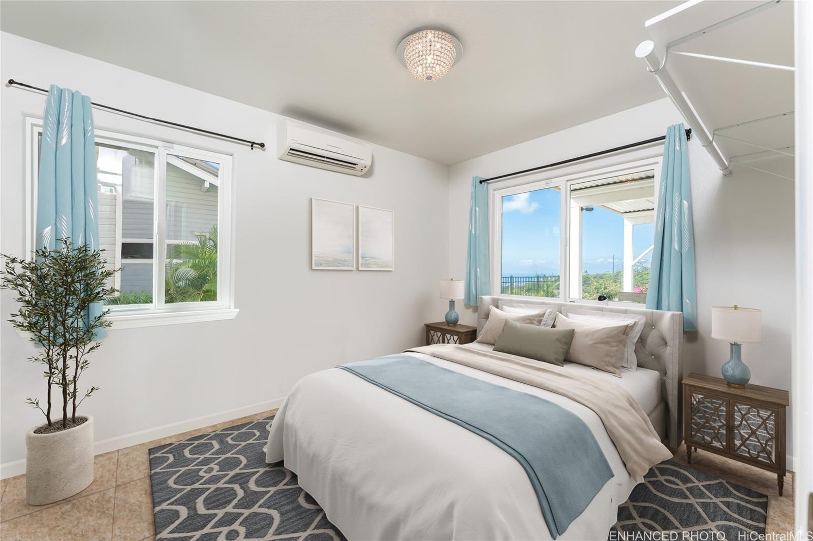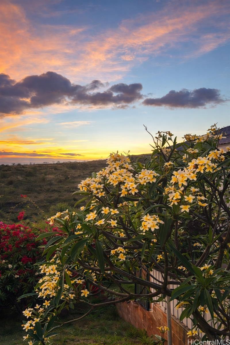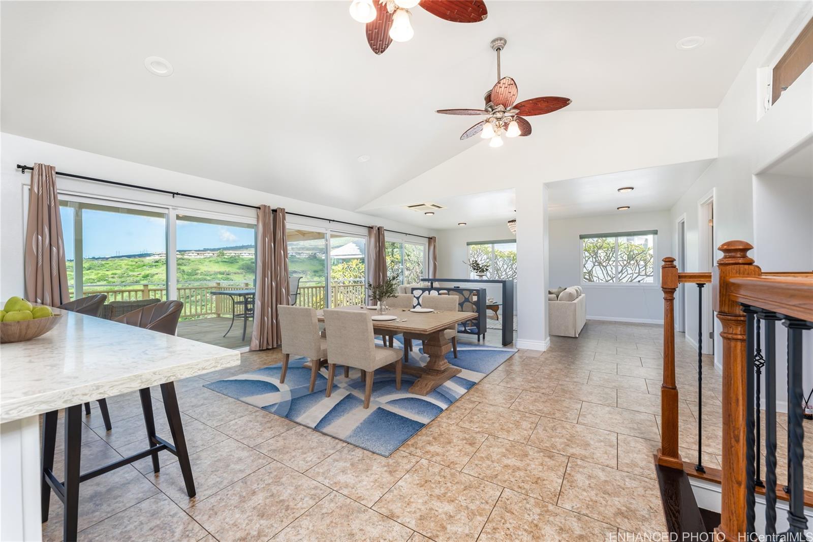 Beautifully upgraded 3bdrm, 3baths, two-story home on a rare perimeter (rim) lot in Makakilo with no rear neighbors. Enjoy panoramic west-facing views of sunsets, the ocean, coastline, and mountains. The main level features a spacious open living area that flows to a large lanai—perfect for indoor-outdoor living and entertaining in Makakilo’s cool breezes. Recent upgrades include a brand-new kitchen with new cabinetry and all-new appliances, fresh interior paint, modern finishes, and a spacious primary bedroom with a large closet. Additional features include porcelain tile flooring, split and ceiling-mounted A/C systems, and 20 leased solar PV panels with the lease paid in full. The system is on HECO Net Energy Metering (NEM), resulting in very low monthly electric costs. Enjoy multiple outdoor spaces, including a large covered main-level lanai, a lower-level patio, and a private backyard, all ideal for gatherings. This rim lot property offers the perfect blend of comfort, privacy, and breathtaking views, conveniently located minutes from Ka Makana Ali’i Mall, H-1 freeway access, restaurants, schools, bus stops and much more! (Some photos have been virtually staged/enhanced)