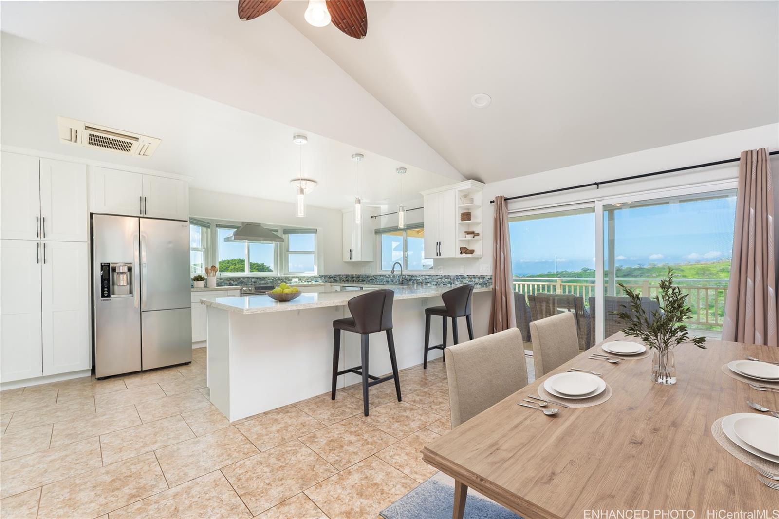 マカキロの希少な周辺(リム)区画に建つ、美しく改装された3ベッドルーム・3バスルームの2階建て住宅。裏手に隣家がありません。 西向きのパノラマビューから、夕日、海、海岸線、そして山々の景色をお楽しみください。 1階には広々としたオープンなリビングエリアがあり、そこから大きなラナイへとつながっています。マカキロの涼しい風を感じながら、屋内と屋外を行き来するライフスタイルや、ゲストをもてなすのに最適です。 最近の改装点としては、新しいキャビネットと最新式の家電を備えた真新しいキッチン、内装の塗り替え、モダンな仕上げ、そして広々とした主寝室と大きなクローゼットが挙げられます。 その他の設備として、磁器タイルの床、スプリット型および天井設置型のエアコン、リース料が全額支払済みの太陽光発電パネル20枚が挙げられます。 このシステムはHECOのネット・エネルギー・メータリング(NEM)を利用しているため、毎月の電気代が非常に安くなっています。 広々とした屋根付きラナイ(1階)、下階のパティオ、そしてプライベートな裏庭など、集まりに最適な複数の屋外スペースをお楽しみいただけます。 このリムロットの物件は、快適さとプライバシー、そして息をのむような絶景が見事に調和しており、カ・マカナ・アリイ・モール、H-1フリーウェイへのアクセス、レストラン、学校、バス停など、あらゆる施設へ数分でアクセスできる便利な立地です!(一部の写真はバーチャルステージングや加工が施されています)。