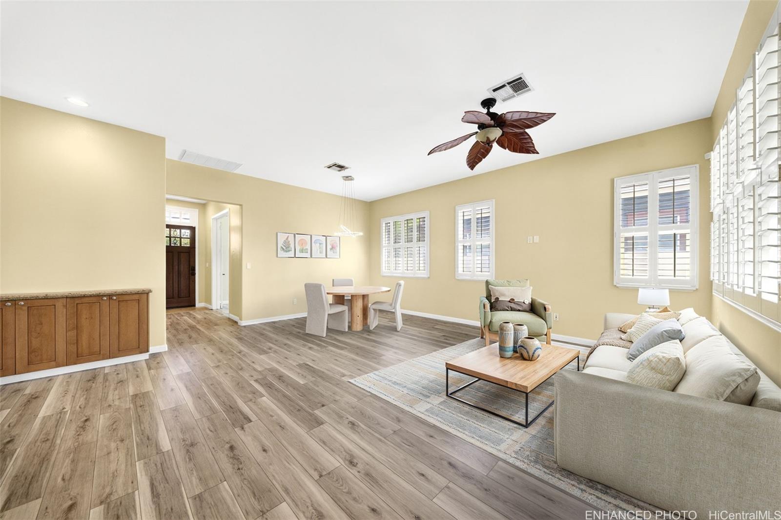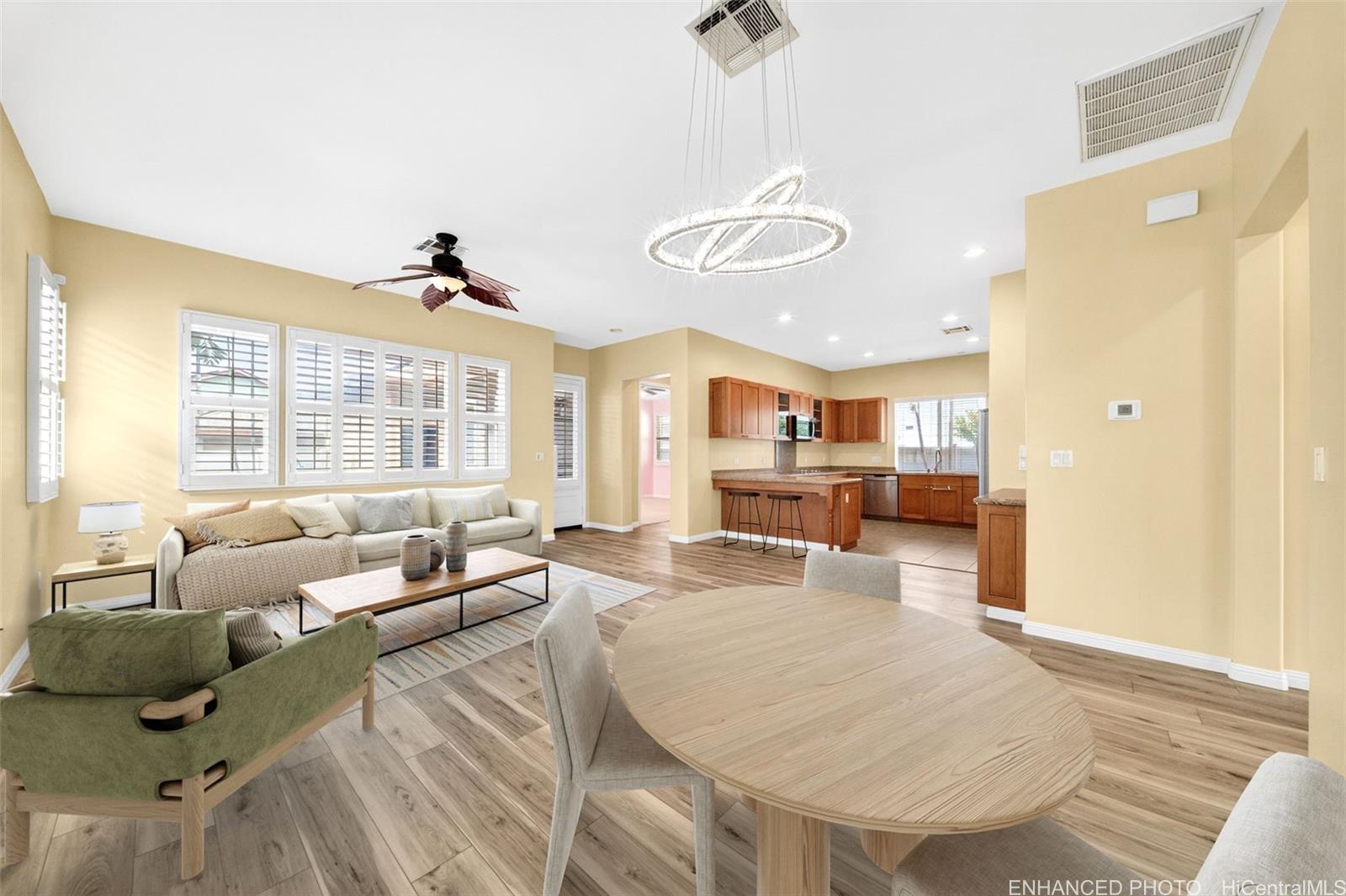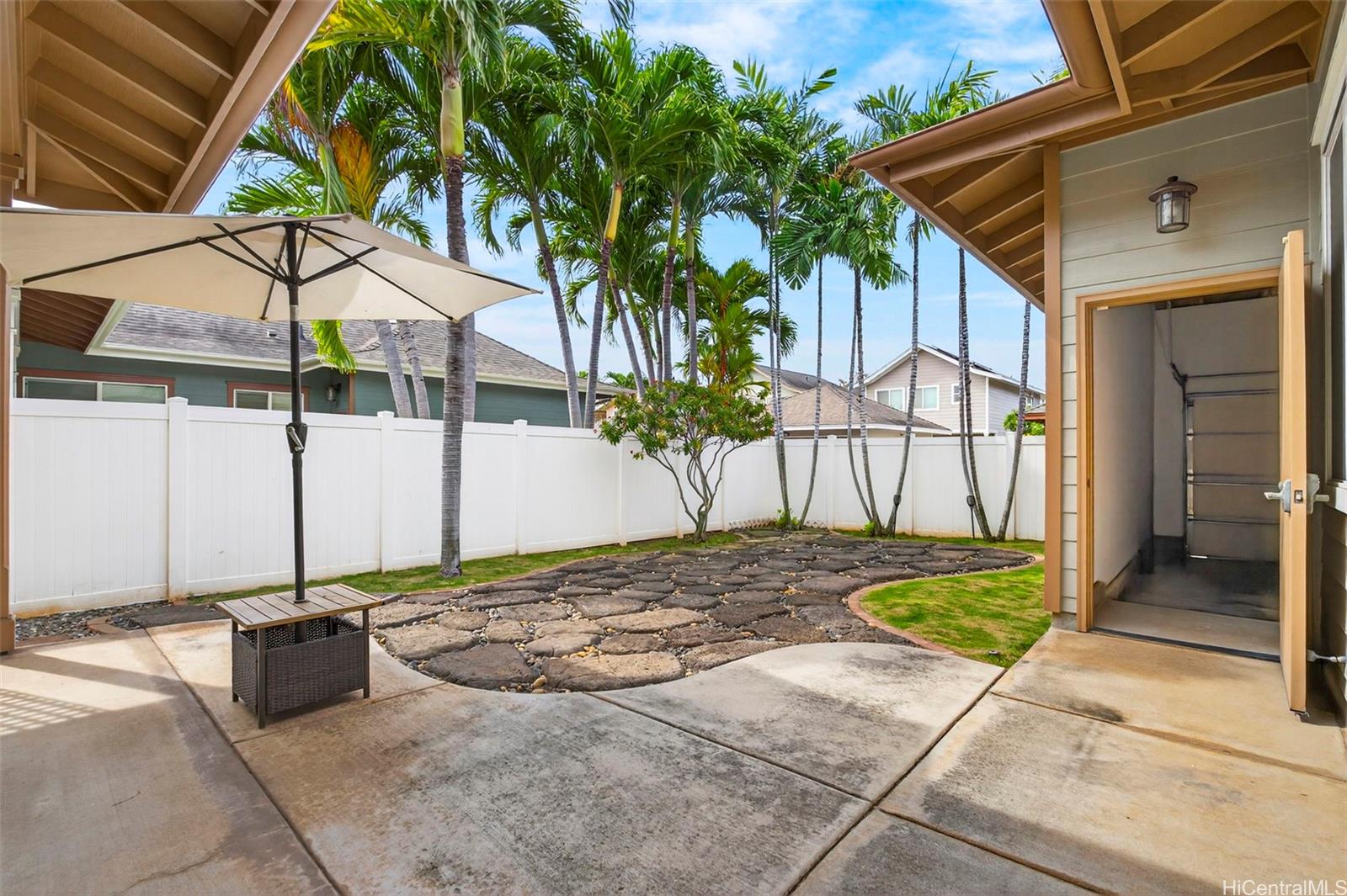 A rare opportunity to own a true single-level residence in Hoakalei – Ka Makana, ideally positioned directly on the park with unobstructed green views and no parked vehicles disrupting your frontage.This well maintained 3-bedroom, 2-bathroom home features high ceilings and an open-concept layout create bright, modern island living. Upgrades include fresh interior and exterior paint, upgrade living room flooring and molding, updated lighting, stainless steel appliances with newer microwave, full glass shower enclosure, and replaced water heater.Energy efficiency shines with 24 owned PV panels and solar water heater, significantly reducing electricity costs. Security alarm system installed. Central A/C fully serviced April 2025.Spend weekends at the community pool and BBQ pavilions or explore beaches and golf near Hoakalei Country Club. Shopping, dining, and movie nights are just minutes away at Ka Makana Ali’i. Contact your agent to schedule a private showing today. Opportunities like this rarely remain available for long.