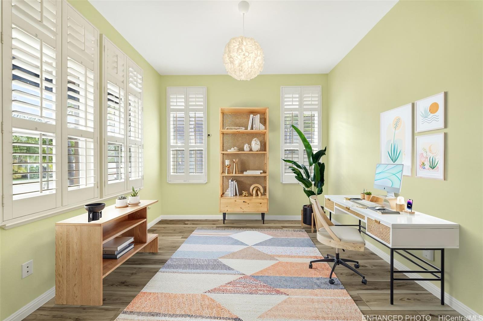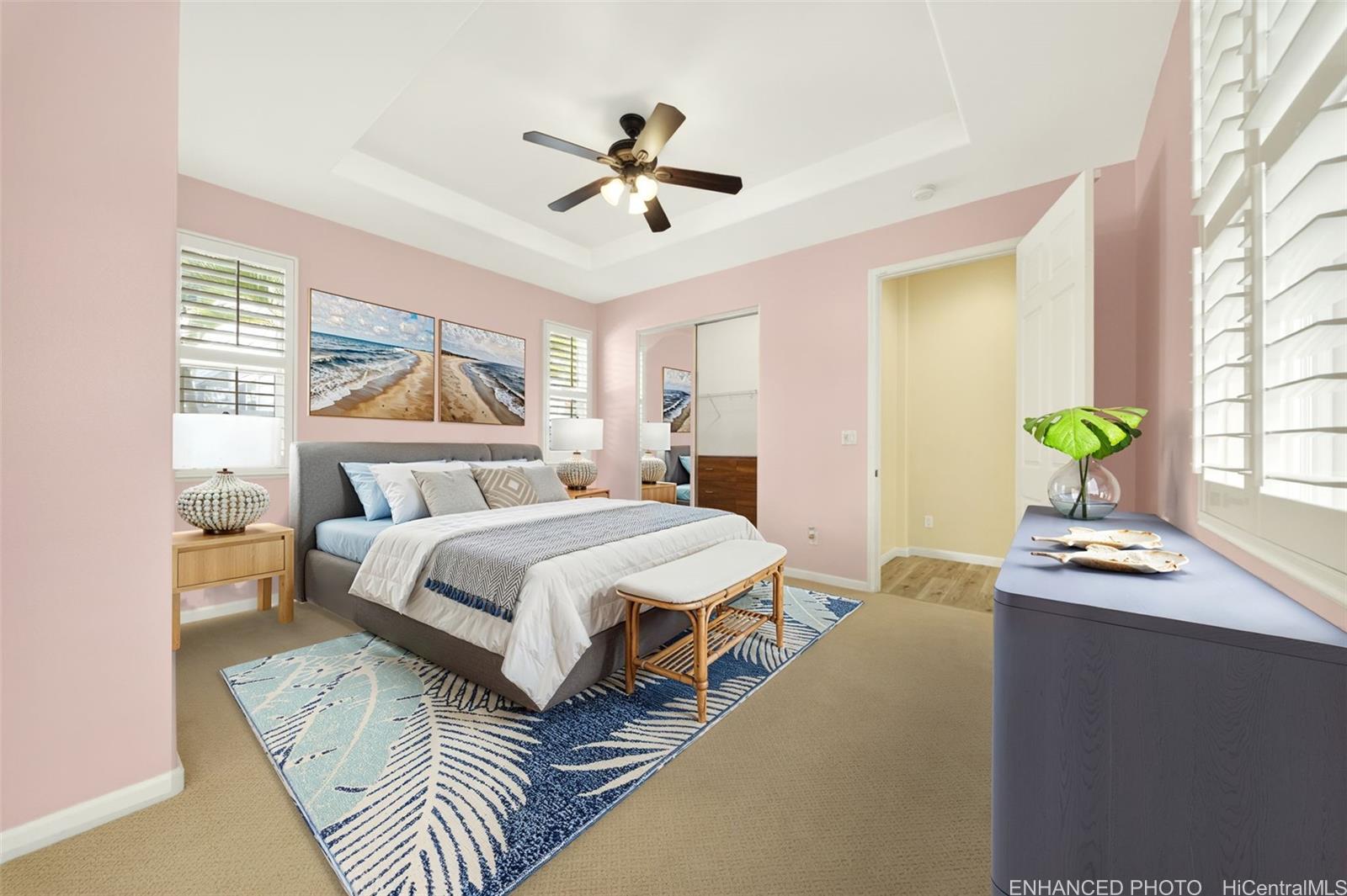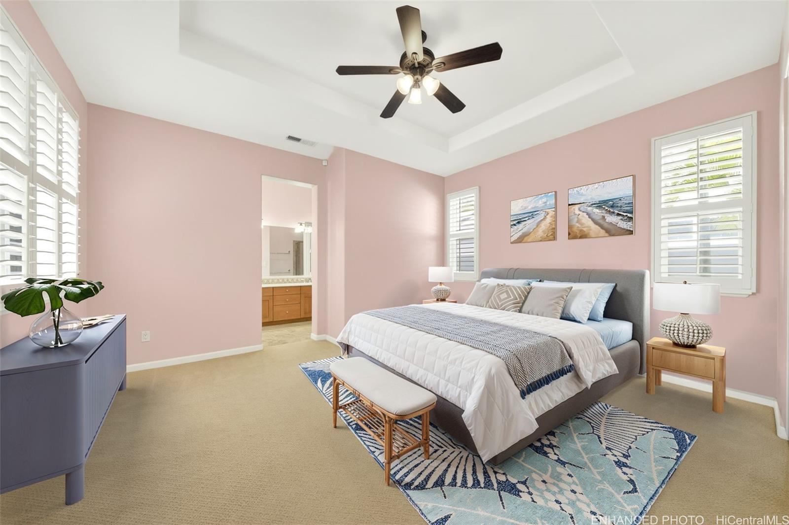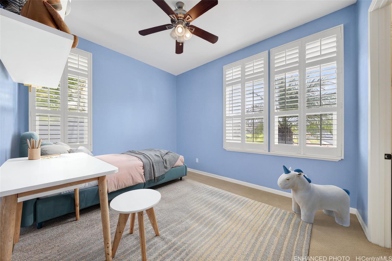 A rare opportunity to own a true single-level residence in Hoakalei – Ka Makana, ideally positioned directly on the park with unobstructed green views and no parked vehicles disrupting your frontage.This well maintained 3-bedroom, 2-bathroom home features high ceilings and an open-concept layout create bright, modern island living. Upgrades include fresh interior and exterior paint, upgrade living room flooring and molding, updated lighting, stainless steel appliances with newer microwave, full glass shower enclosure, and replaced water heater.Energy efficiency shines with 24 owned PV panels and solar water heater, significantly reducing electricity costs. Security alarm system installed. Central A/C fully serviced April 2025.Spend weekends at the community pool and BBQ pavilions or explore beaches and golf near Hoakalei Country Club. Shopping, dining, and movie nights are just minutes away at Ka Makana Ali’i. Contact your agent to schedule a private showing today. Opportunities like this rarely remain available for long.