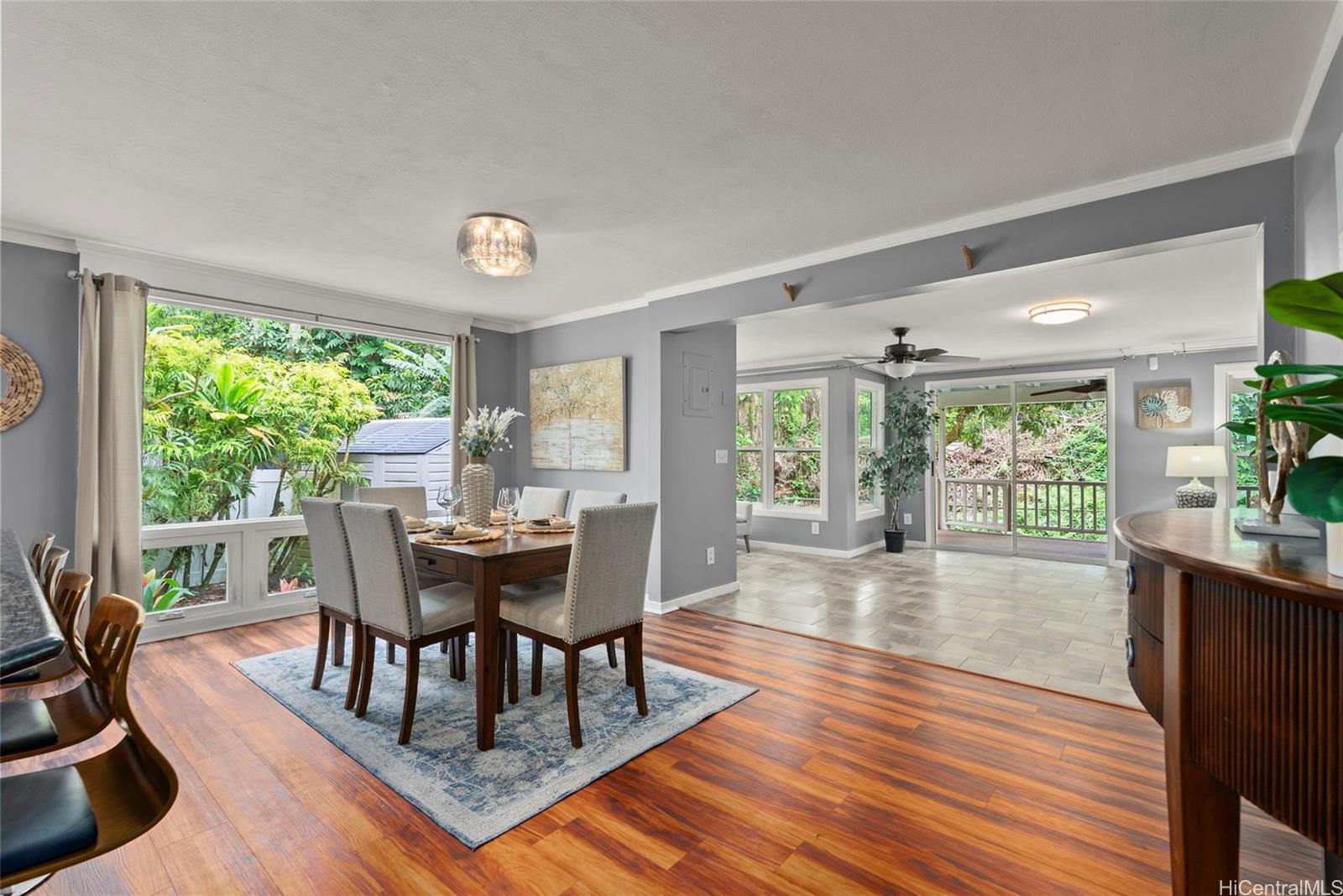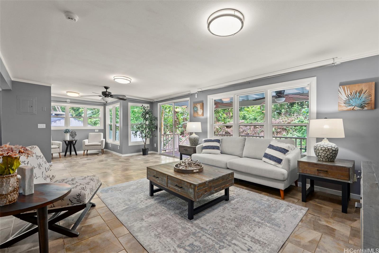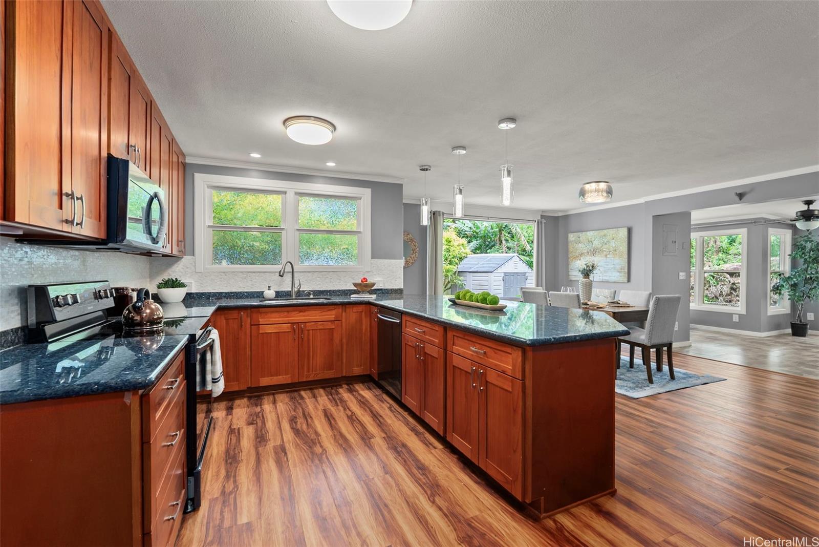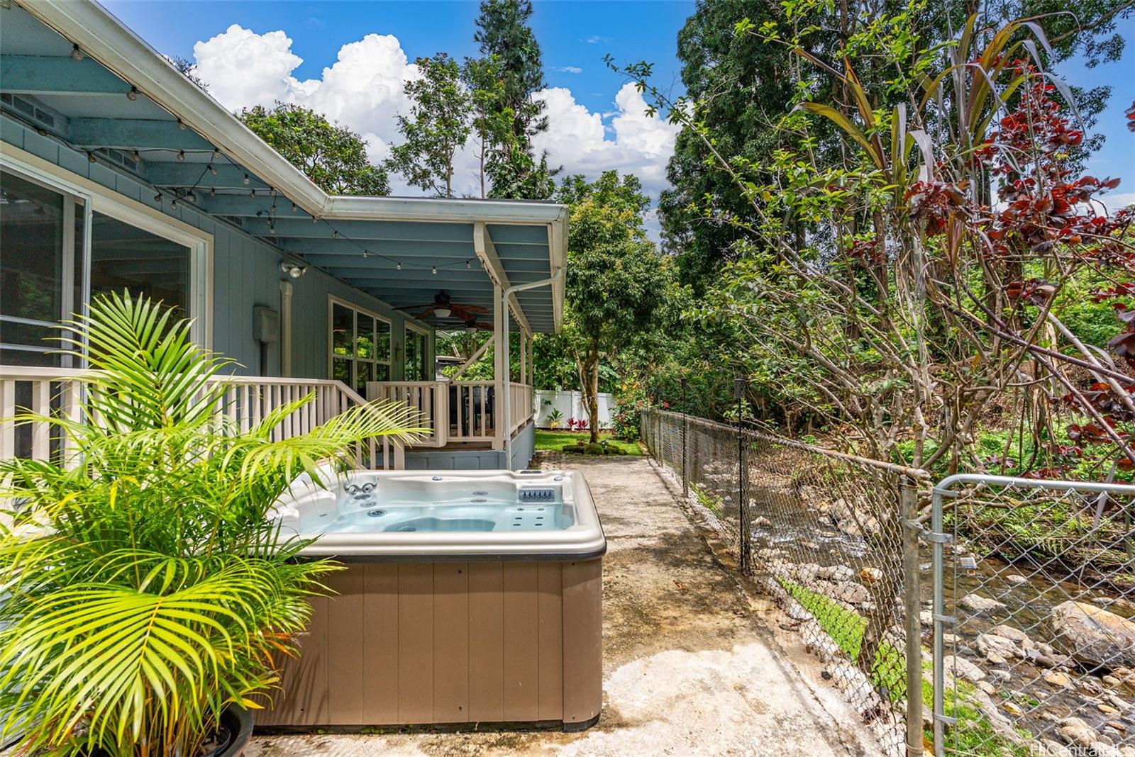 Tucked away at the end of a quiet cul-de-sac and surrounded by lush natural beauty, this private single-level 3-bedroom, 2-bath home offers a true island oasis at the base of the Koolau Mountains in Ahuimanu. A gentle stream just beyond the property adds to the peaceful ambiance, creating a serene and secluded retreat you’ll love coming home to.Step inside to a spacious open floor plan designed for easy living and effortless entertaining. The fully renovated kitchen features granite countertops, updated cabinetry, and stainless-steel appliances, while both bathrooms have been tastefully upgraded with modern finishes and large walk-in showers.The living room and primary bedroom both open to a generous covered lanai overlooking a lush, wooded backyard—your own private sanctuary perfect for relaxing or gathering with friends and family. Enjoy the best of indoor-outdoor island living with a pool, hot tub, and open-air outdoor shower, all set within this tranquil backyard escape.Adding to the charm, the property includes on above ground pool, hot tub and over 10 varieties of fruit-bearing trees, enhancing the feeling of your very own tropical retreat.