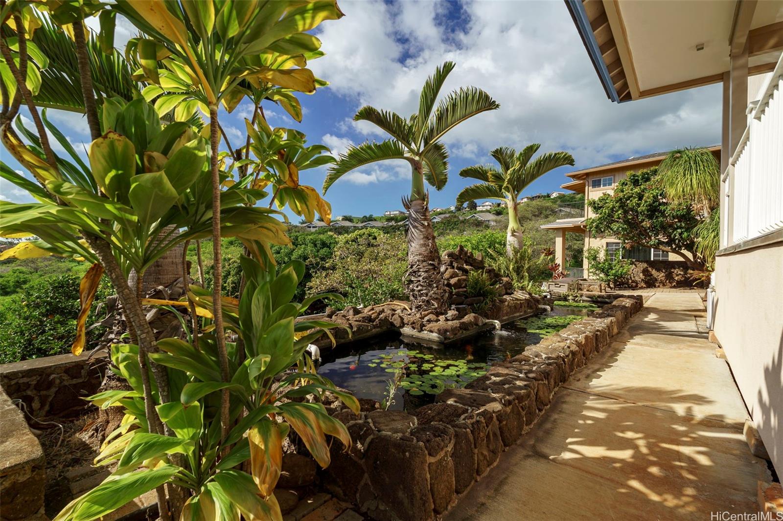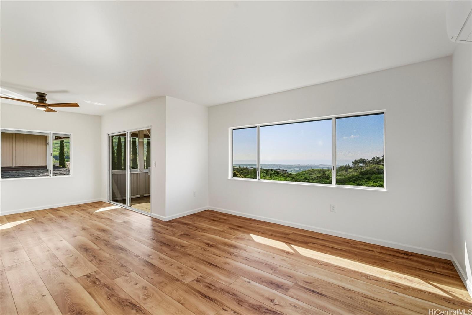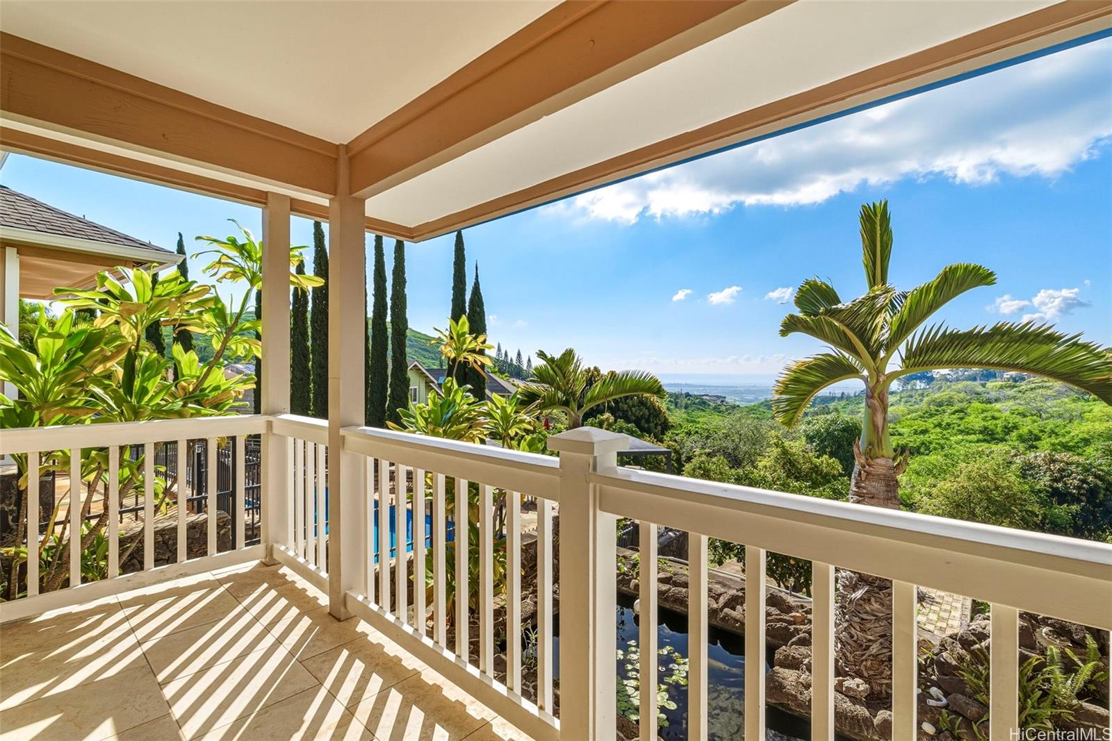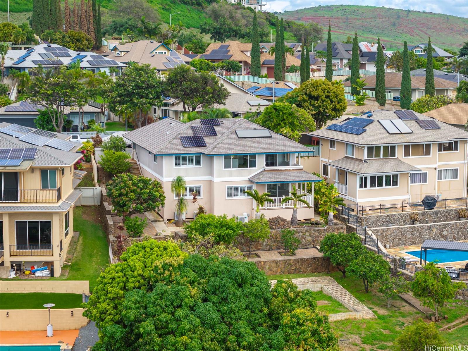 WOW, WHAT A VIEW! Breathtaking ocean vistas from every room of this 3-bedroom, 2.5-bath, perimeter lot home in Upper Makakilo. The chef’s kitchen impresses with a Sub-Zero refrigerator, massive island, outdoor-venting range, microwave, and a wine fridge. Split AC in all main rooms and bedrooms. 18-panel owned PV system and battery backup keep utility costs manageable. Enjoy the flexible bonus room as a home office, guest area, or creative space. Start your mornings on the back lanai with coffee and ocean breezes or host unforgettable dinners on the front lanai under the stars. The upper terrace features a serene koi pond above 18 fruit trees in and just beyond the backyard, including orange, mango, avocado, lime, pomegranate, pomelo, and tangerine. A gardener’s dream, the property includes a foundation already in place for a future greenhouse. Storage abounds with a garage tool area, multiple linen closets upstairs and downstairs, an under-the-stairs closet, and an impressive ~310 sq. ft. bonus storage room accessible from the side of the home. HOA $83.29/yr. VA buyers may assume the 2.375% loan with ~$886k balance. Secondary financing *might* be avail. Schedule a showing today!