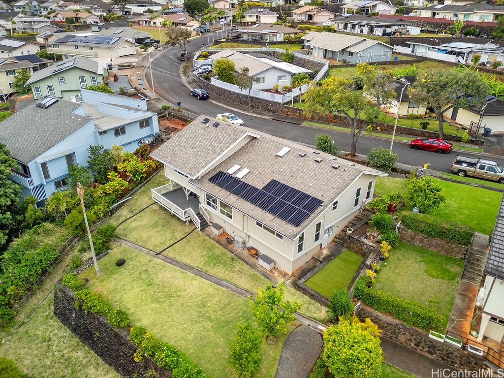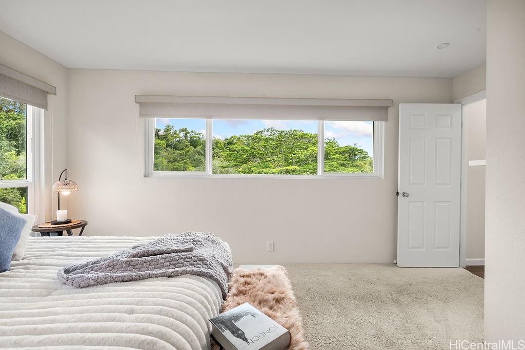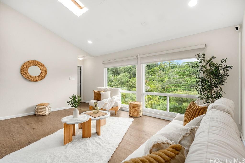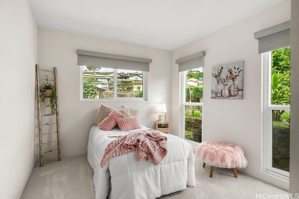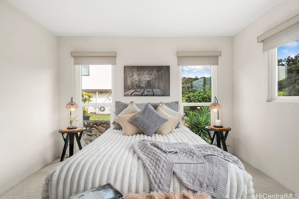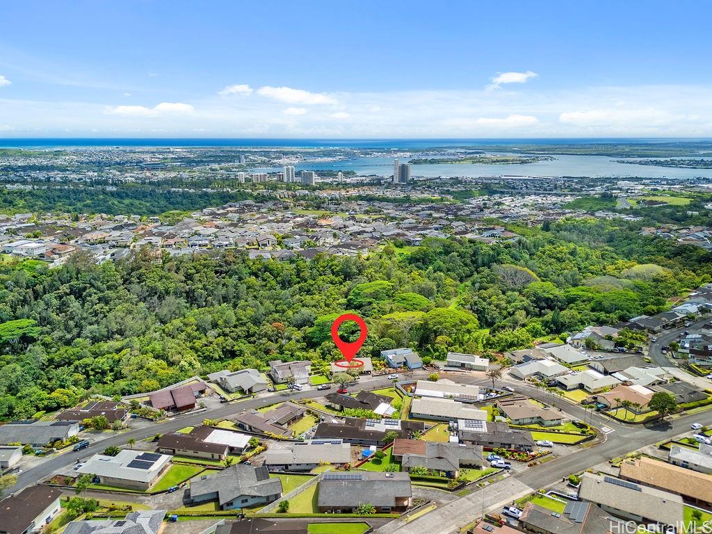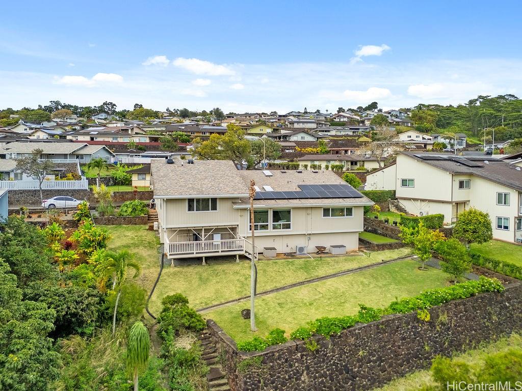 Peaceful and private retreat, lined with lush greenery, welcomes you home to Newtown Estates! This updated 3 bedroom, 2.5 bath home, on a large rim lot, features two spacious living areas with vaulted ceilings, skylights and large picture windows taking in plenty of natural light. Also included are split A/C in each room, an owned Photovoltaic System with Tesla battery and a bonus storage room with additional storage areas in the attic space as well as below the home. The primary living area, with 2 bedrooms, full bath, kitchen, living room and laundry, is located on the street/carport level for easy accessibility. Conveniently located near Pearlridge Center, hospitals, restaurants and military bases. Don’t miss this opportunity to experience the serenity of island hillside living!